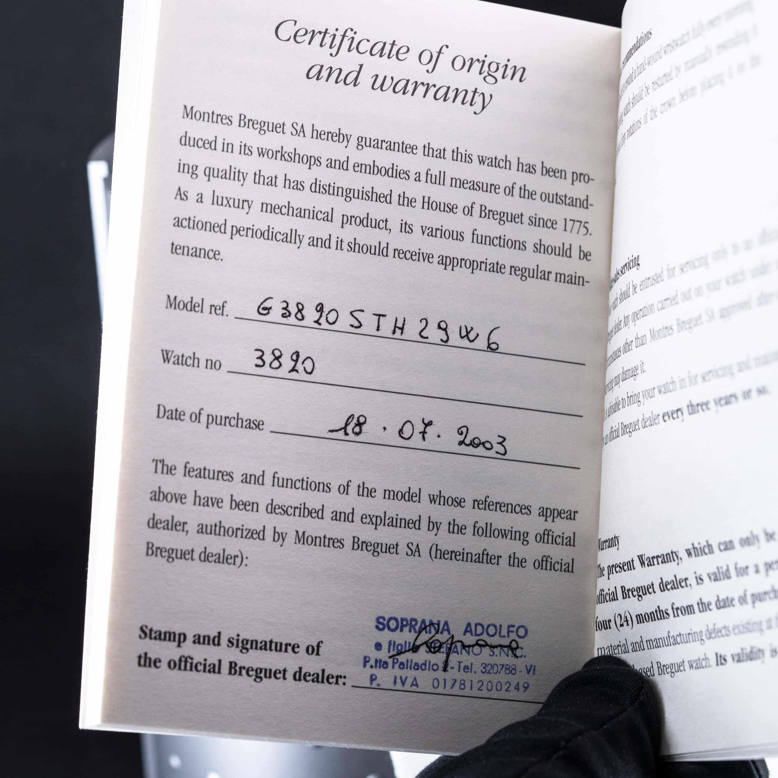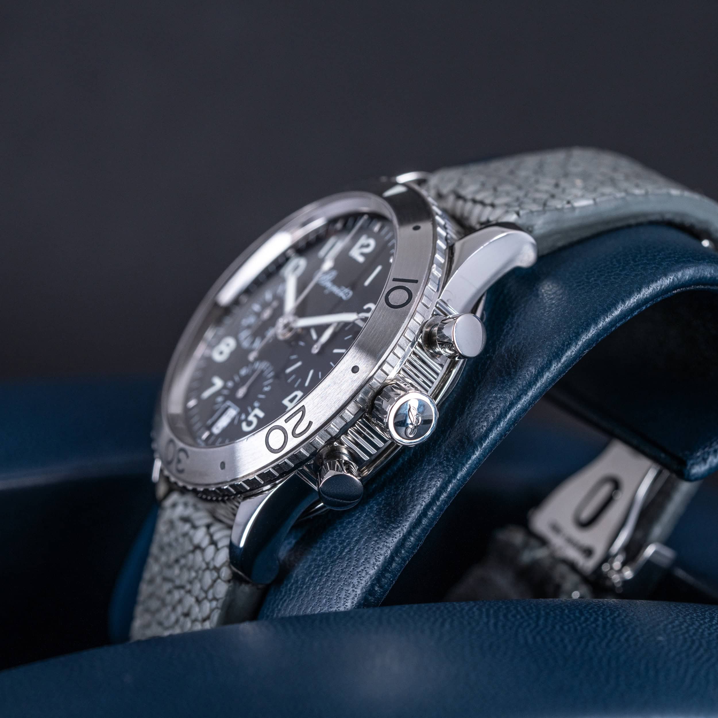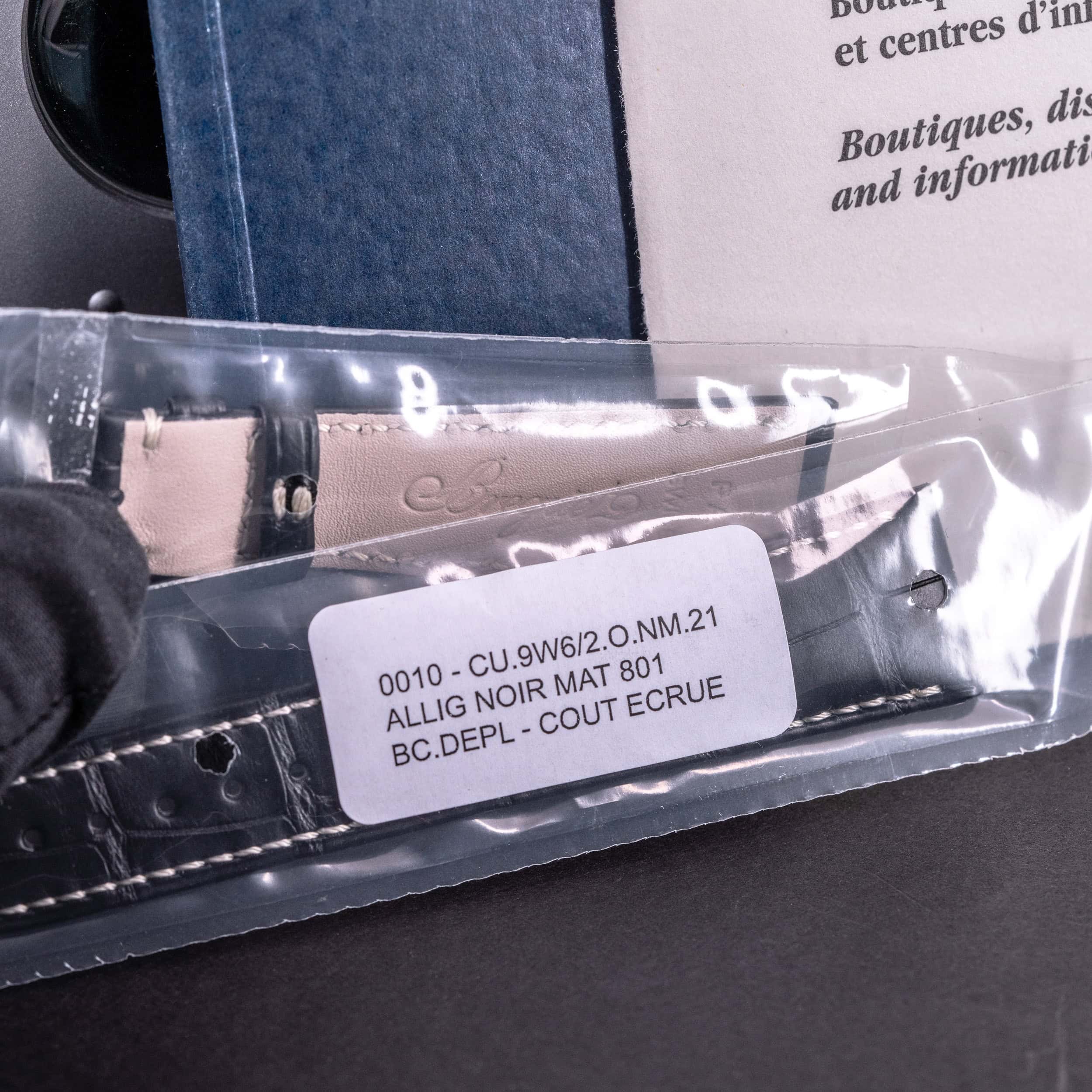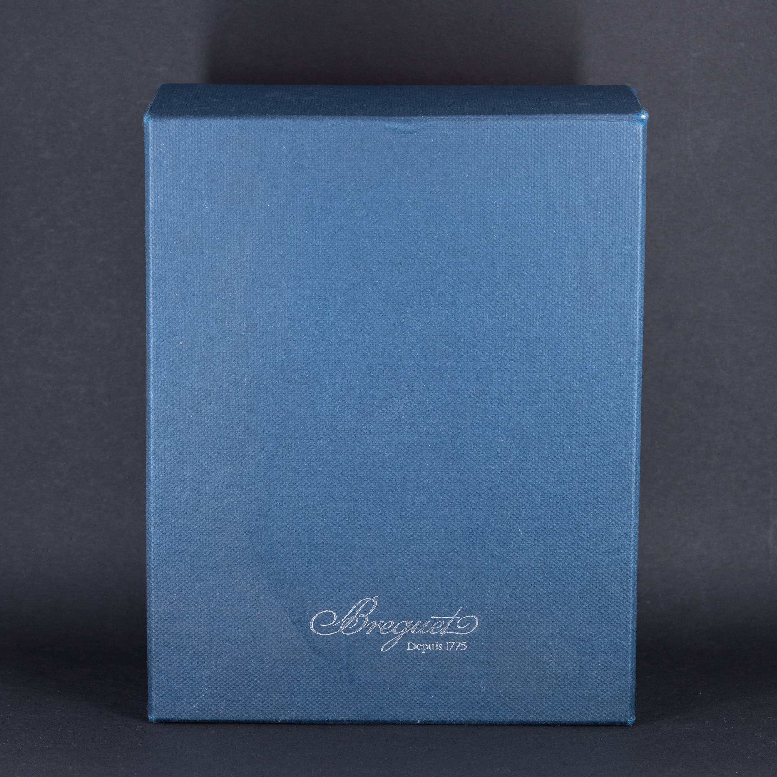 Kellossa on siniharmaa rauskunnahka ranneke Breguetin alkuperäisellä soljella. Mukana tulee myös uusi ja käyttämätön Breguetin oma alligaattori nahkaranneke.