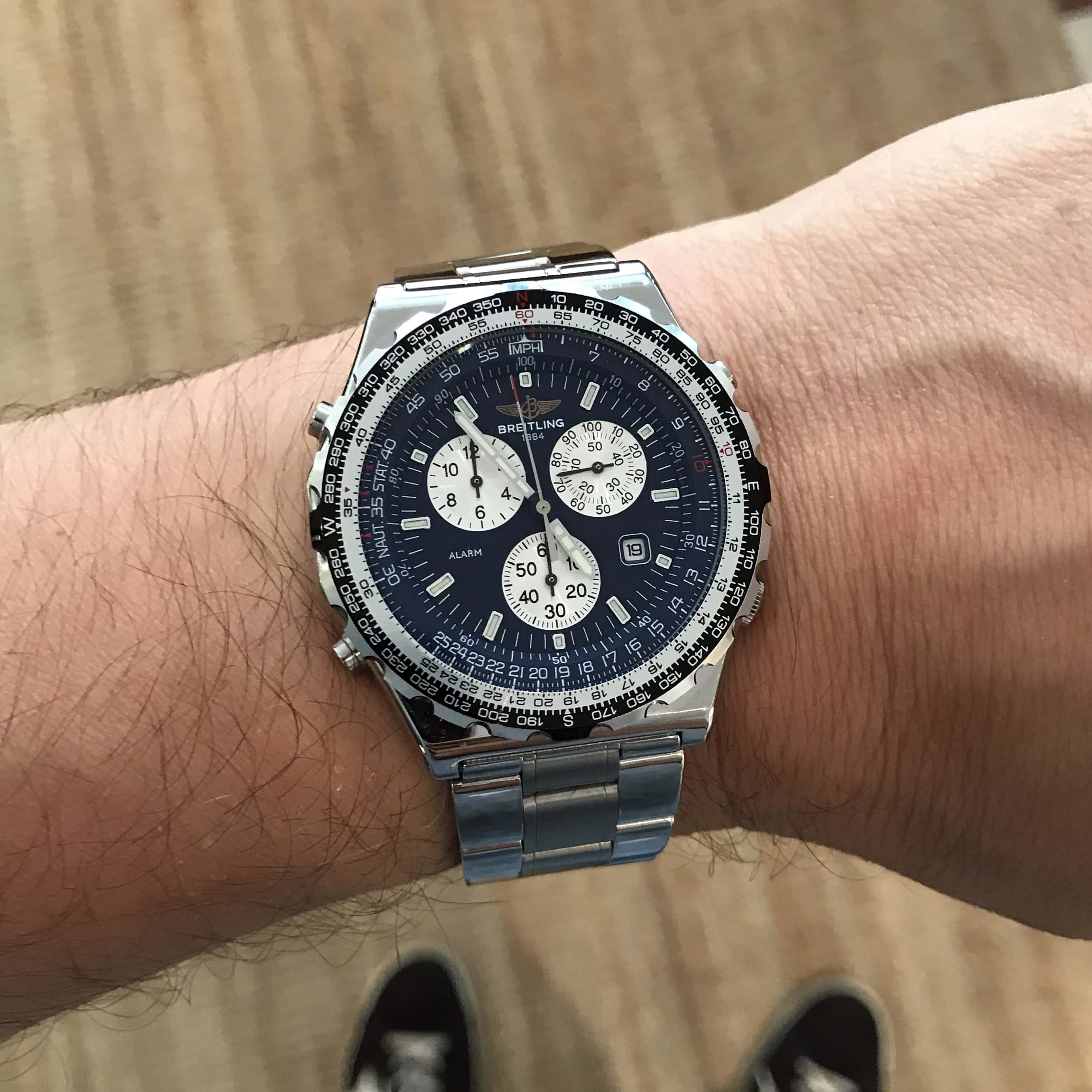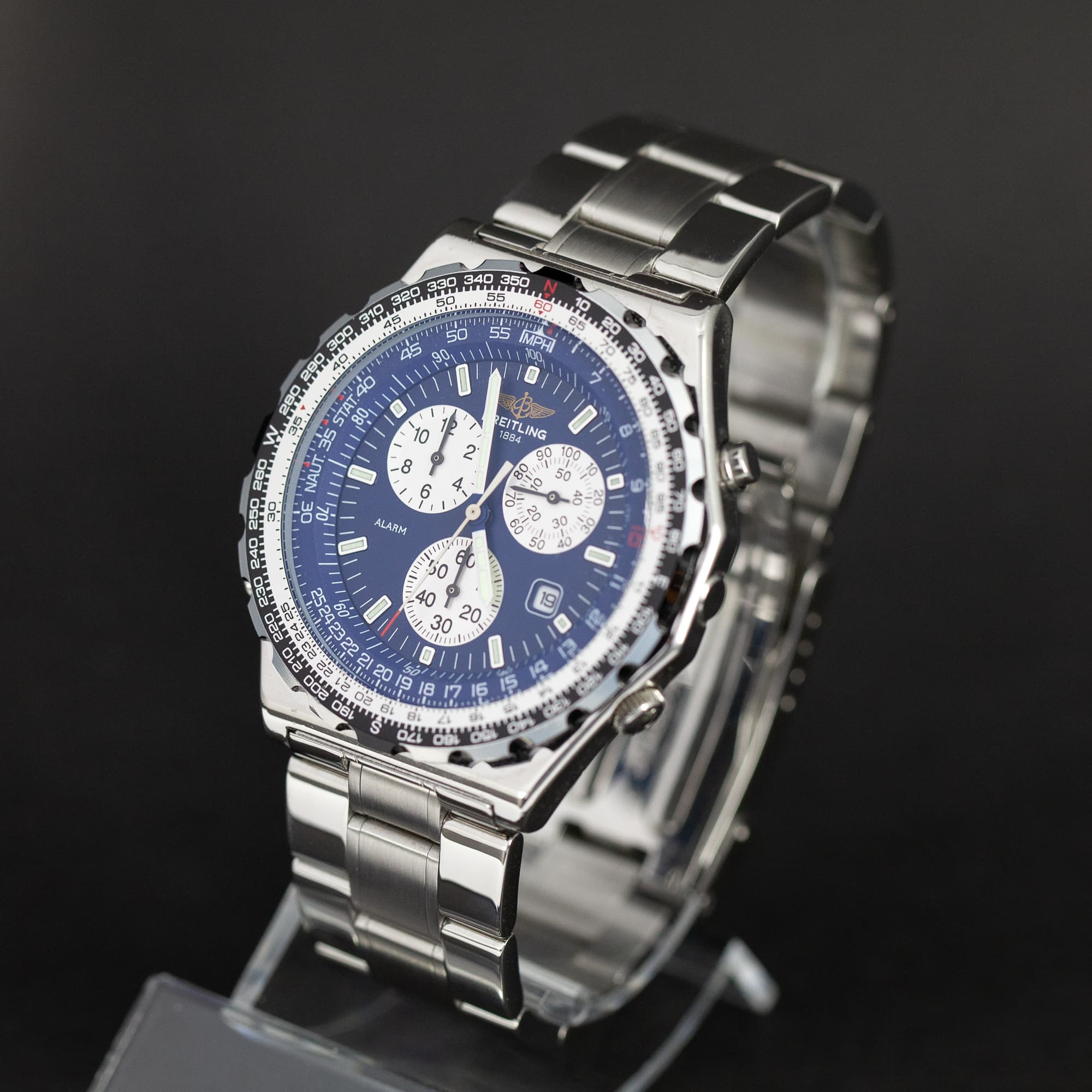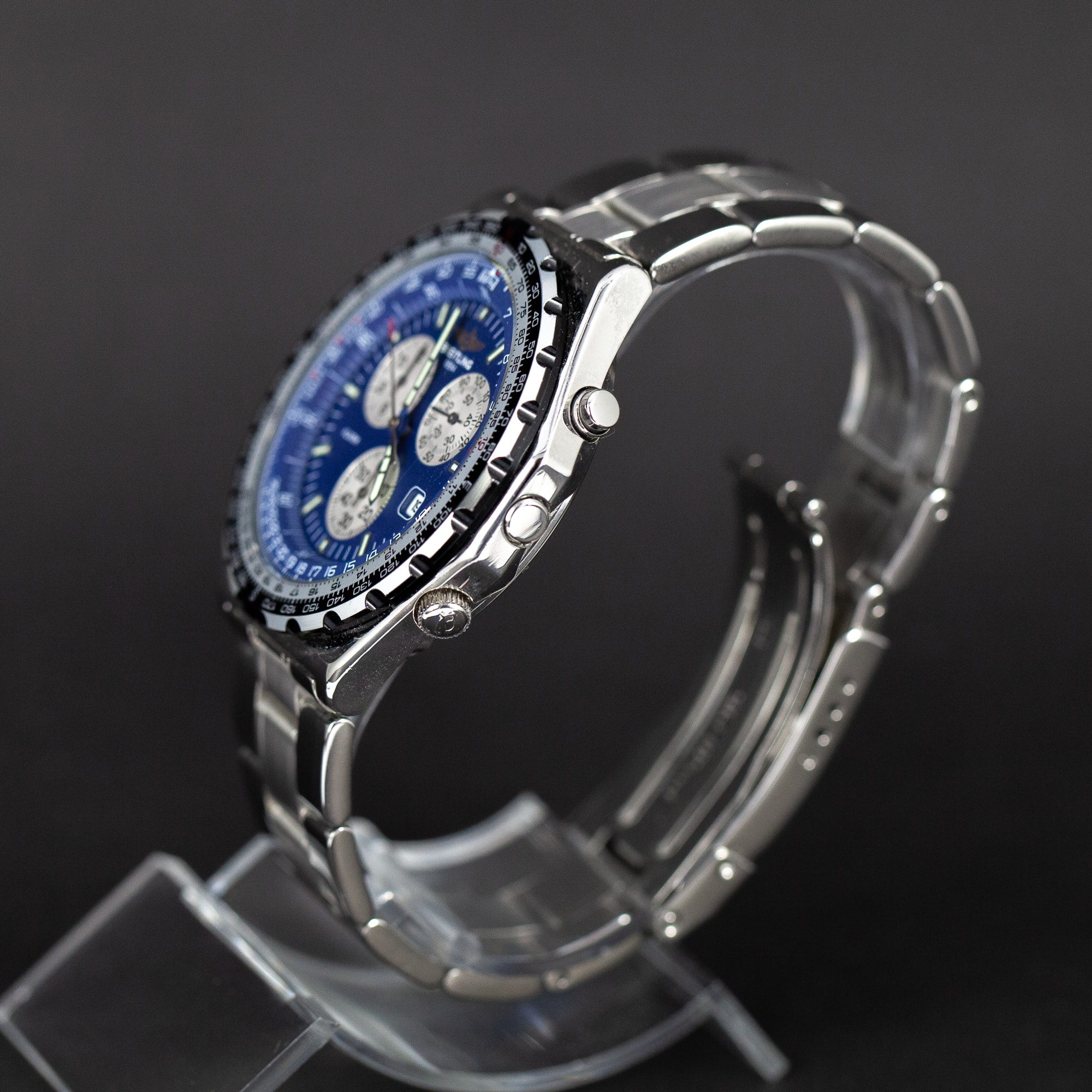 Breitling Jupiter Pilot kronografi n. vuodelta 1995-1998. Ref. A59028. Sn. 23707. Erittäin hyväkuntoinen yksilö sinisellä kellotaululla. Safiirilasi ja kvartsikoneisto. Kellonajan lisäksi koneistossa on päivyri ja herätysmekanismi. Alkuperäinen Breitlingin teräsranneke. Kuoren koko on 42mm. Ei laatikkoa/papereita.