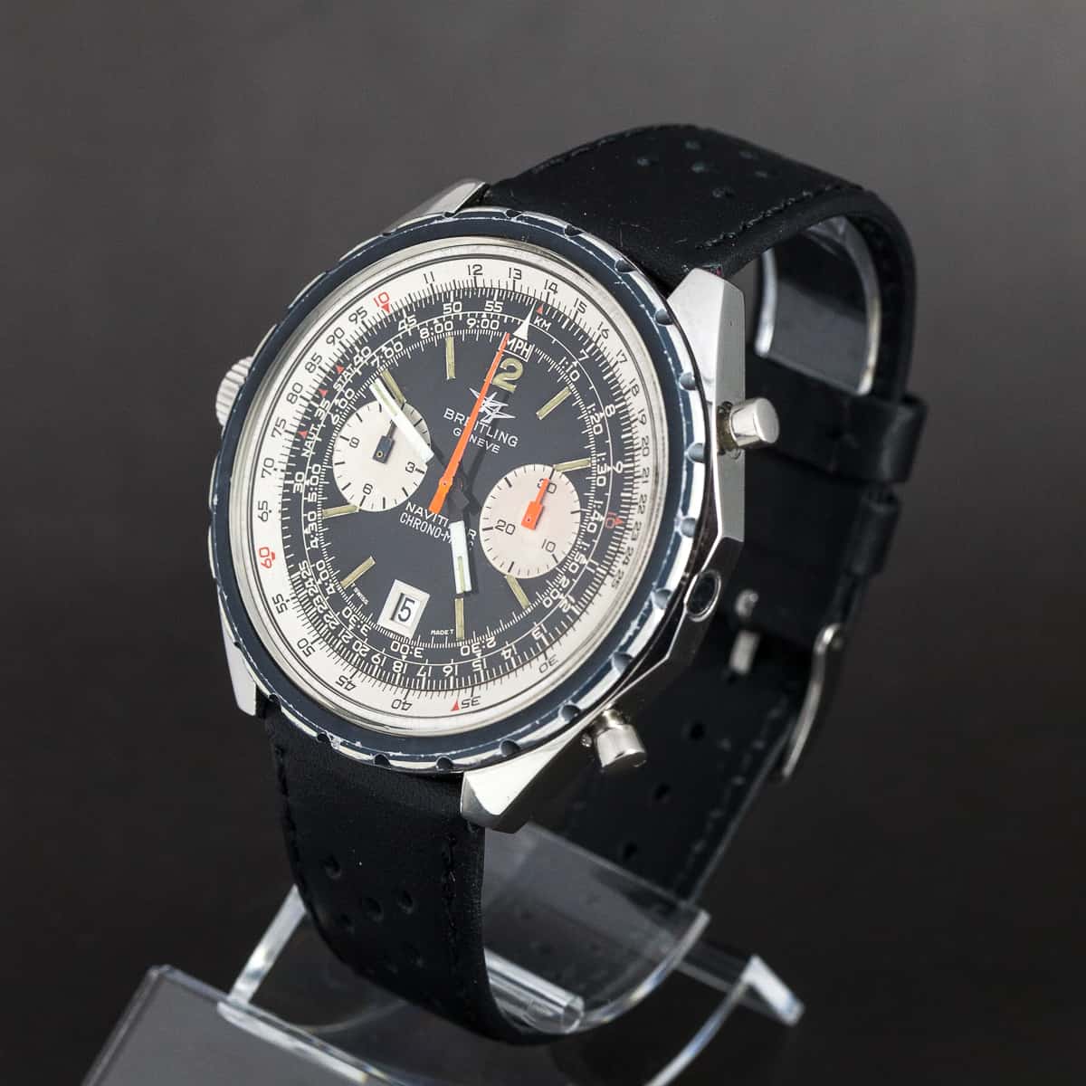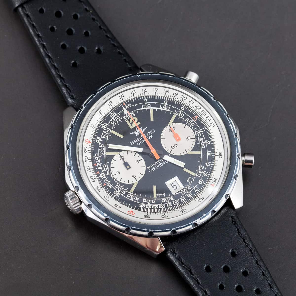 Breitling Navitimer Chrono-Matic ”big case” ref.1806 vuodelta 1969. Sarjanumero on 1255758. Breitling cal.11 (Heuer-Breitling-Buren) automaatti kronografikoneisto on juuri täysin kunnostettu. Erittäin hyväkuntoinen ja täysin alkuperäinen kokonaisuus. Kuoren koko 48mm. Ranneke on käsin ommeltu Italailainen racing-nahkaranneke.