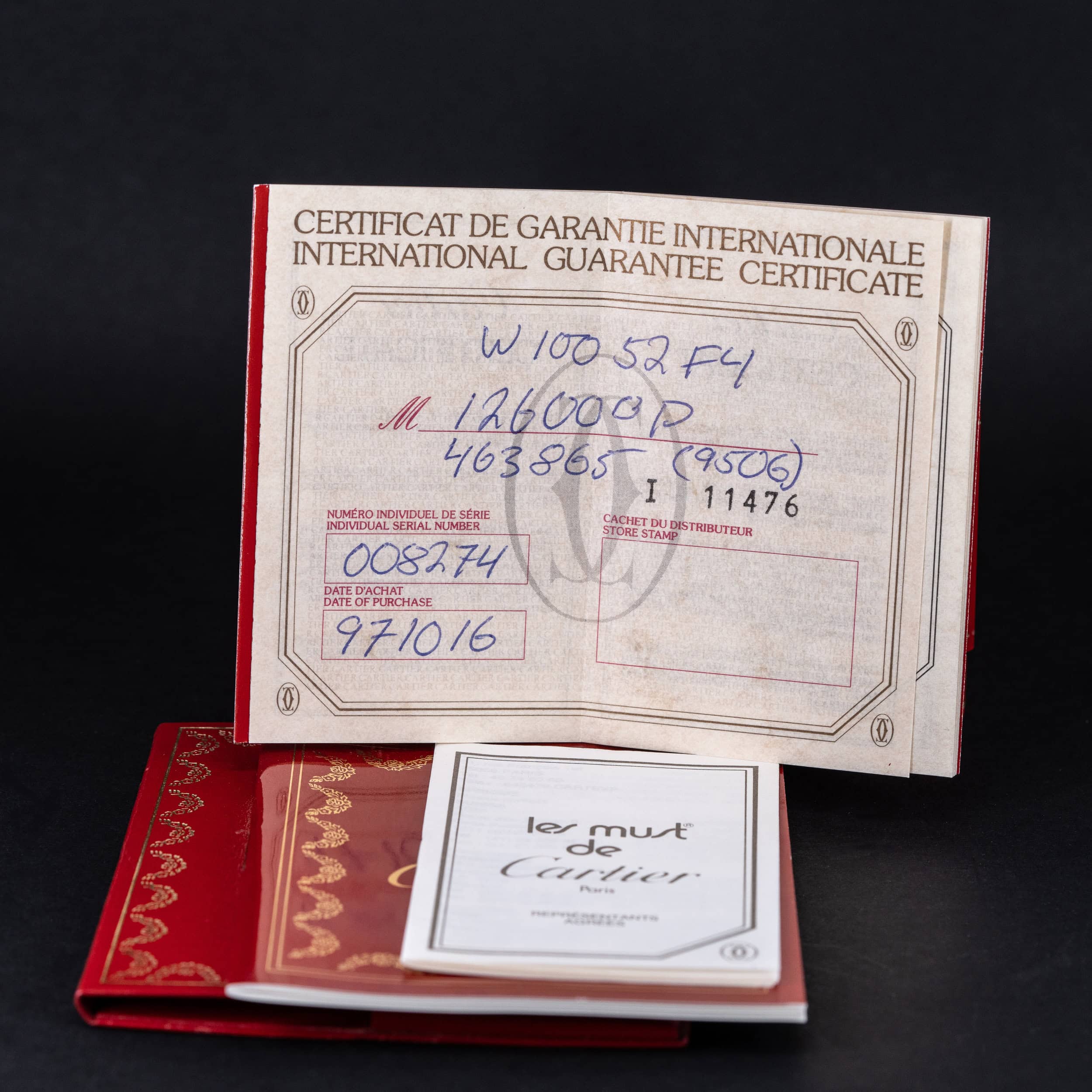 Kellon mukana tulee alkuperäinen Cartierin laatikko, dokumenttikotelo, takuuvihko, käyttöohje ja myyntiverkosto esite. Kello on alun perin ostettu 16.10.1997.