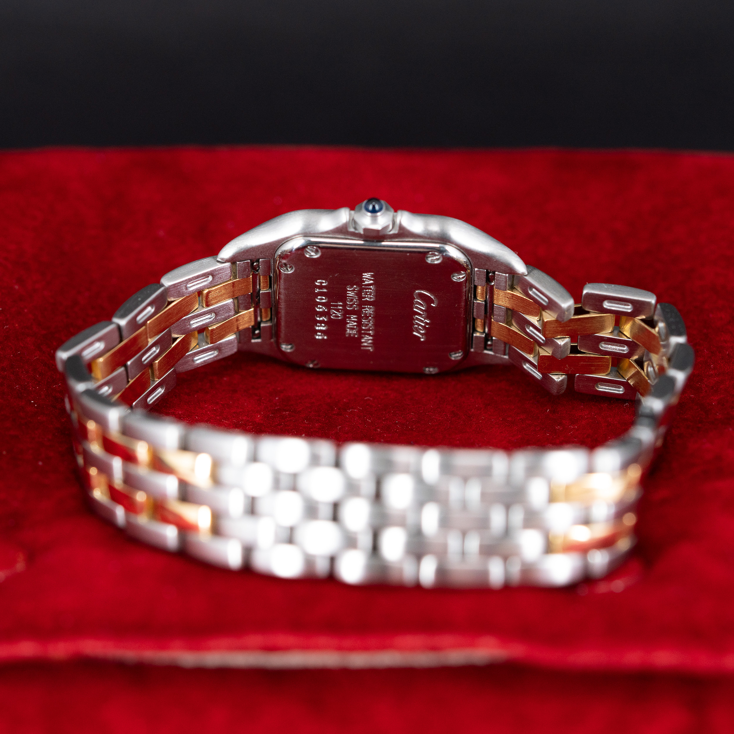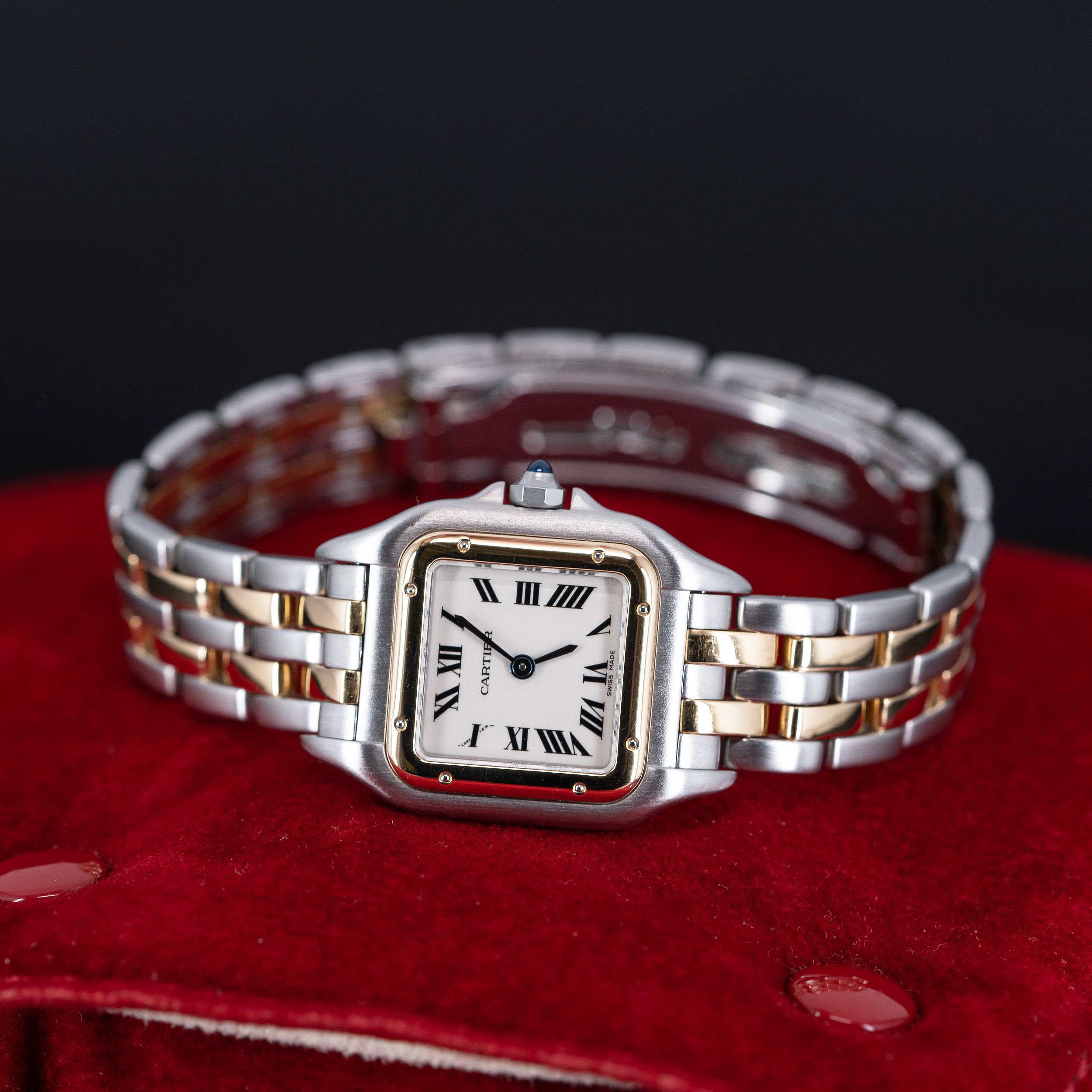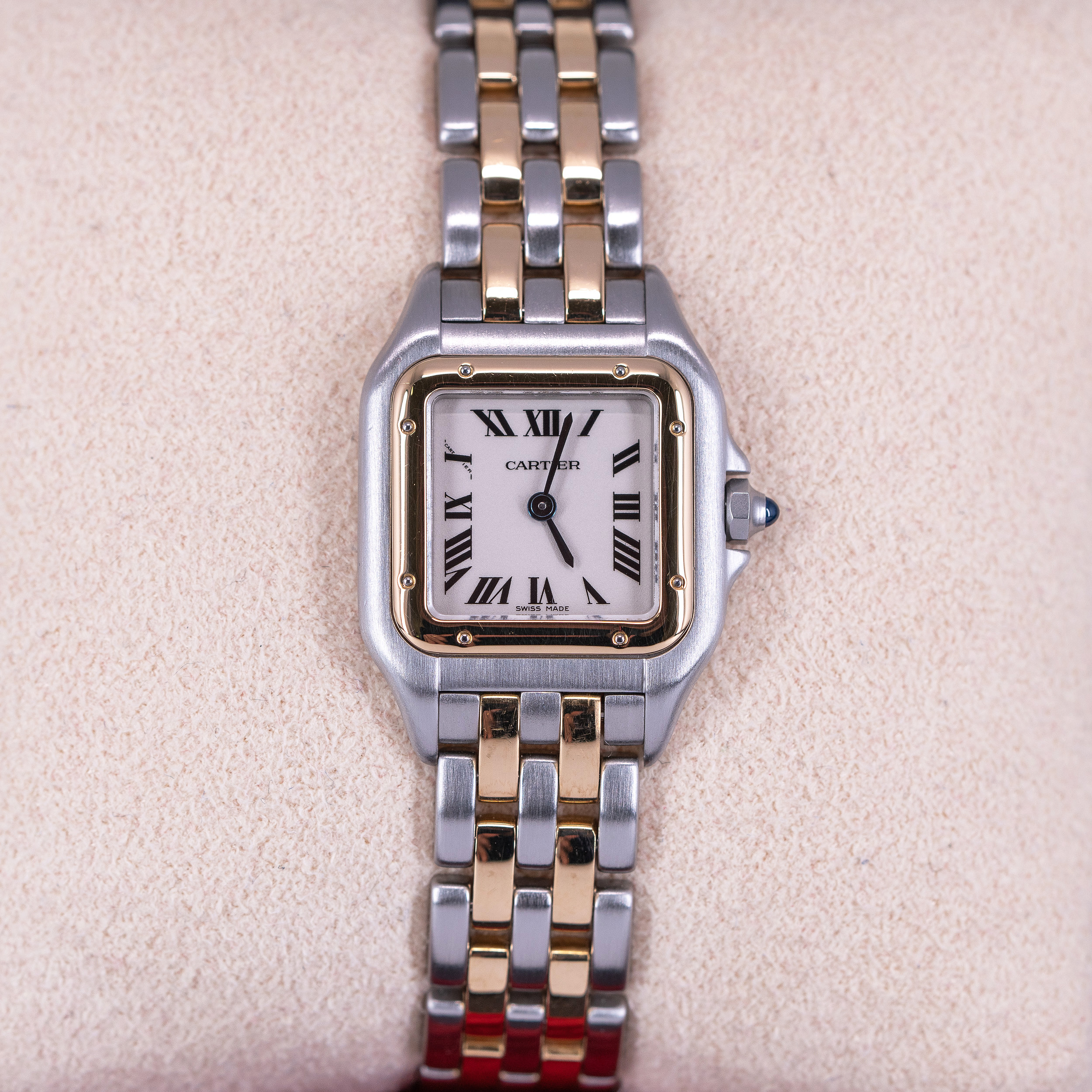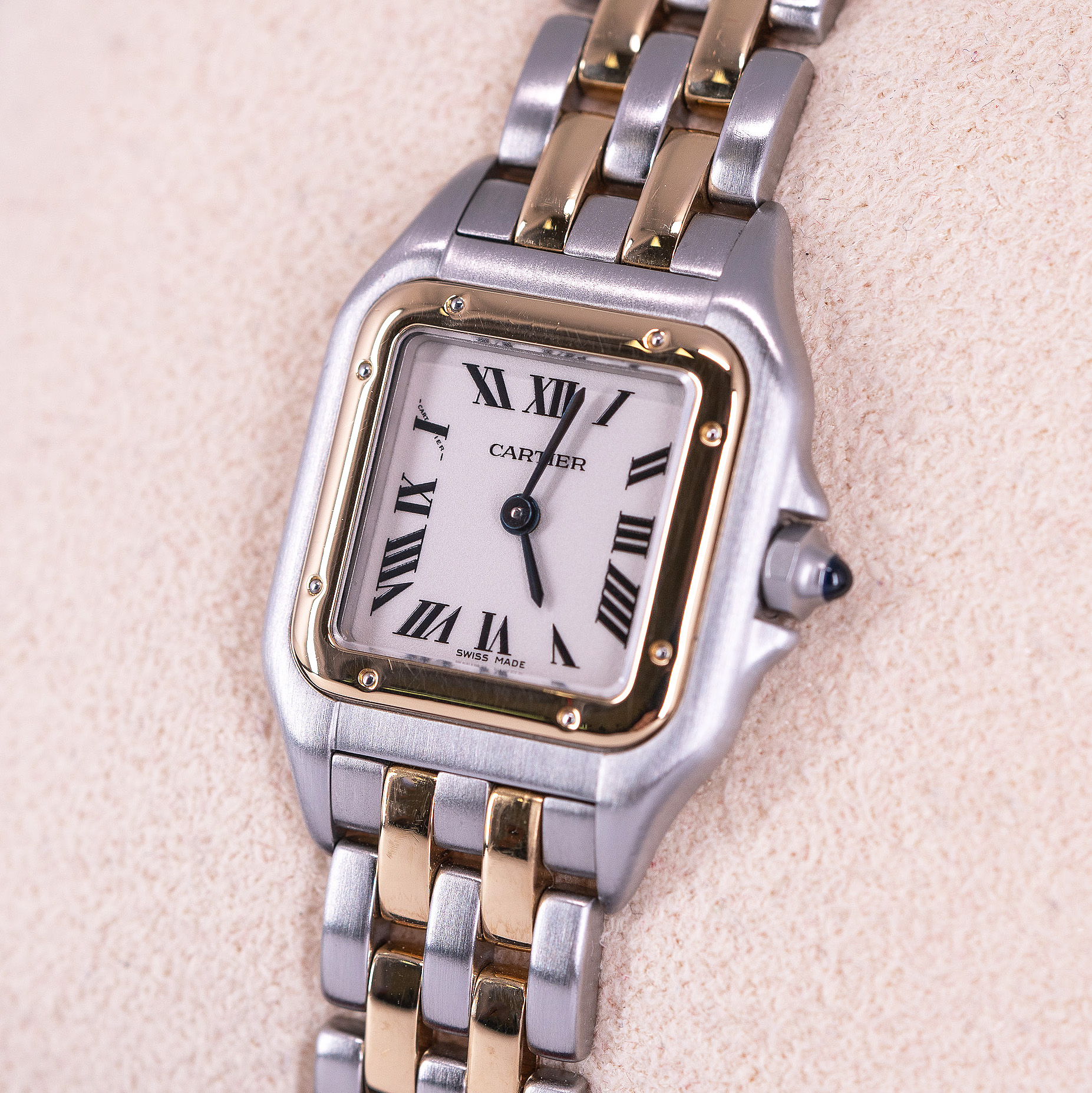 Kaunis Cartier Panthère naisten rannekello vuodelta 1995. Kellossa on kaunis vaalea kellotaulu roomalaisilla numeroilla ja sinistetyillä osoittimilla. 18k kulta-teräs kuori ja two-row Panthère-ranneke on hienossa kunnossa. Huollettu ja roiskevesitiivis rakenne sopii hyvin jokapäiväiseen käyttöön.  Kuori on yhä roiskevesitiivis, testattu +3.0/-0,4bar. Kuoren koko on 22 × 30mm.