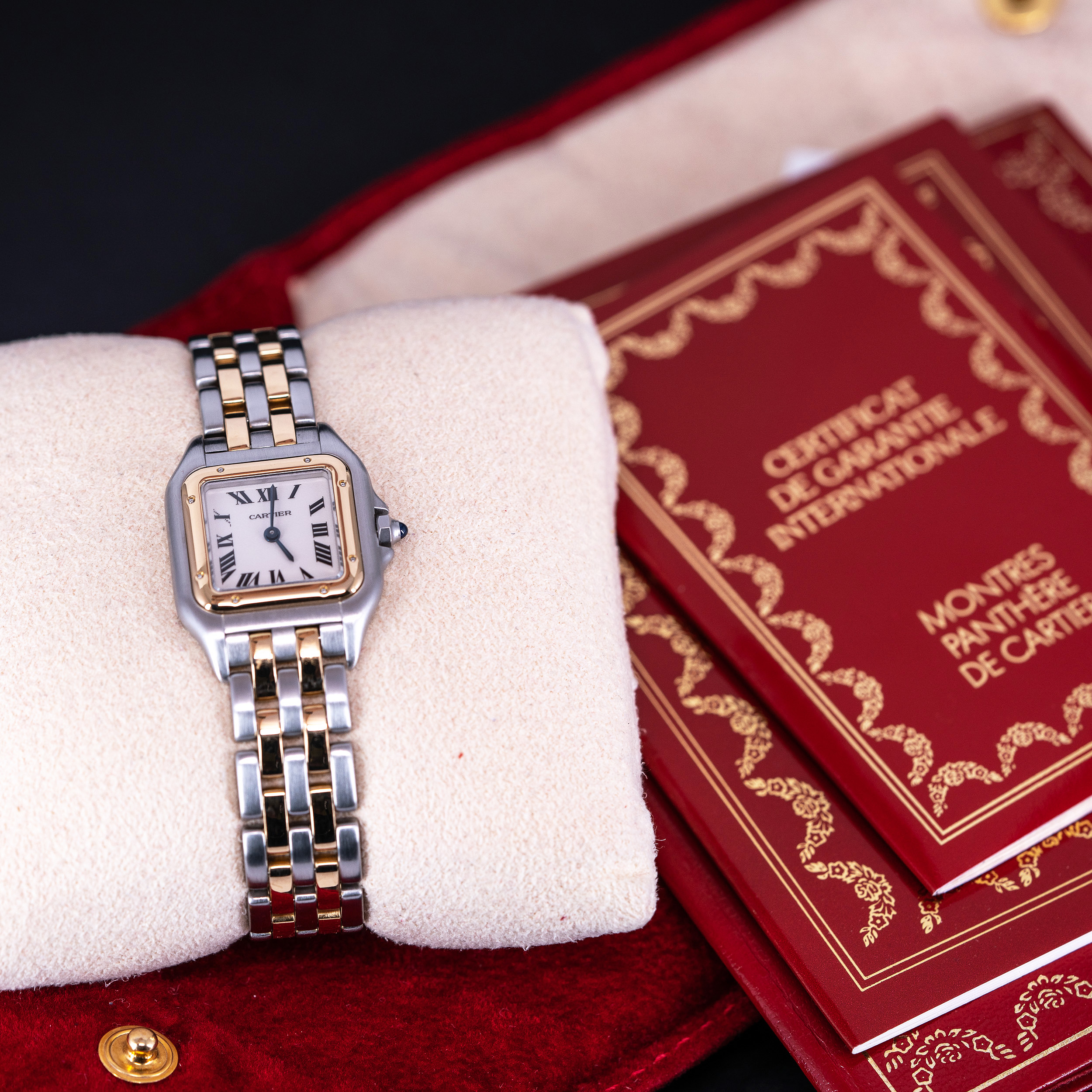 Kellossa on Cartierin kvartsikoneisto. Mukana tulee kaikki alkuperäiset paperit ja Cartierin punainen säilytyspussi.