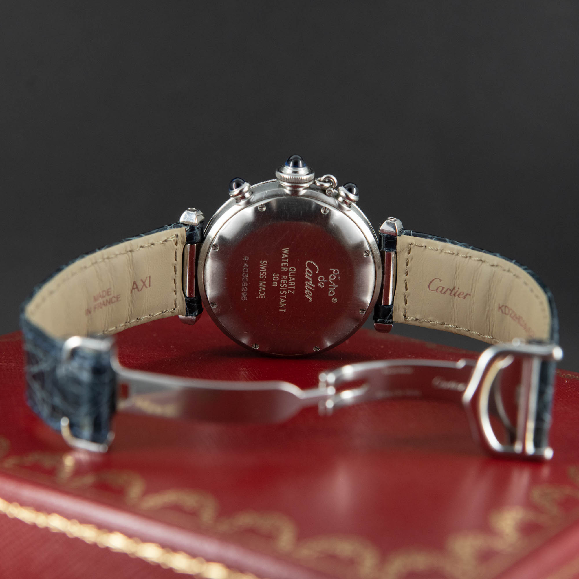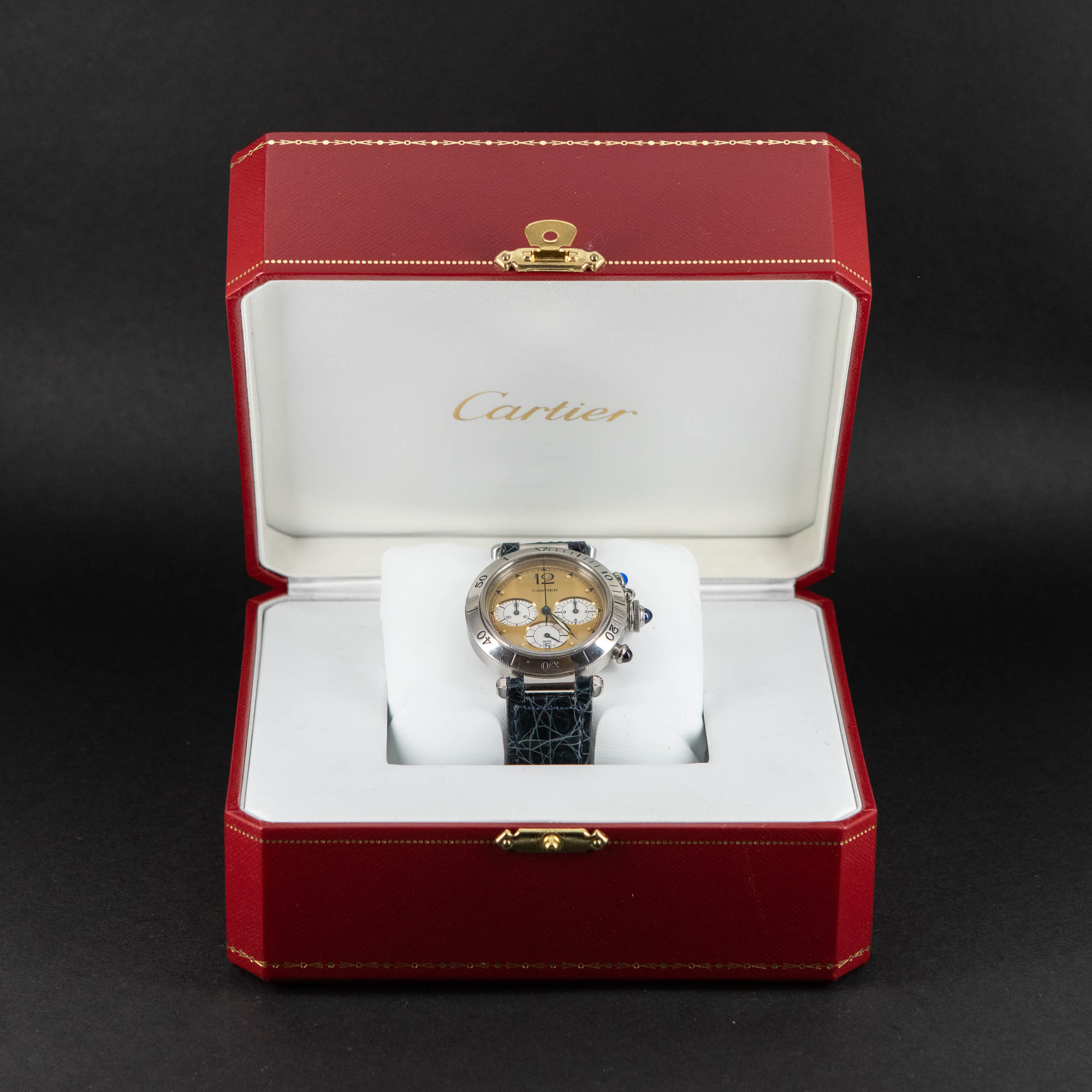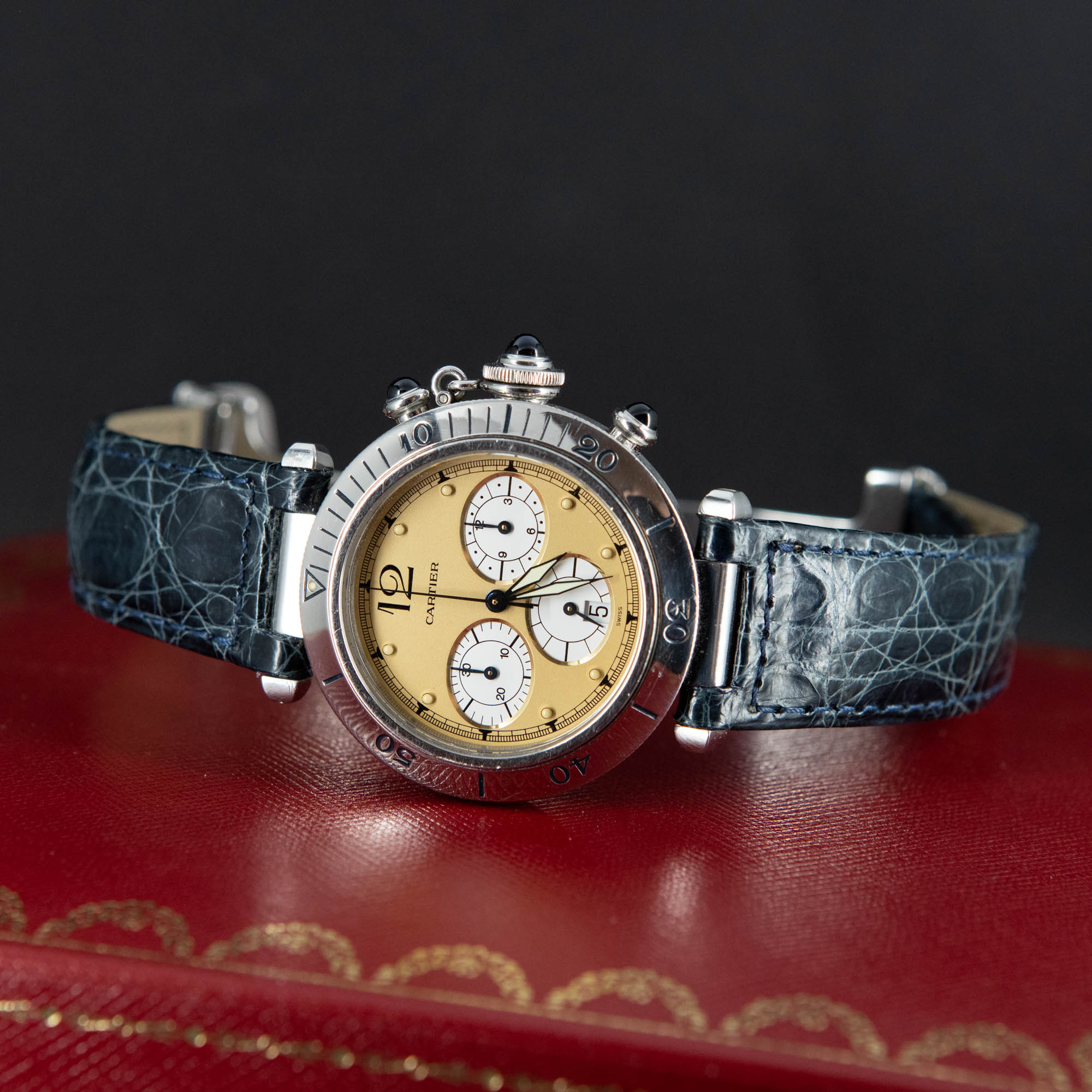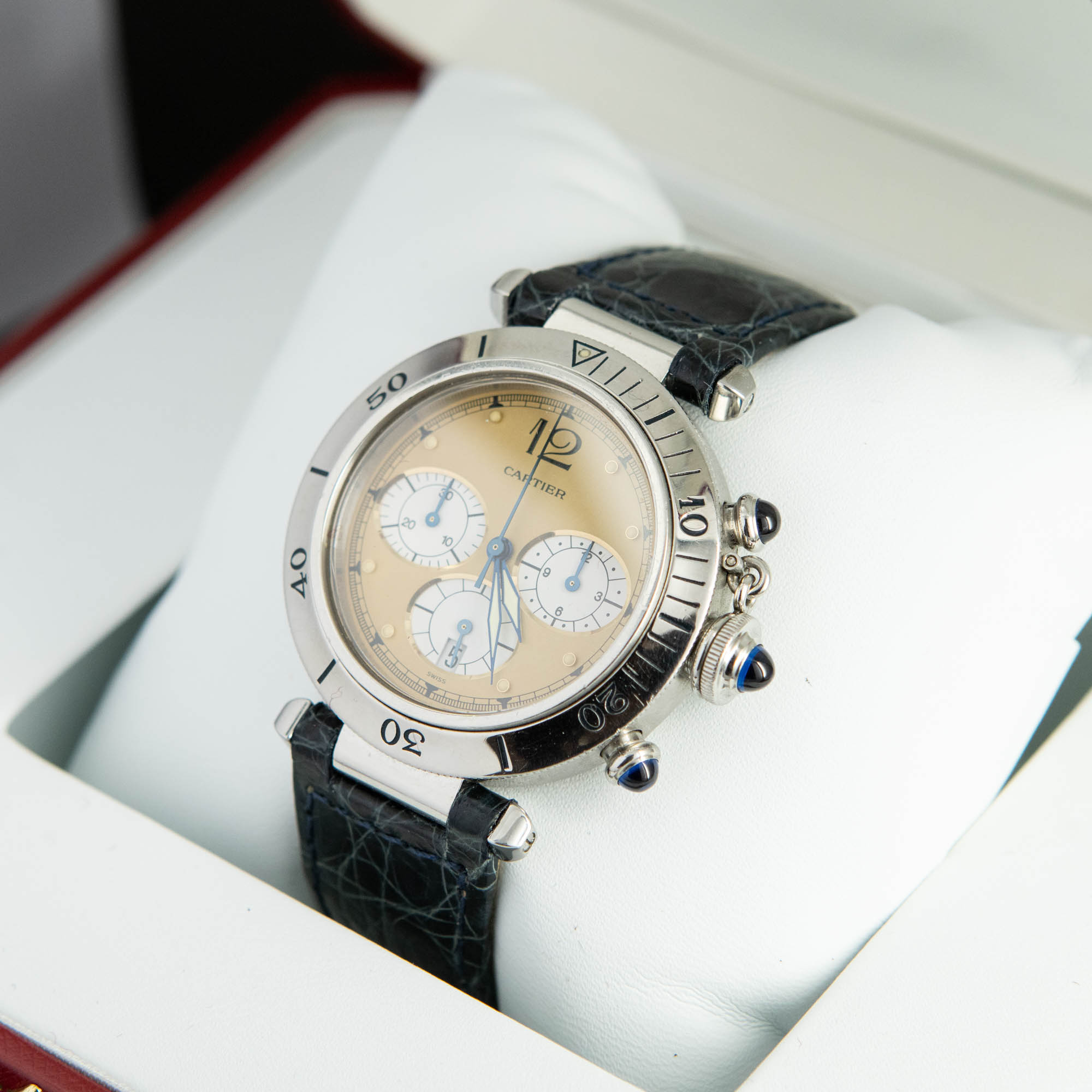 Teräskuorinen Cartier Pasha Chronograph 1990-luvun alusta. Ref. R4030. Erittäin hyväkuntoinen, kunnostettu yksilö. Virheetön kulta-valkoinen kellotaulu ja mustat luminova osoittimet. Cariterin kronografi kvartsikoneisto on erittäin hyvässä kunnossa. Cartierin uusi krokotiili-nahkaranneke Cartierin linkkulukolla. Virheetön Cartierin laatikko, ei papereita. Kuoren koko on 38,5mm.