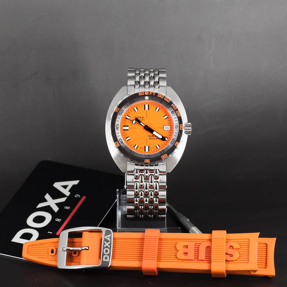 DOXA Automatic Sub 600T ”Dirk Pitt” sukeltajankello. Lähes uudenveroinen yksilö. Full set, laatikko, takuukortti ja muuta oheismateriaalia. Kellossa on ETA 2824-2 automaattikoneisto. Alkuperäinen DOXA:n bead of rice-teräsranneke. Mukana myös DOXA:n alkuperäinen käyttämätön kumiranneke.