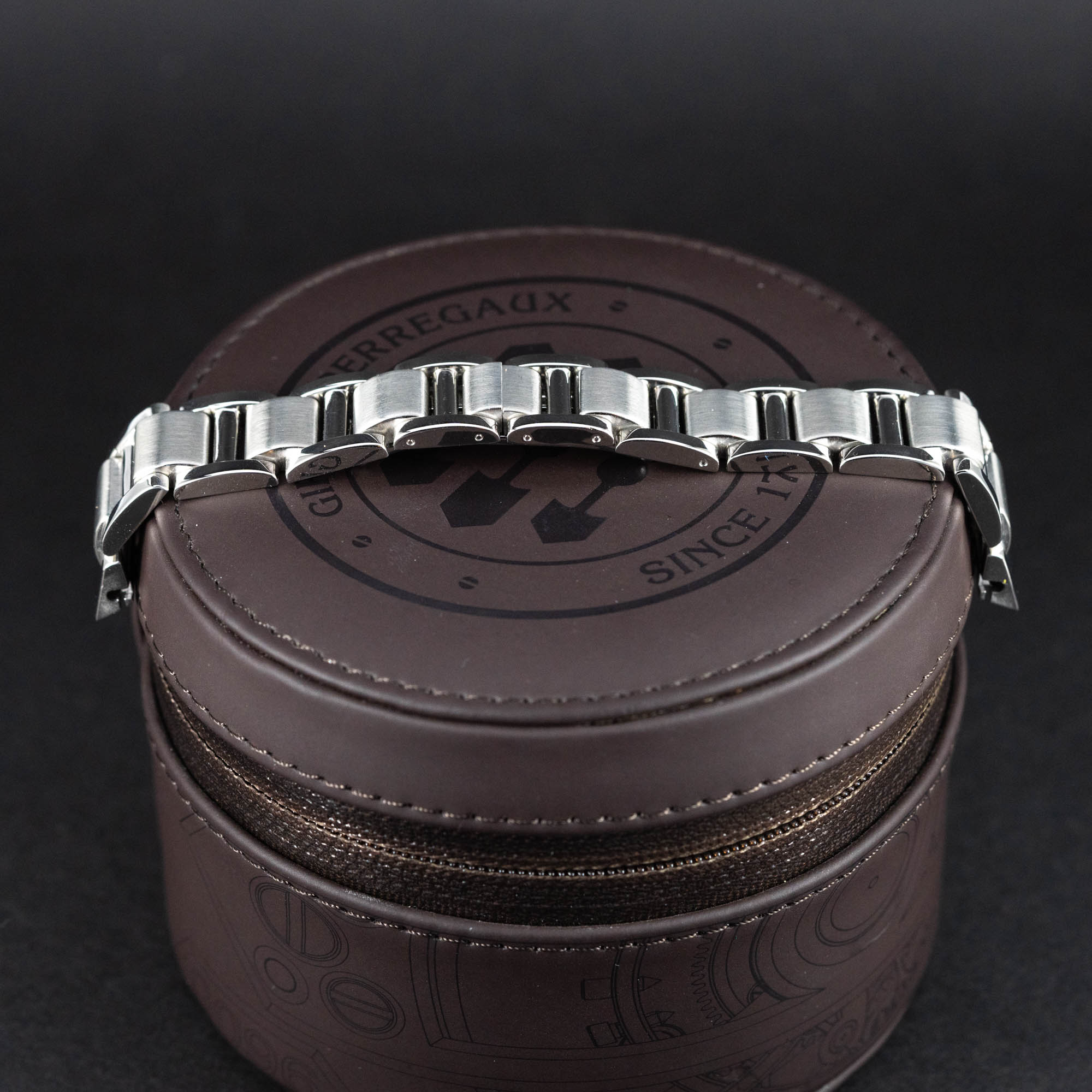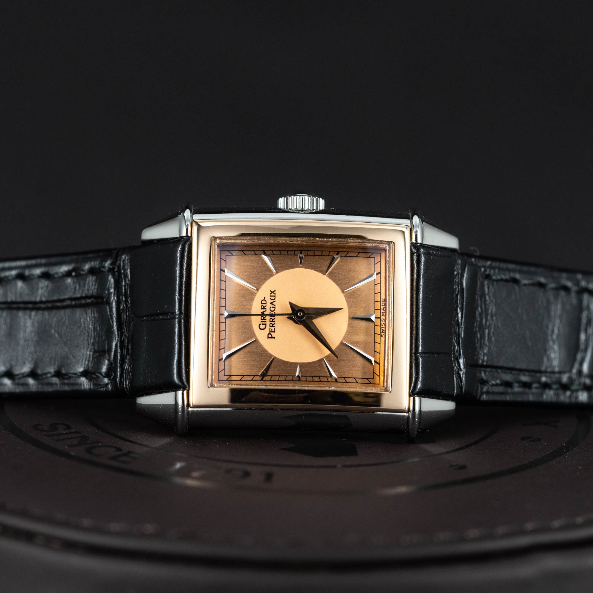Kaunis Girard-Perregaux Vintage 1945 Lady naisten rannekello. Ref.2591, No.337. Täydellisesti GP:n huollossa kunnostettu yksilö. Huippukuntoinen teräskuori jossa on 18k punakultainen bezel. Kuparinvärinen kellotaulu, safiirilasi ja kvatsikoneisto. Uusi GP:n alligaattori nahkaranneke GP:n soljella sekä alkuperäinen teräsranneke. GP:n huoltolaatikko, ei papereita. Kuoren koko on 23 x 21mm. Kuori on roiskevesitiivis, soveltuu hyvin jokapäiväiseen käyttöön.