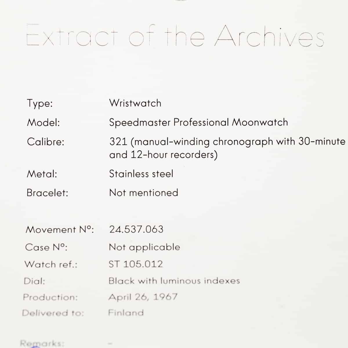 Omega Speedmaster Professional kuukelloja, joiden koko omistushistoria tiedetään aivan alusta asti on vähän. Vielä vähemmän on yksilöitä, joiden alkuperäinen omistaja on ollut kehittämässä avaruuslentojen aikana 1960-70-luvulla suomalaista huipputeknologiaa ja jolla on ollut suora ammatillinen yhteys NASA:aan. Näiden lisäksi kyseessä on alkuperäiskuntoinen yksilö itsessään harvinaisella CB kuorella. Tämä kello on monella tavalla keräilyharvinaisuus ja samalla myös käyttökello.