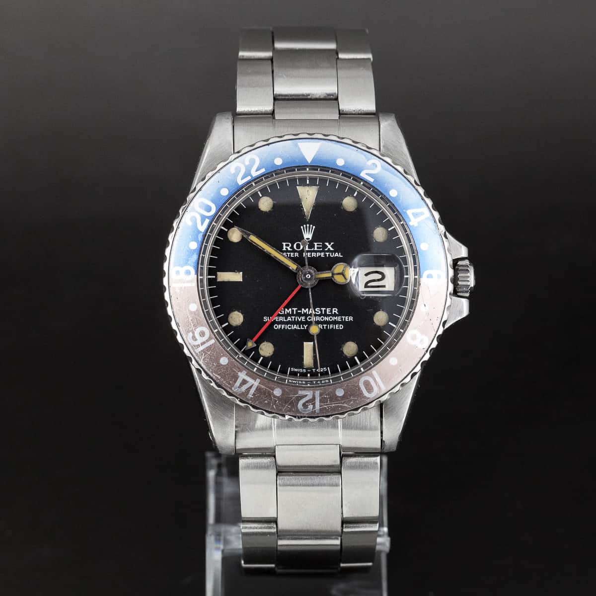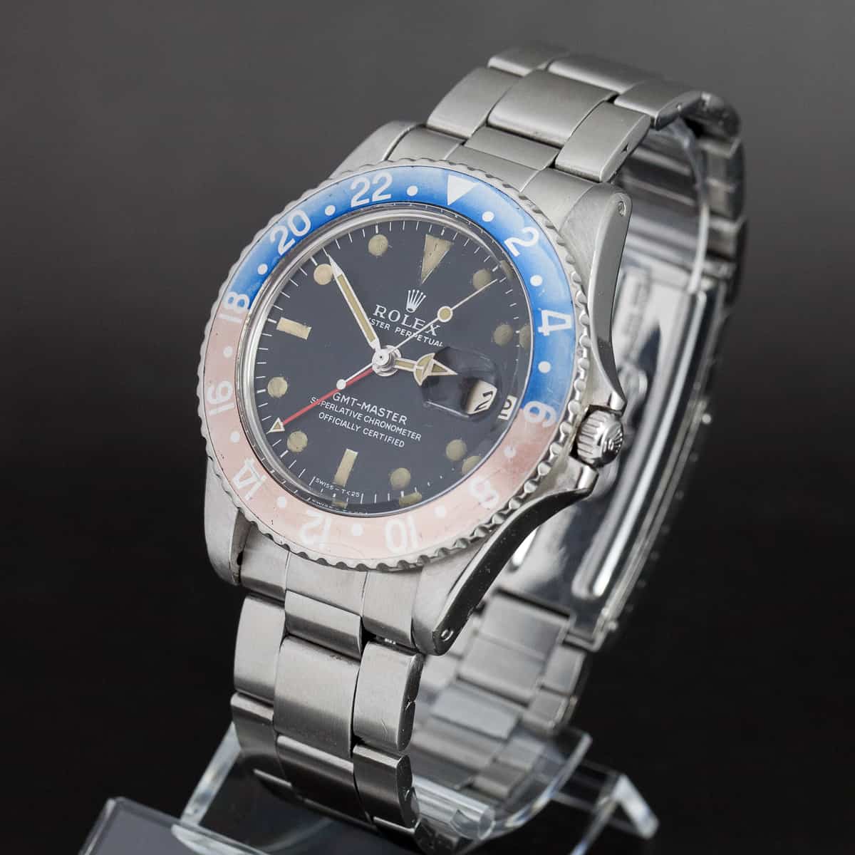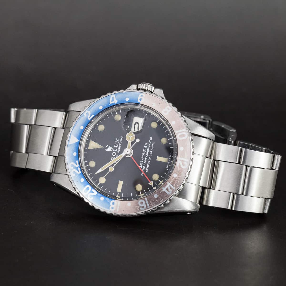 Harvinainen Rolex GMT-Master ref.1675 vuodelta 1967. Rolexin cal.1570 automaattikoneisto. Alkuperäinen MK1 kellotaulu, harvinainen pieni GMT-osoitin, alkuperäinen ”faded fat-font” Pepsi-bezel. Rolex huollon kunnostama, 24kk takuu.
