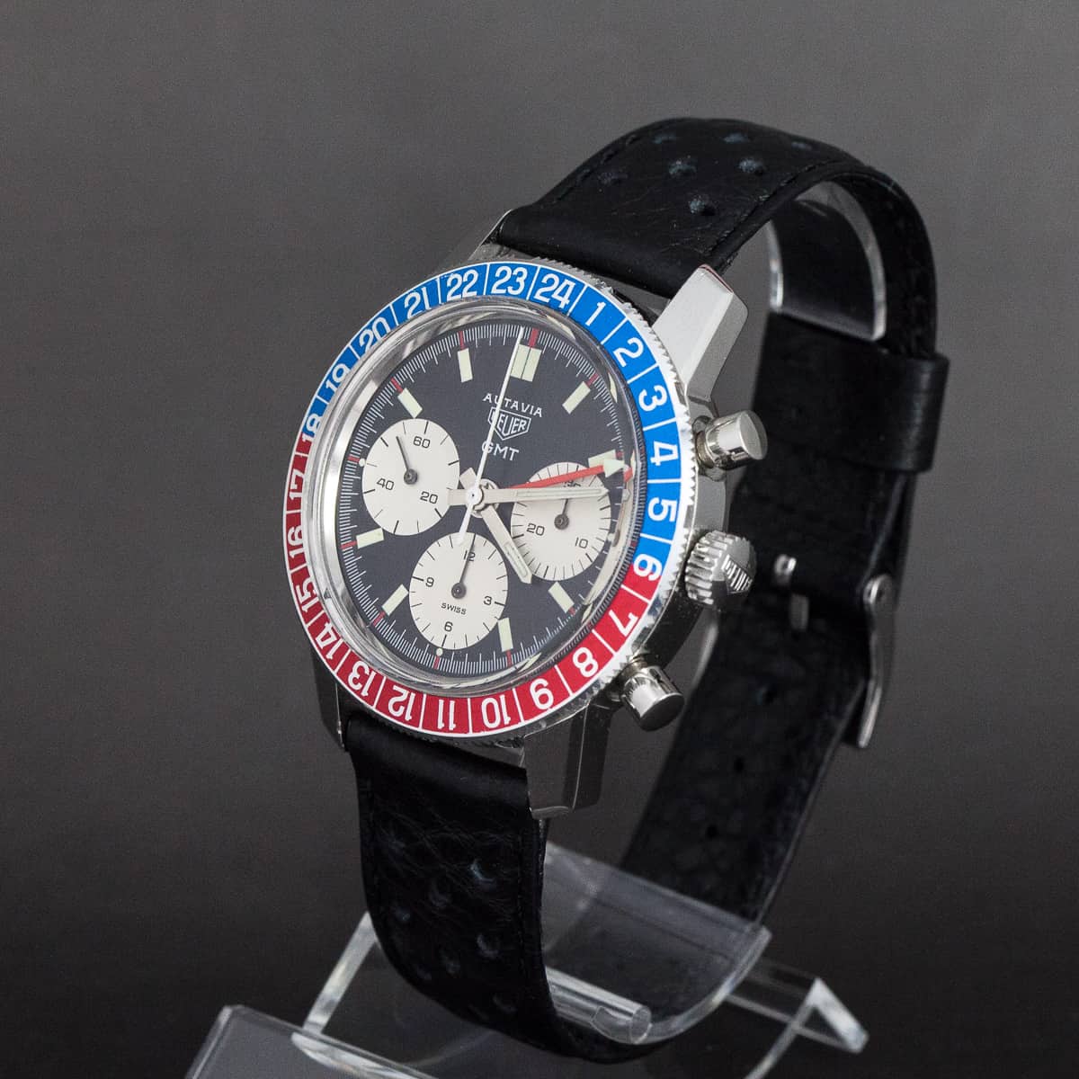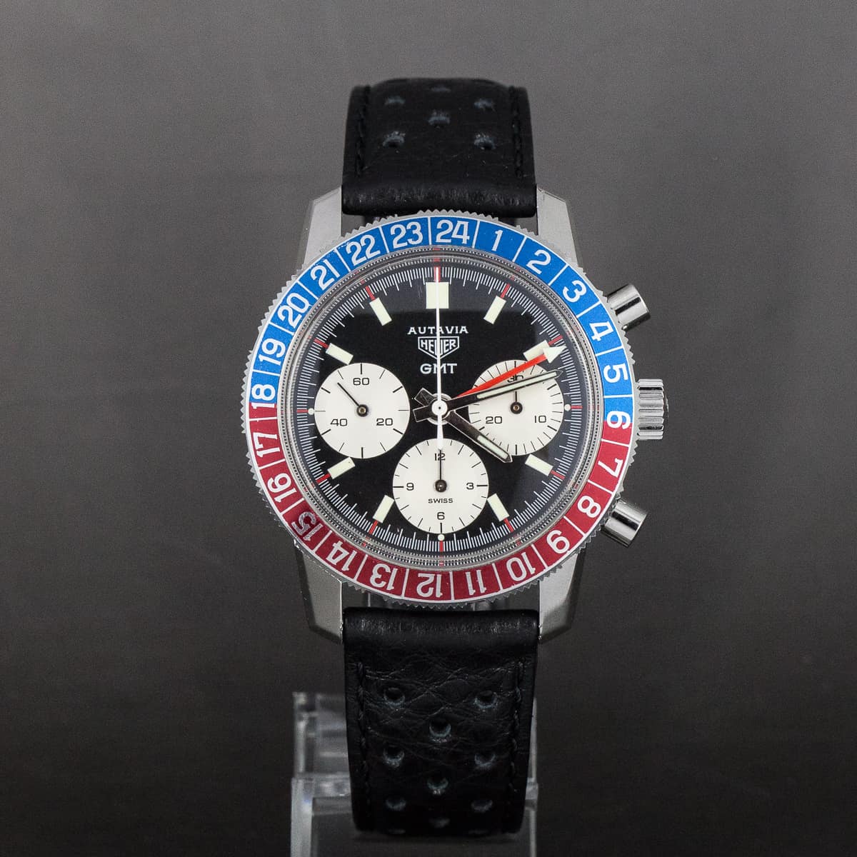 Hyvin harvinainen ja uudenveroinen Heuer Autavia 2446C-GMT vuodelta 1968-69. Valjoux 724-GMT manuaalivetoinen kronografikoneisto on hienossa kunnossa. Alkuperäinen kokonaisuus, kuorta ei ole hiottu/kiillotettu.