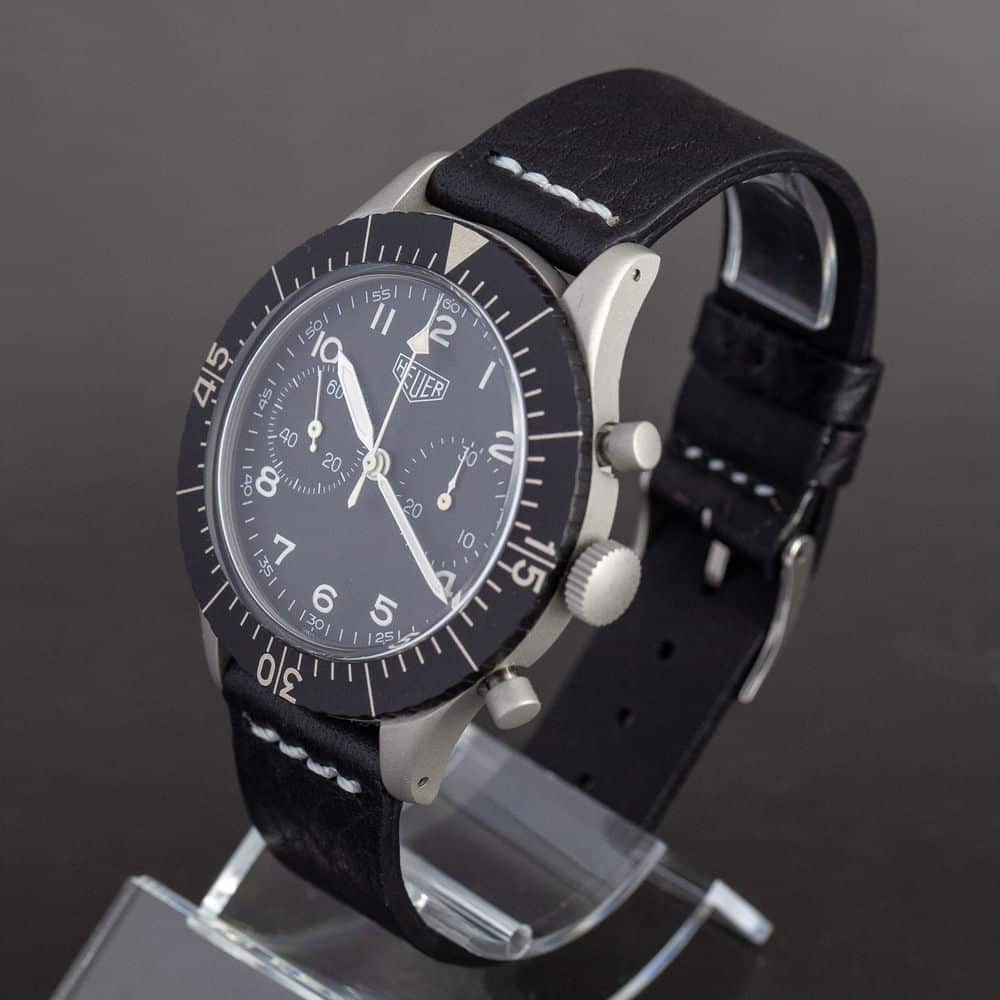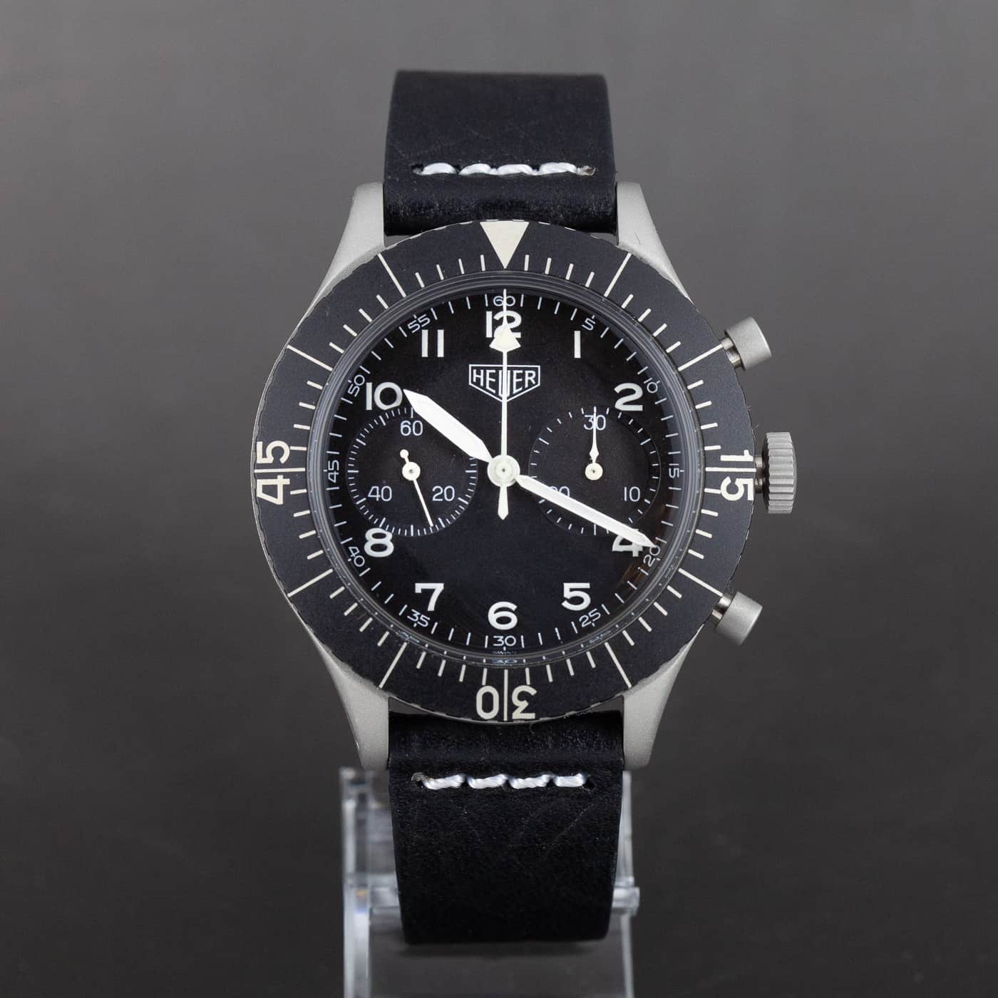 Harvinainen Heuer ”Bundeswehr” flyback lentäjän kronografi ref.1550 SG. Valmistettu 1970-luvulla, Sinnin kunnostama 1990-luvulla. Erittäin hyväkuntoinen ja täysin alkuperäinen yksilö. Viimeinen tauluversio suurella Heuer logolla ja suurilla numeroilla. Tritium lume on virheetön.