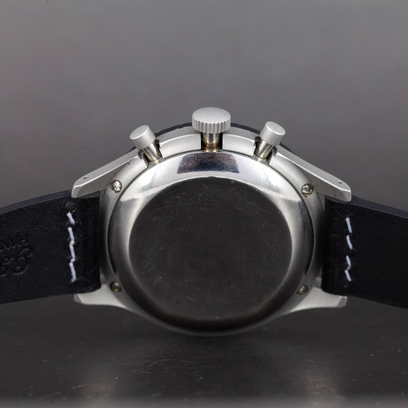 Hyväkuntoinen Valjoux cal.230 kronografikoneisto. Sarjanumero kuoressa 1202. Kuoren koko on 43mm. Käsin tehty nahkaranneke.