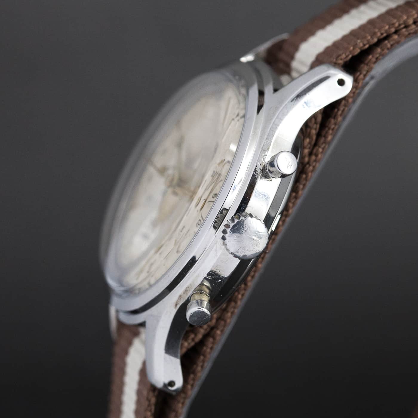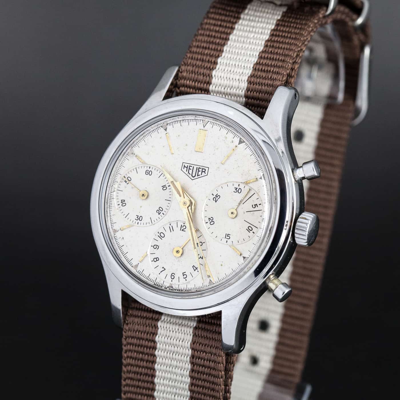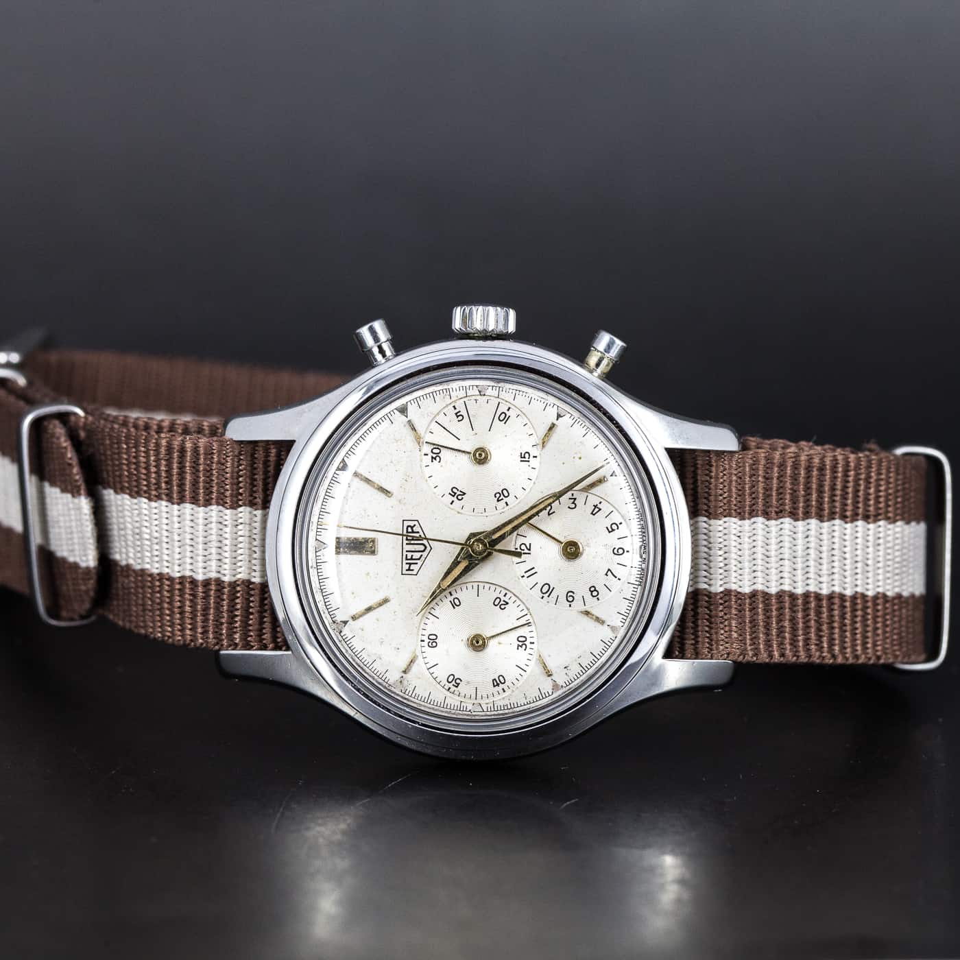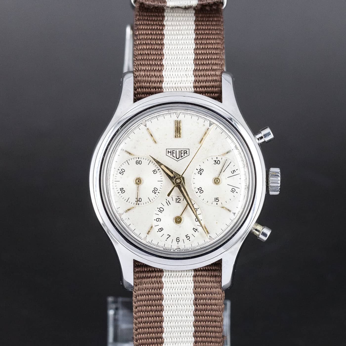 Heuer ”pre-Carrera” ref. 2444 1950-luvulta. Koneisto on juuri kunnostettu manuaalivetoinen Valjoux 72 kronografi. Täysin alkuperäinen kellotaulu ja osoittimet. Hyväkuntoinen 36mm teräskuori.