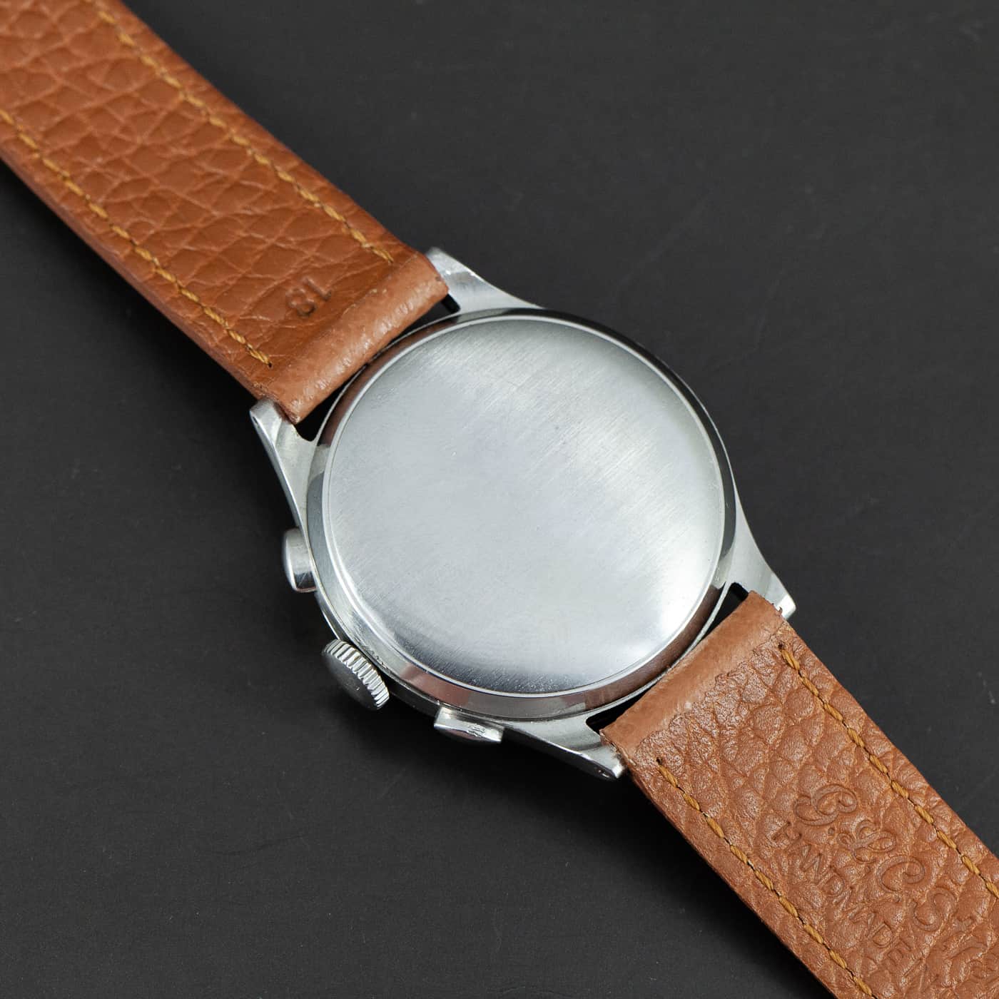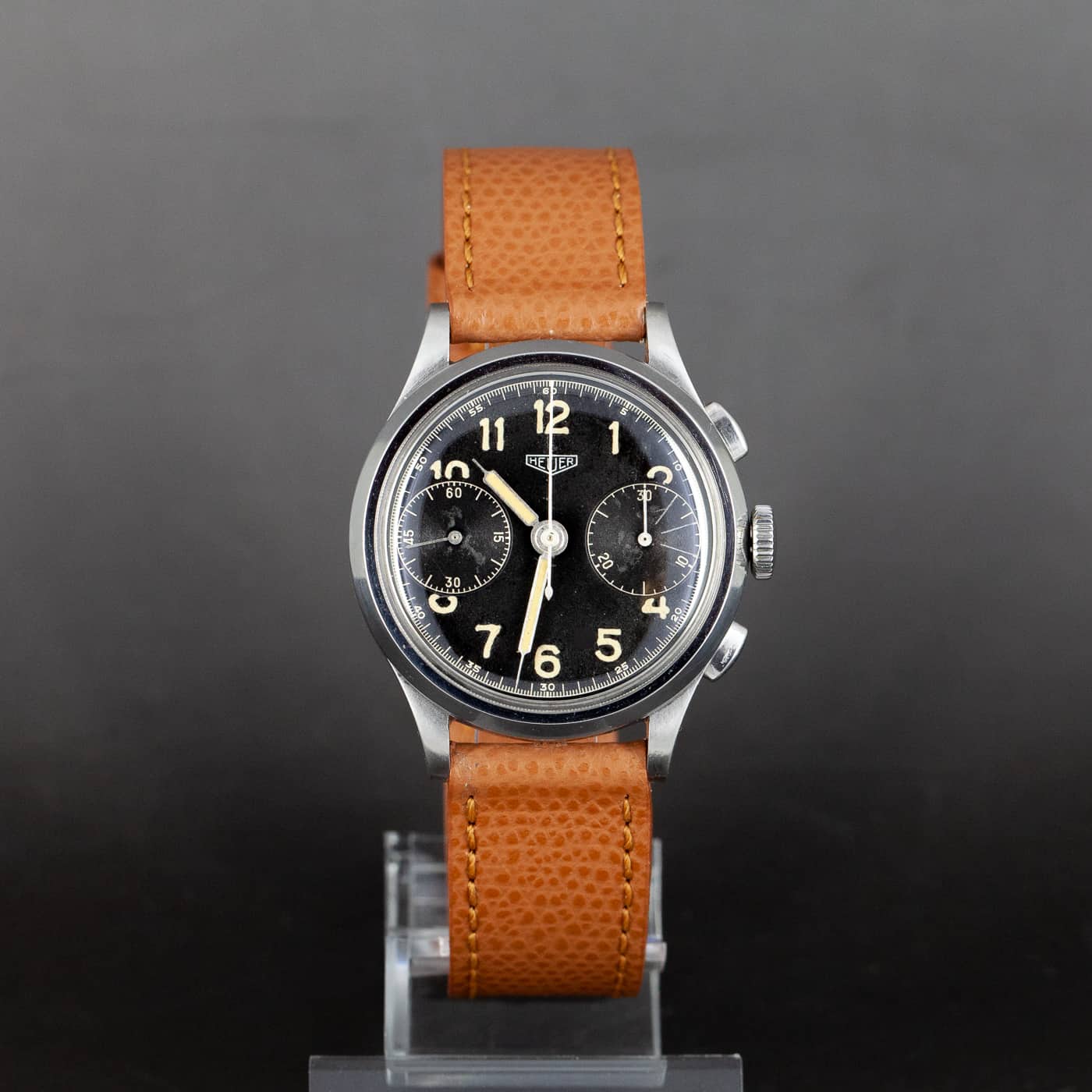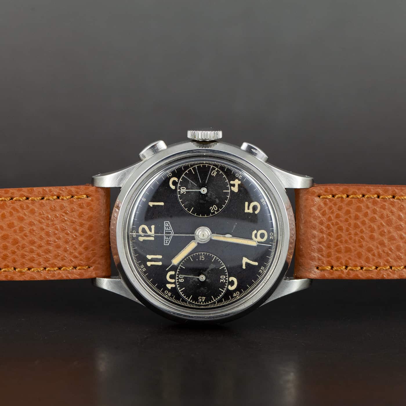 Harvinainen Heuer ref. 347 NR kronografi vuodelta 1938-46. Alkuperäinen musta radium kellotaulu. Military osoittimet, osoittimien lume on joskus uusittu. Valjoux 22 koneisto on hienossa kunnossa. Italialainen käsin ommeltu nahkaranneke. Kuoren koko on 36mm.