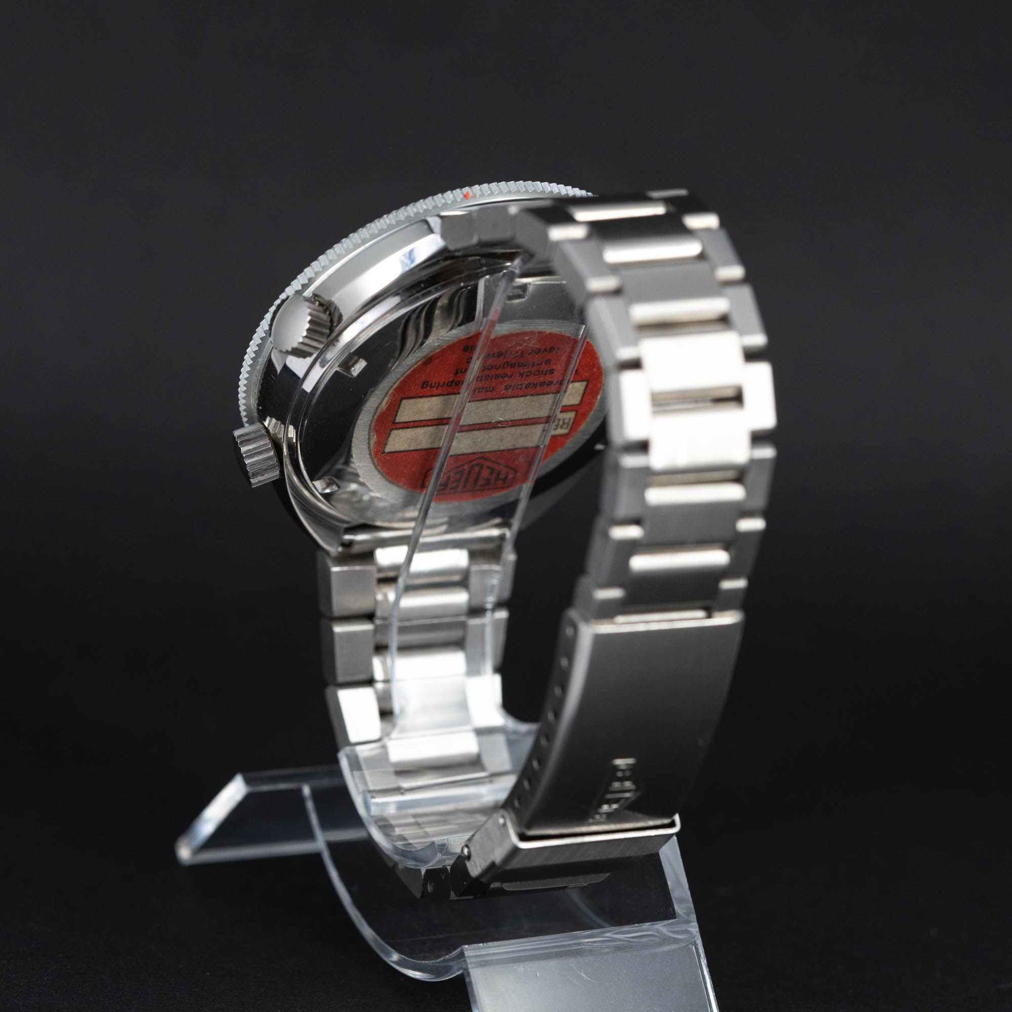 NOS Heuer Solunar Automatic ref.279.603 vuodelta 1976-78. Harvinainen vuorovesien laskemiseen suunniteltu automaattirannekello. Käyttämätön yksilö alkuperäisellä Heuerin teräsranteella. Kellotaulu ja osoittimet ovat virheettömät. Virheetön teräskuori, hyvin kevyitä poikittaisia naarmuja takapohjassa mahdollisesti kellotelineen jäljiltä. Takapohjassa on alkuperäinen Heuer tarra. Koneisto on Eta 2790-1 ja juuri täysin huollettu. Kuoren koko on 45mm.