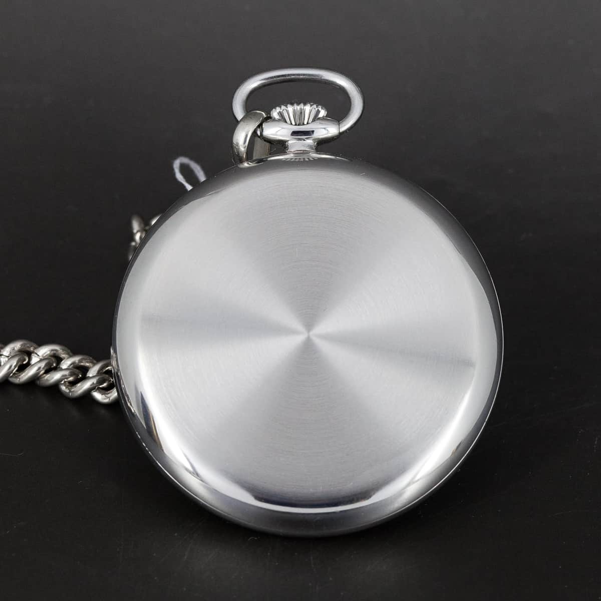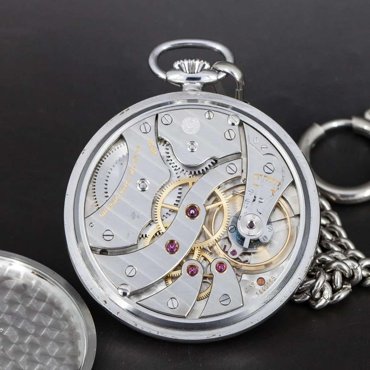 IWC teräskuorinen taskukello vuodelta. IWC:n cal.67 Lepiné koneisto. Juuri täysin kunnostettu kokonaisuus. Virheetön hopeoitu kellotaulu ja sinistetyt osoittimet. Kellon mukana tulee teräksinen taskukellonvitja.