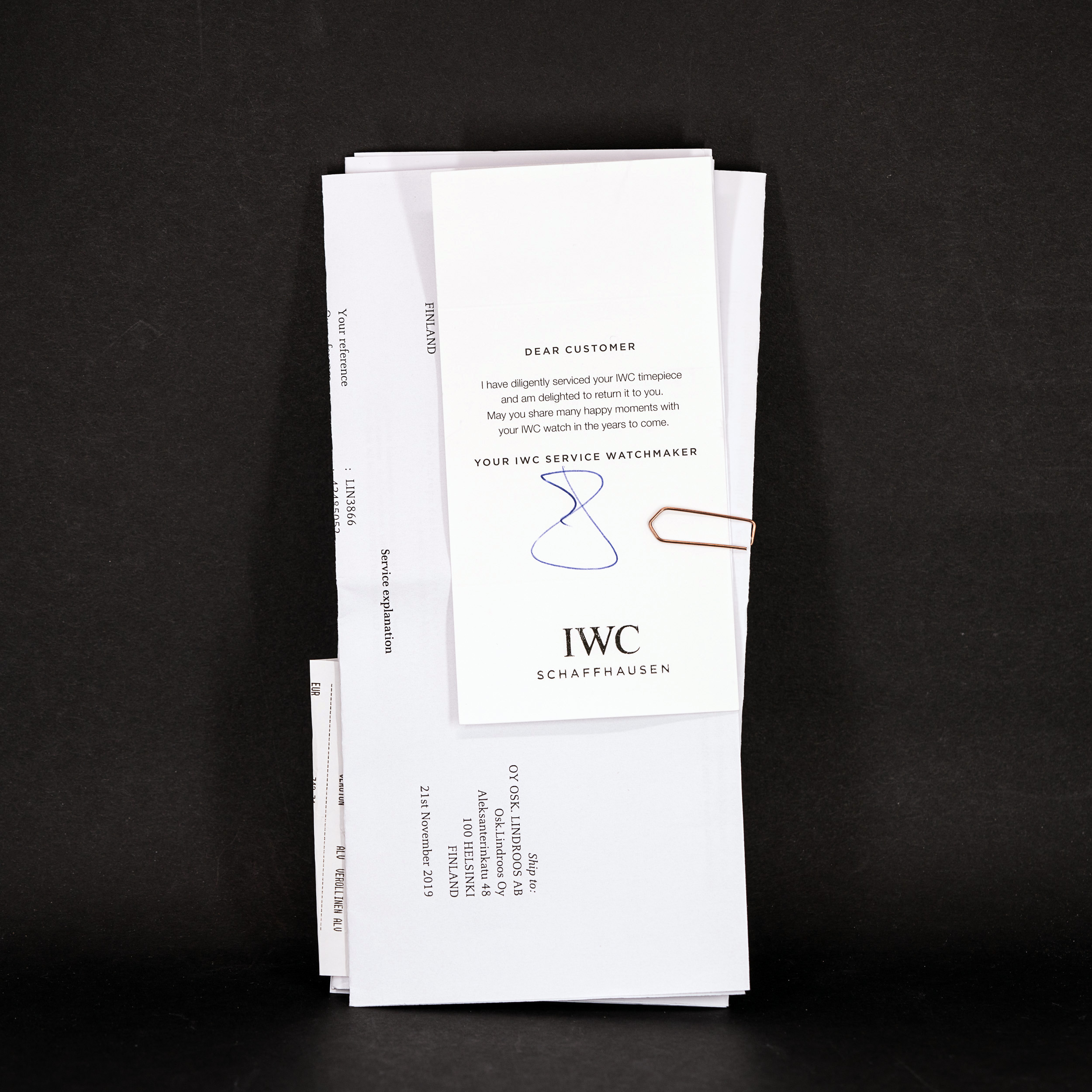 Kellon mukana tulee IWC:n musta-valkoinen laatikko, IWC huollon dokumentit ja IWC:n kirja.