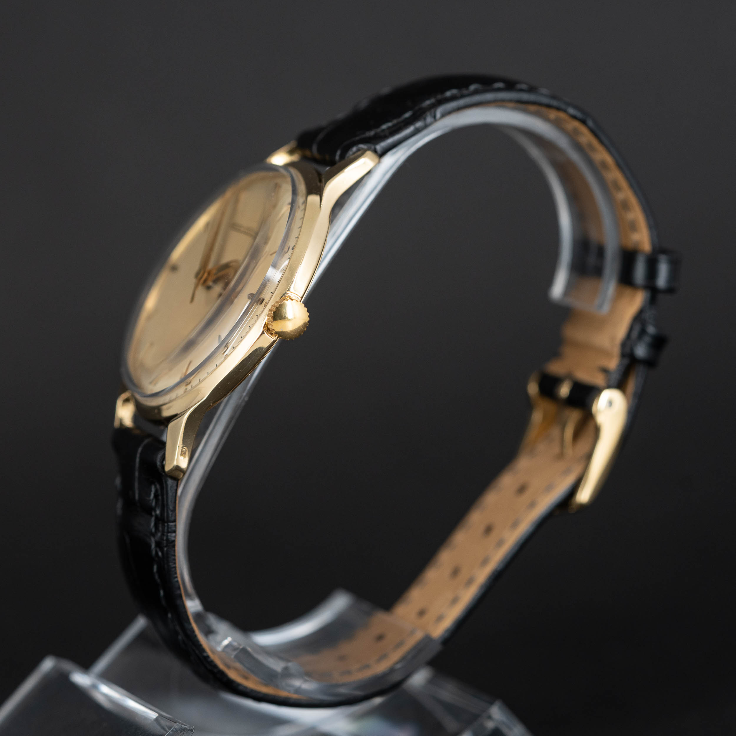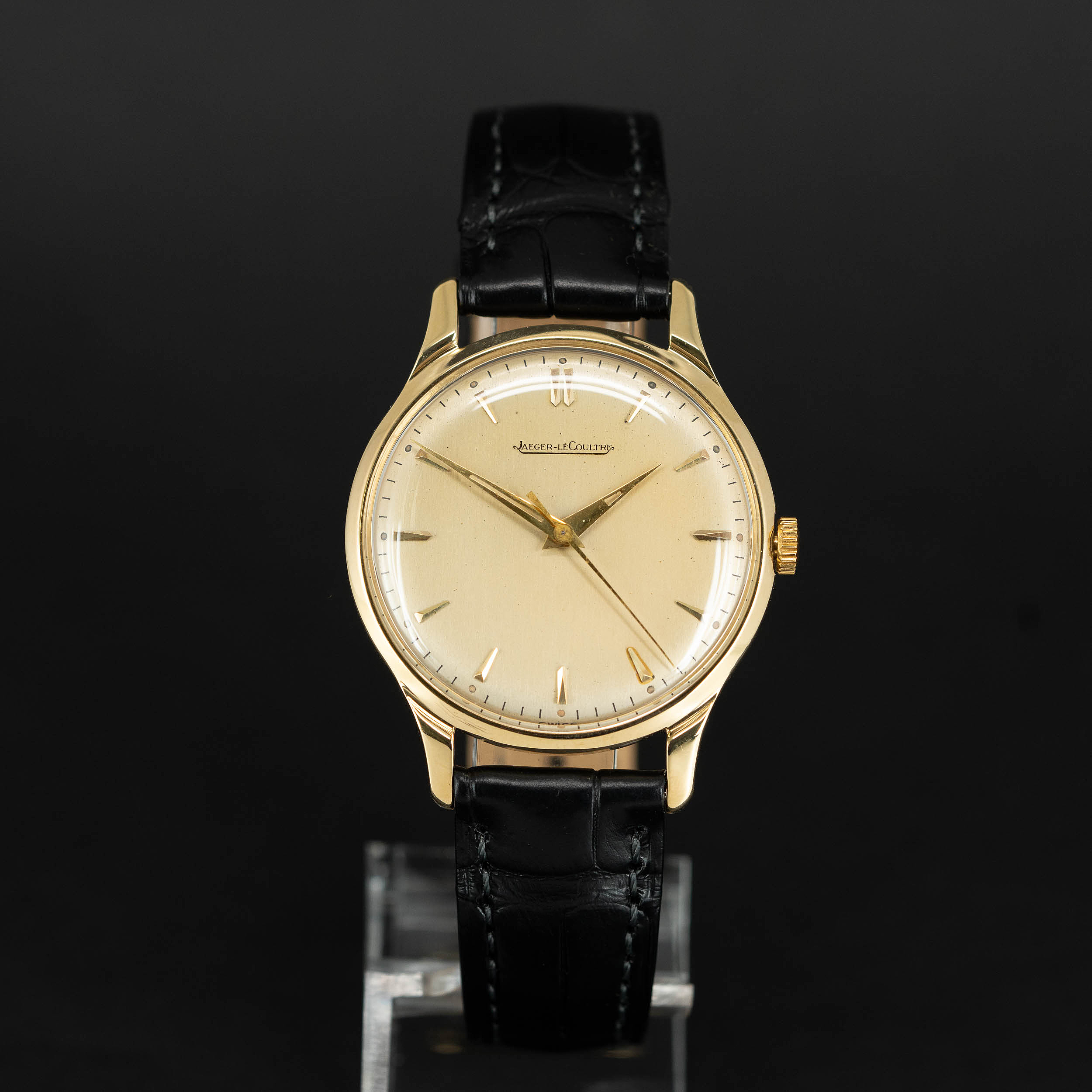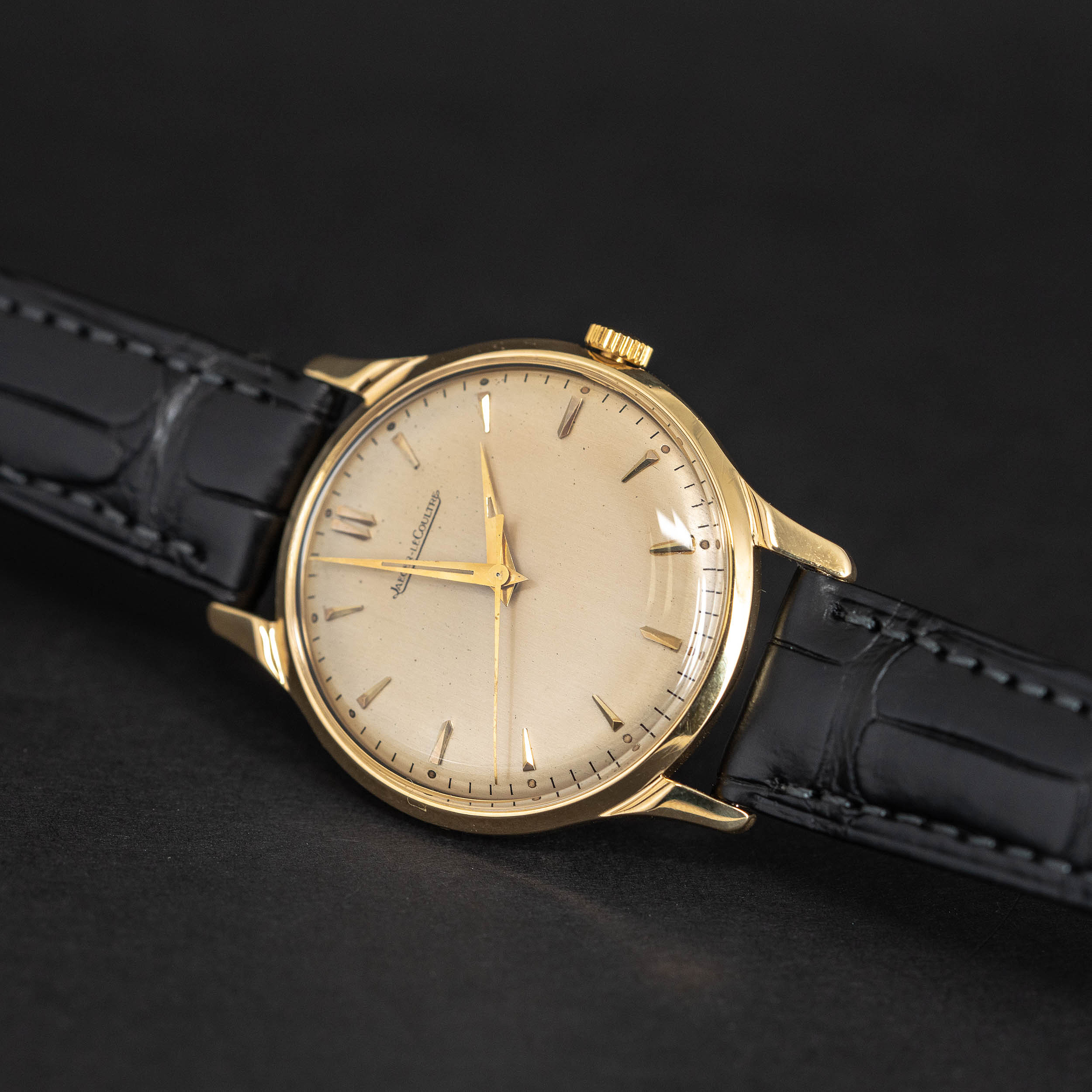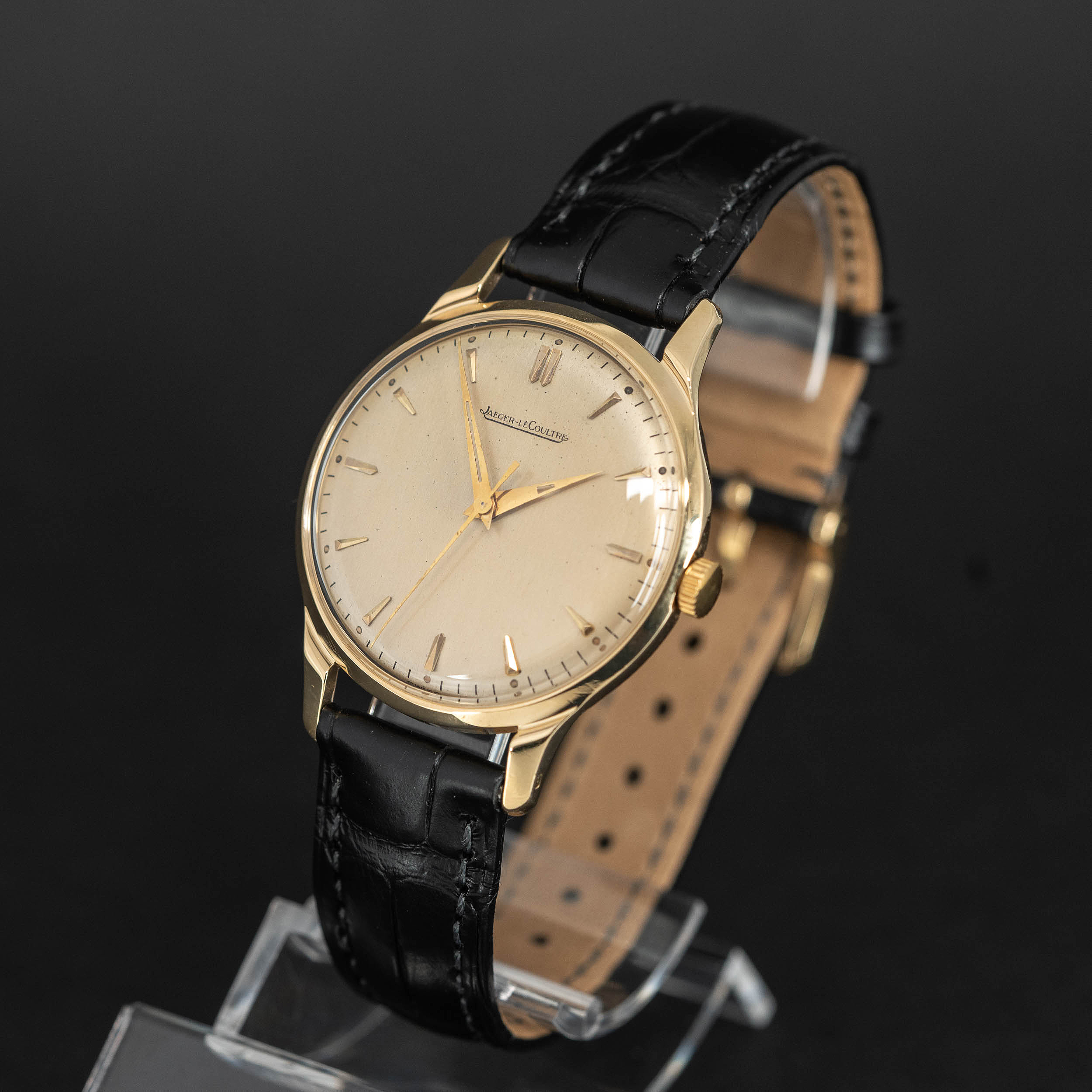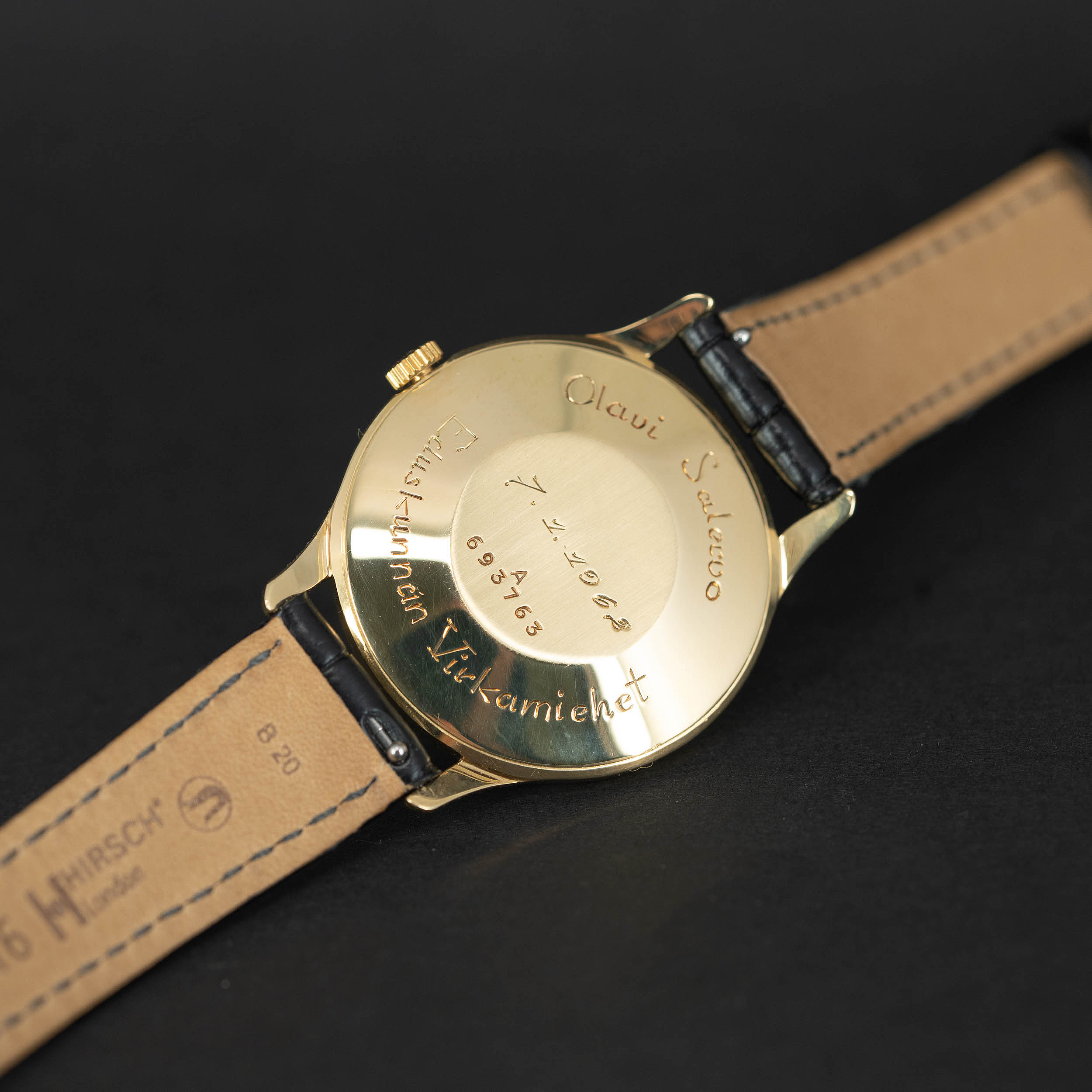 JLC cal. P800 manuaalivetoinen koneisto on juuri kunnostettu. Ranneke on Hirsch London Alligator mallia.