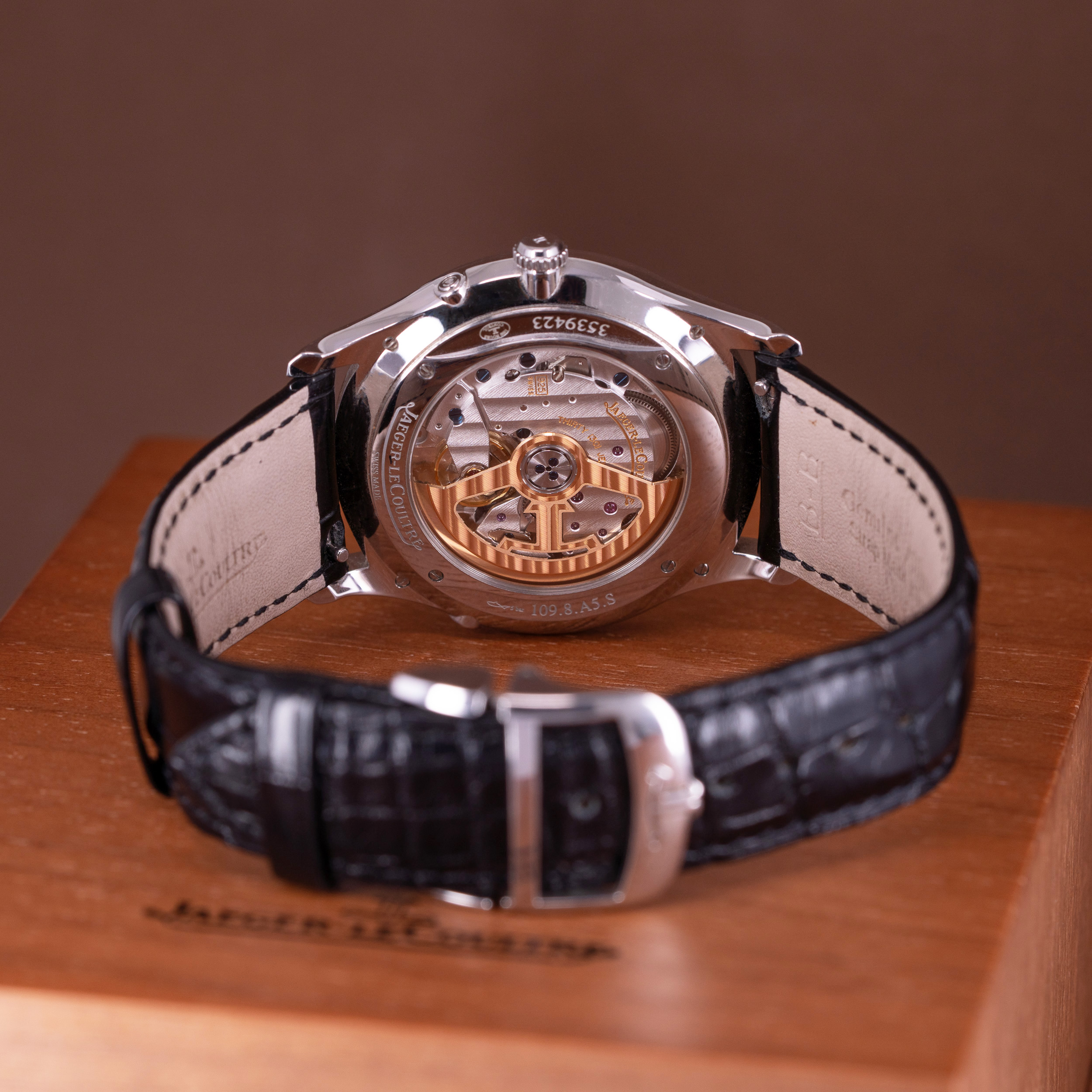 Kellossa on mallin alkuperäinen musta JLC Alligaattori nahkaranneke, jossa on JLC:n teräs linkkusolki.