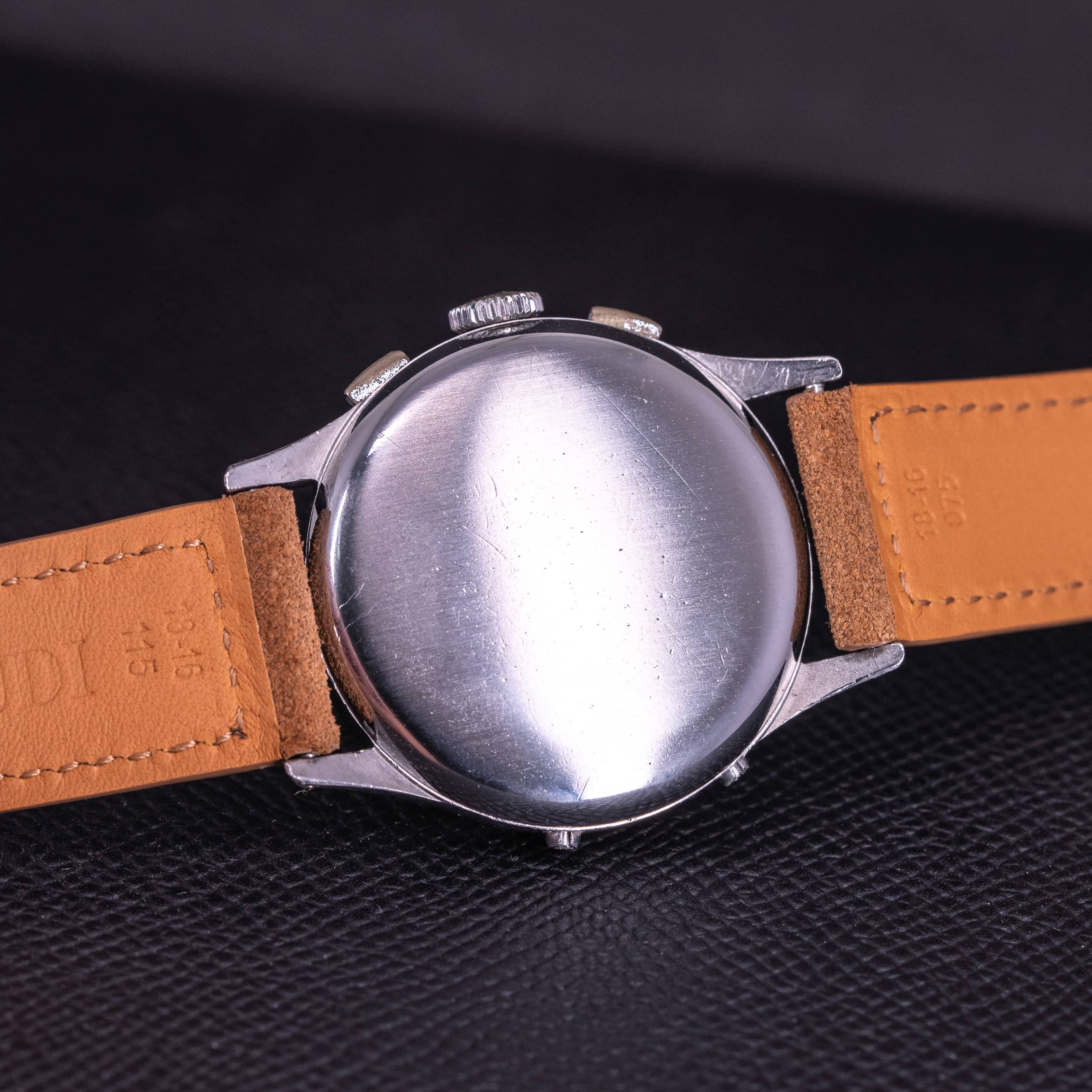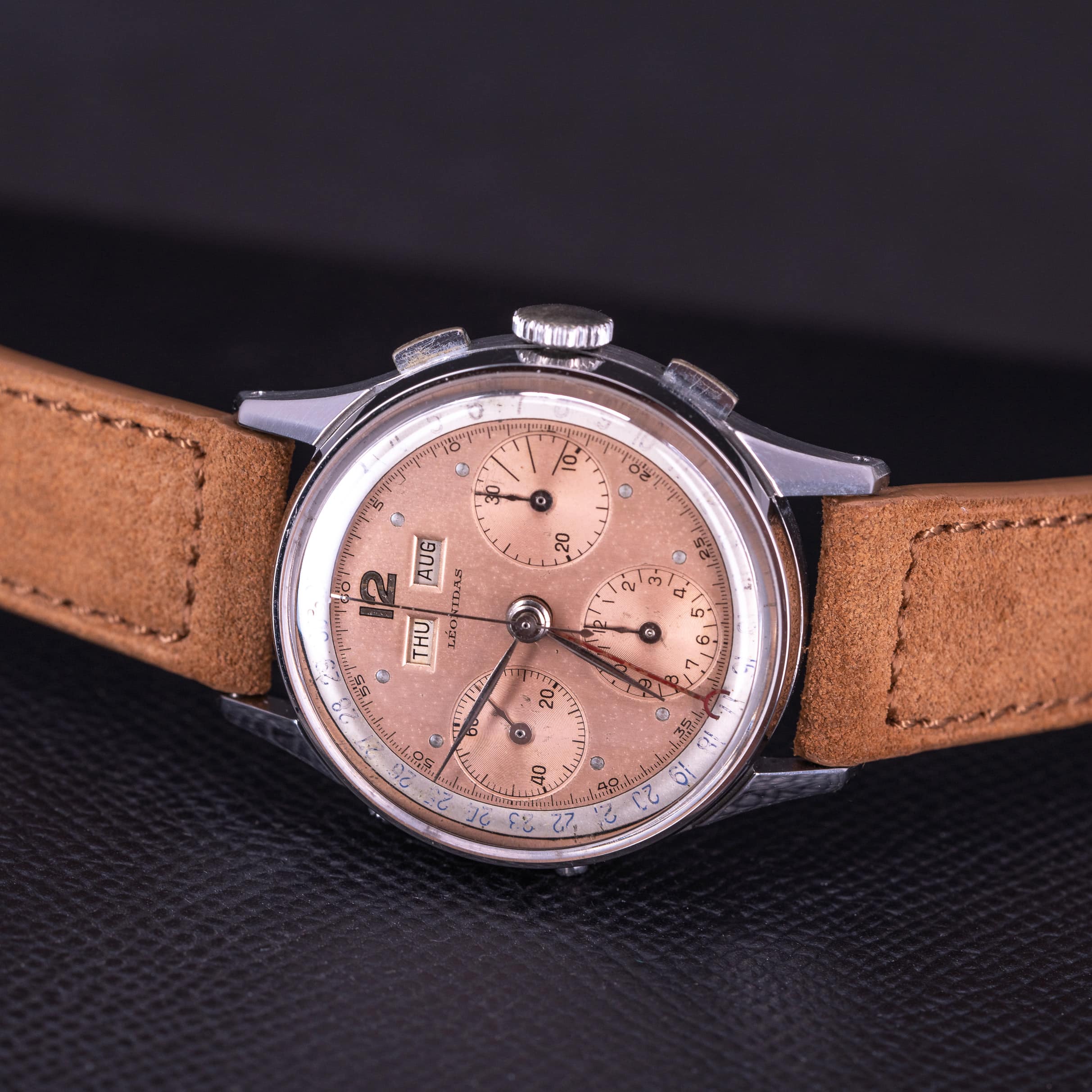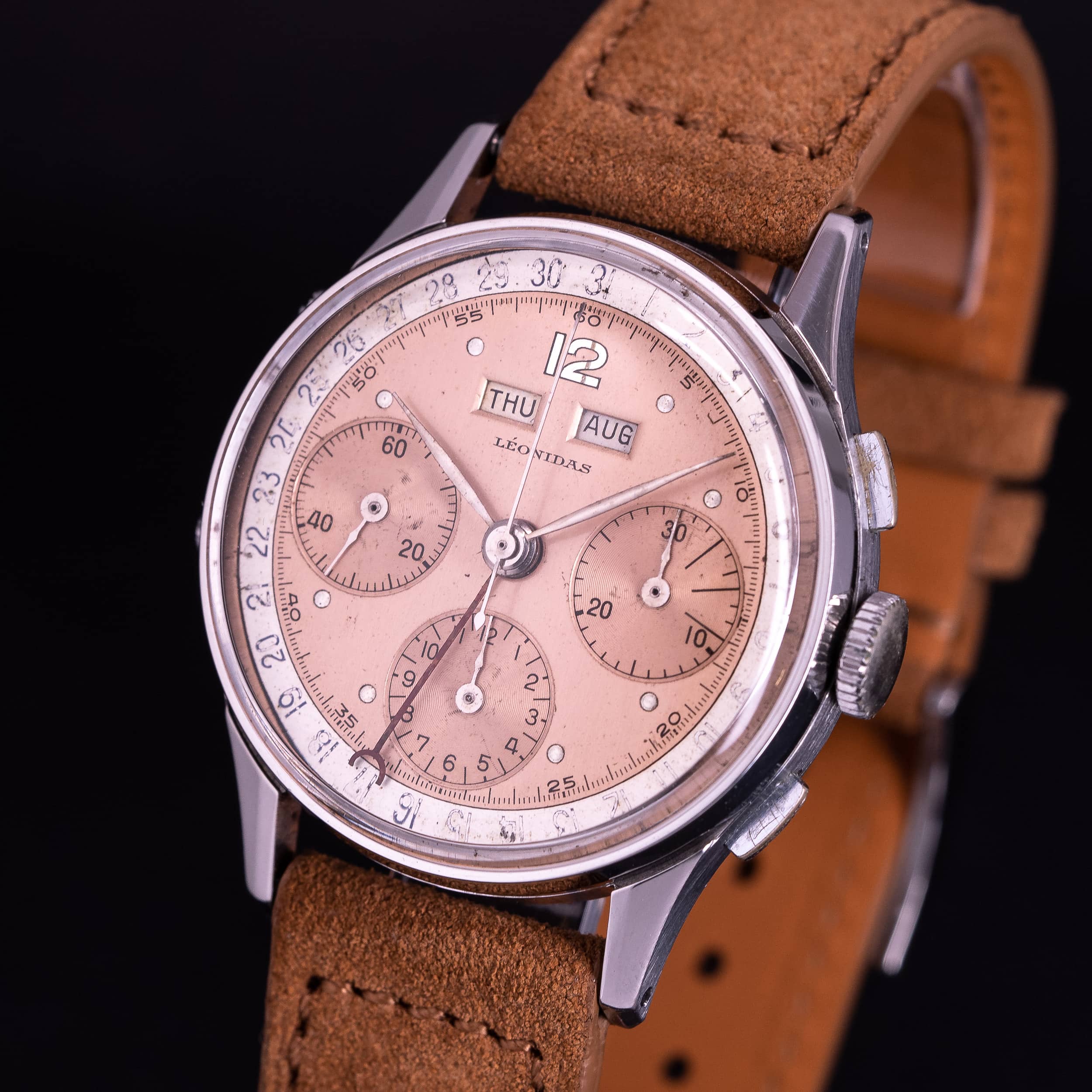 Harvinainen Leonidas Triple-Date manuaalivetoinen kronografi 1950-luvulta. Kellossa on kaunis lohenpunainen two-tone kellotaulu, jossa on normaalin aikanäytön lisäksi kuukaudenpäivän, viikonpäivän ja kuukauden näytöt. Teräksenväriset osoittimet ovat Dauphine-mallia. Teräskuori on hyväkuntoinen. Kuoressa on pikasiirto painimet kuukaudenpäivän ja kuukauden vaihtamiseksi. Kuoressa ei ole tiivisteitä, joten kello soveltuu vain siistiin käyttöön. Kuoren koko on 35 mm.