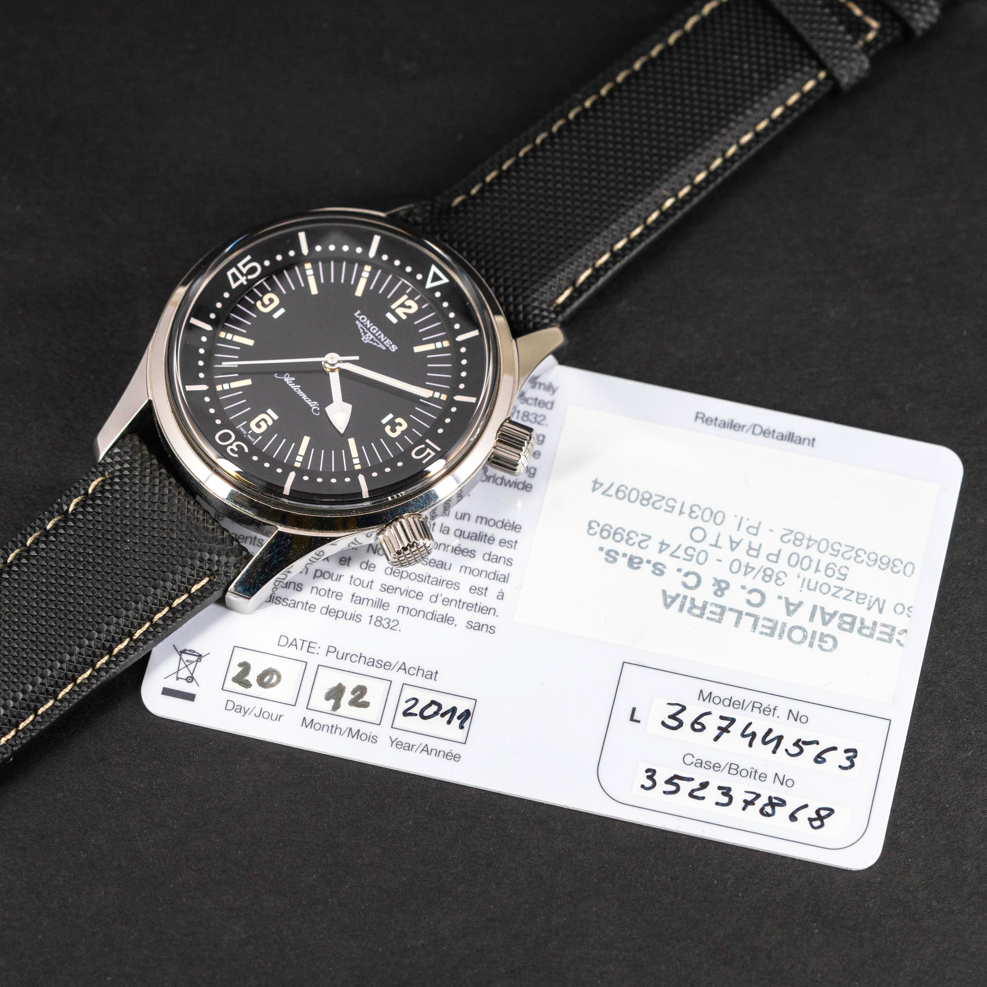 Longines Legend Diver Automatic sukeltajankello vuodelta 2011. Harvinainen ”no-date” versio ref. L3.674.4.563. Full-set, kaikki laatikot ja paperit. Lähes virheetön teräskuori. Virheetön kellotaulu ja osoittimet.