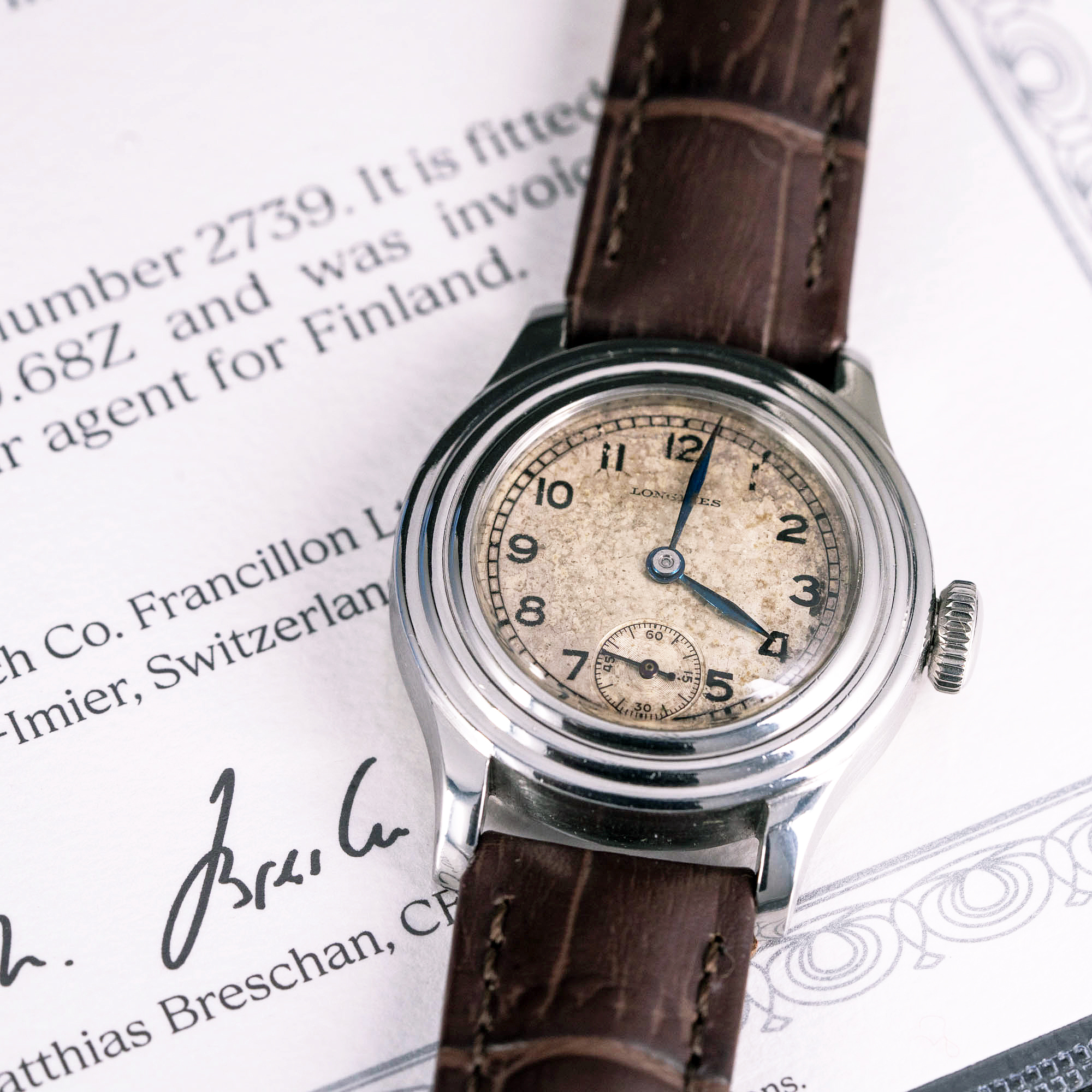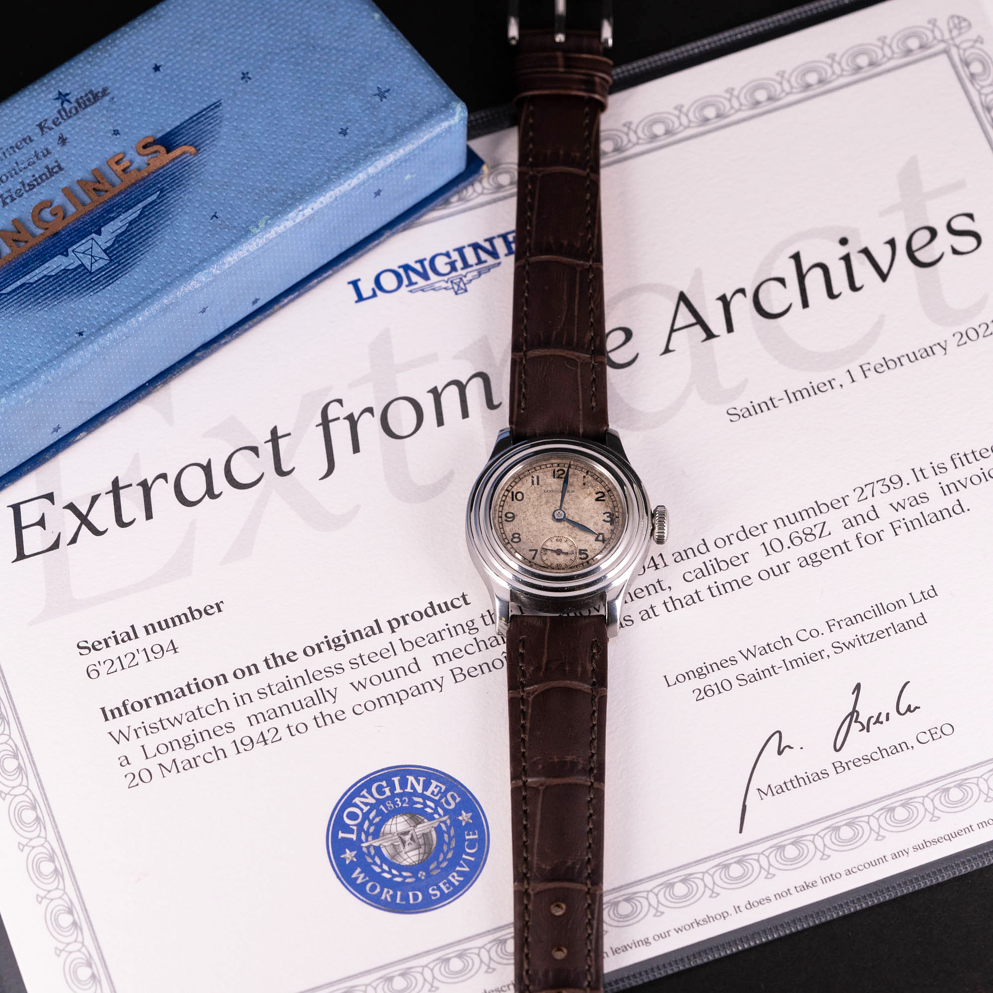 Kellon mukana toimitettavan Longineksen Extract-from-Archives todistuksen mukaan kello on toimitettu Suomeen jatkosodan keskelle, 20. maaliskuuta 1942.