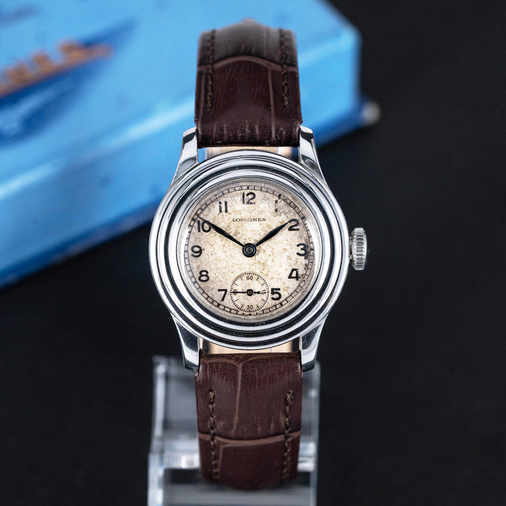 Harvinainen, pienikokoinen Longines Tre-Tacche rannekello vuodelta 1942. Ref. 2739-20. Harvinainen porrastettu teräsrunko ja takapohja kolmella kiristysuralla (tre-tacche). Alkuperäinen hopeoitu kellotaulu ja sinistetyt teräs-osoittimet. Koneisto on juuri täysin kunnostettu manuaalivetoinen Longines cal.10.68Z. Kuoren koko on 30mm.