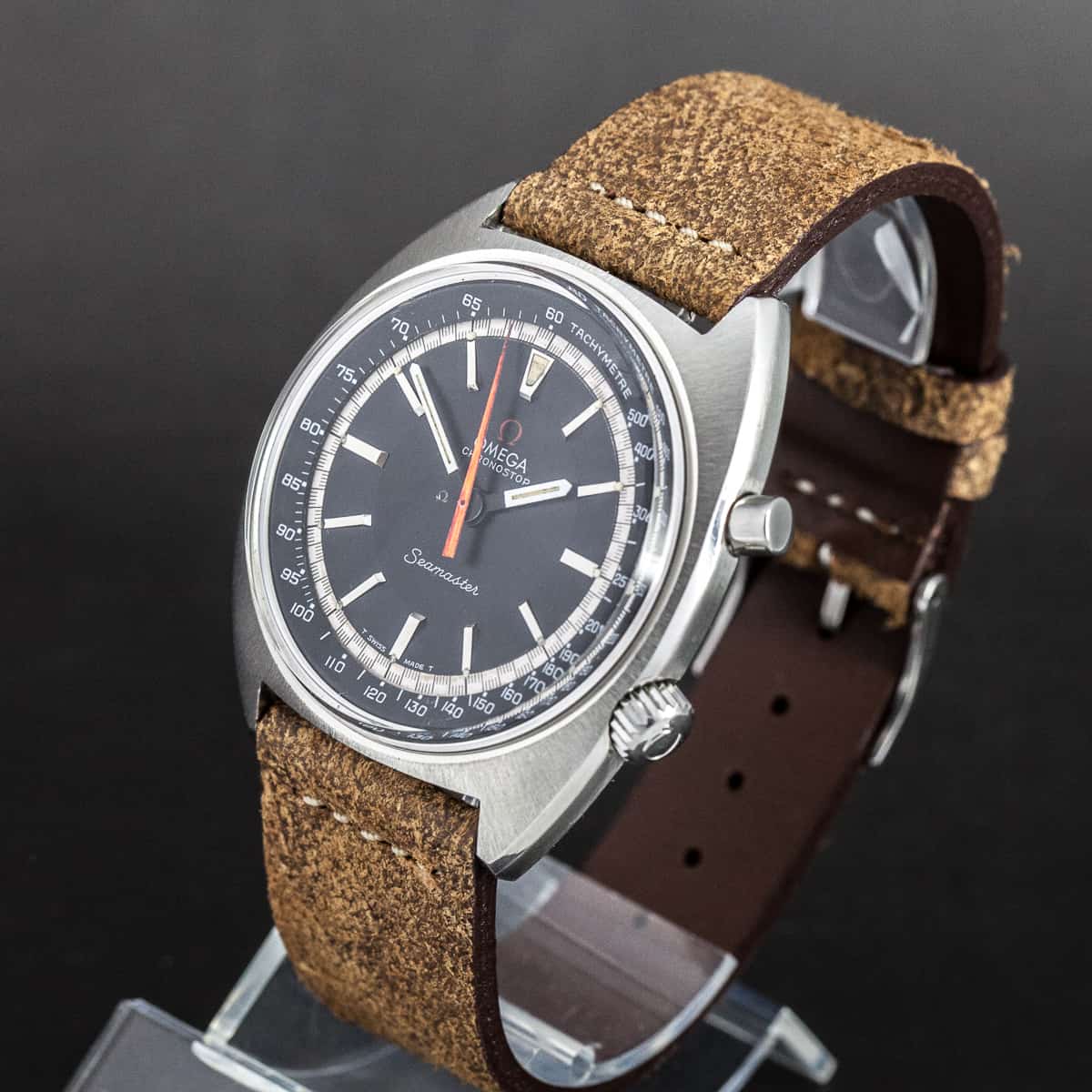 Omega Chronostop Jumbo ref.145.007 vuodelta 1968. Erittäin hyväkuntoinen yksilö. Manuaalivetoinen yhden painimen kronografi cal.865. Koneisto on variaatio tunnetusta cal.861 kuukellon koneistosta. Käsin tehty nahkaranneke, saatavana myös Omegan metalliranteella.