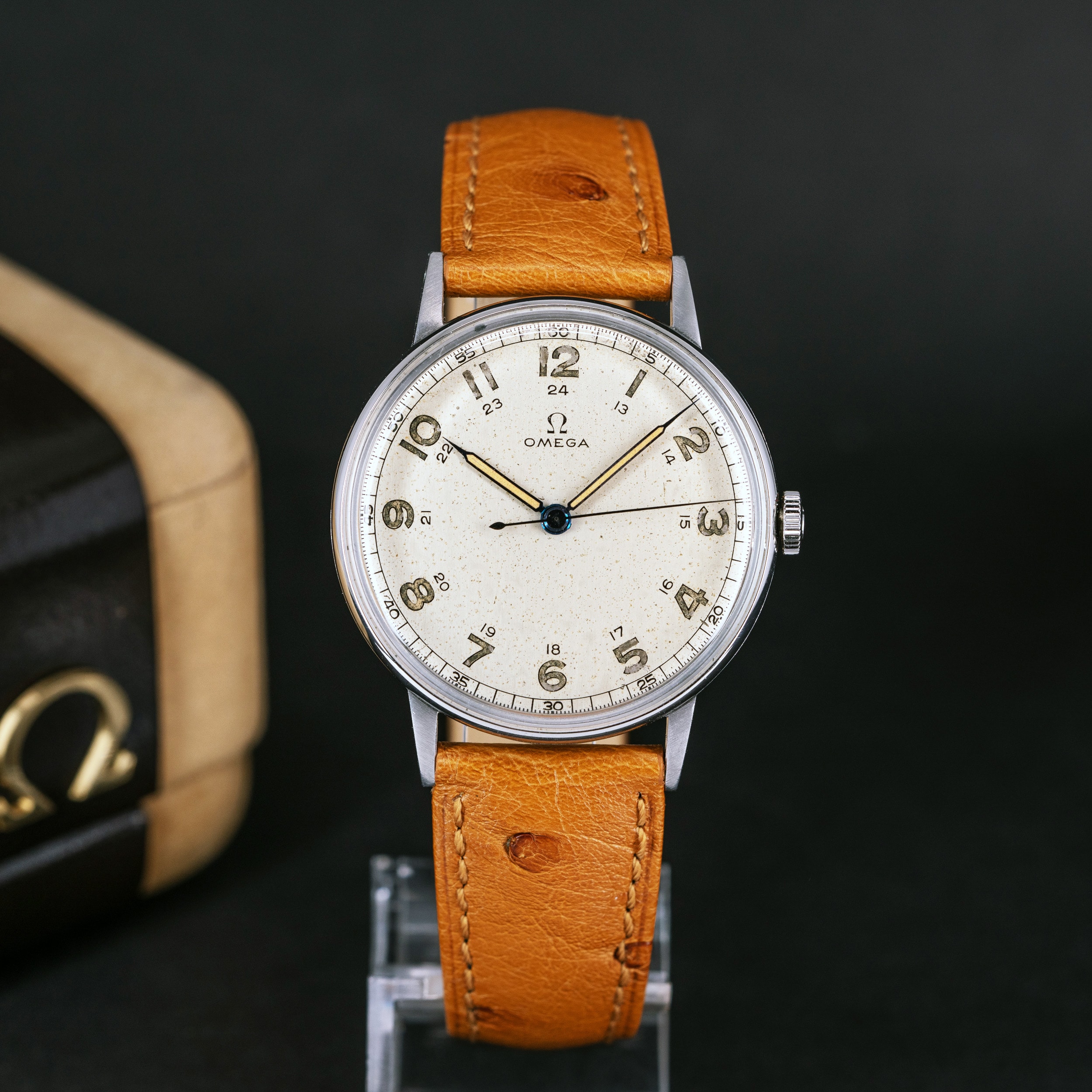Harvinainen ja suurikokoinen Omega CK2325 vuodelta 1943. Kellossa on kauniisti ikääntynyt hopeoitu kellotaulu arabialaisilla numeroilla ja Double-Boy tyyppiset sinistetyt teräs osoittimet. Teräskuori on hyvässä kunnossa. Kuoren halkaisija on 37 mm.