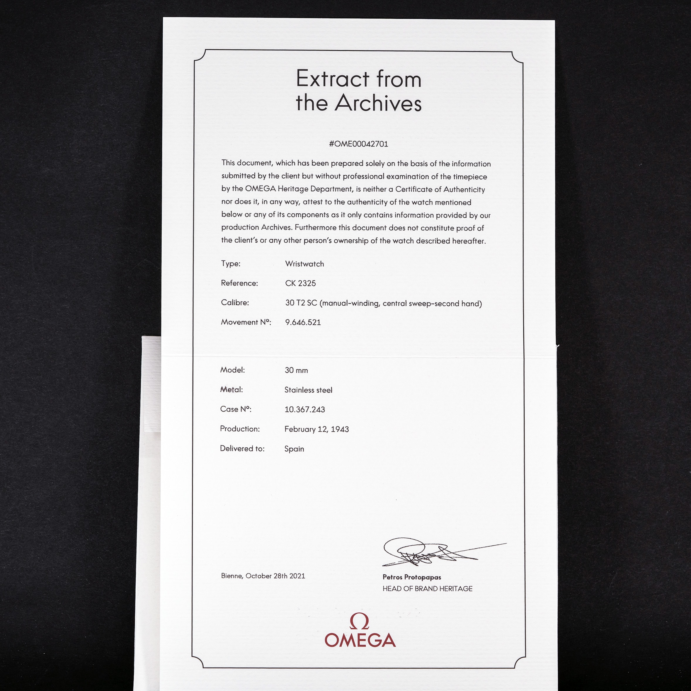 Kellon mukana tulee Omegan museon Extract-from-Archives todistus jonka mukaan kello on toimitettu Espanjaan helmikuussa 1943.