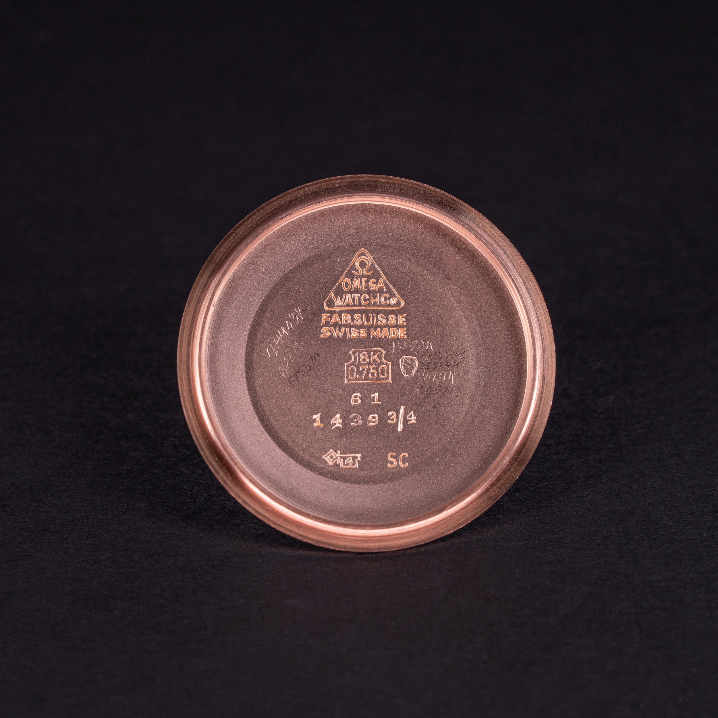 Kellon takapohjan sisäpuolella (kuva) on Omegan tunnukset, pitoisuusleima 18k/0,750, vuosileima 61 (1961) ja kuoren valmistajan avainleima (makers mark), jossa on numero 4. Tämä viittaa Genevessä toimineeseen kuorivalmistaja Antoine Gerlache SA, joka oli erikoistunut kultakuorien valmistamiseen.