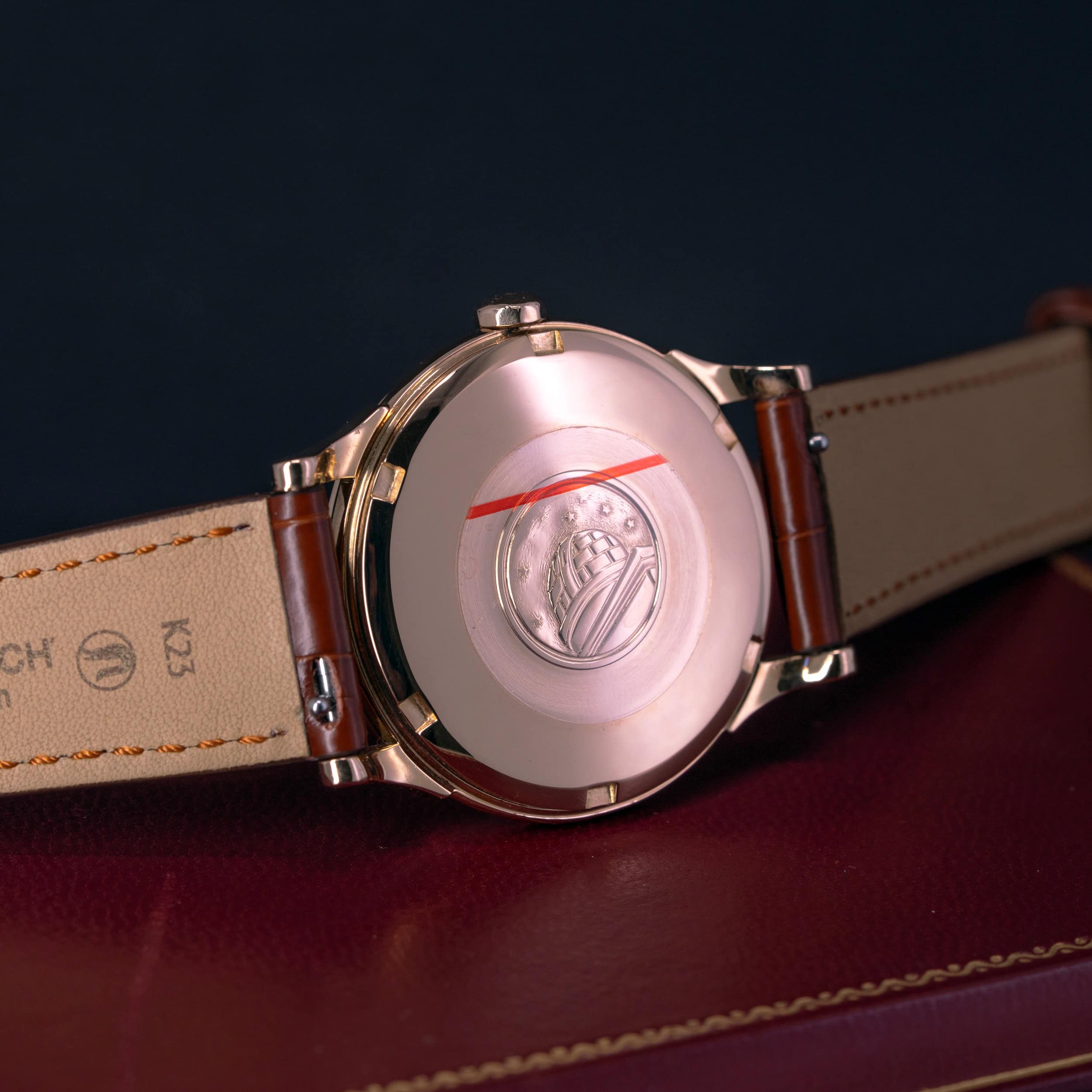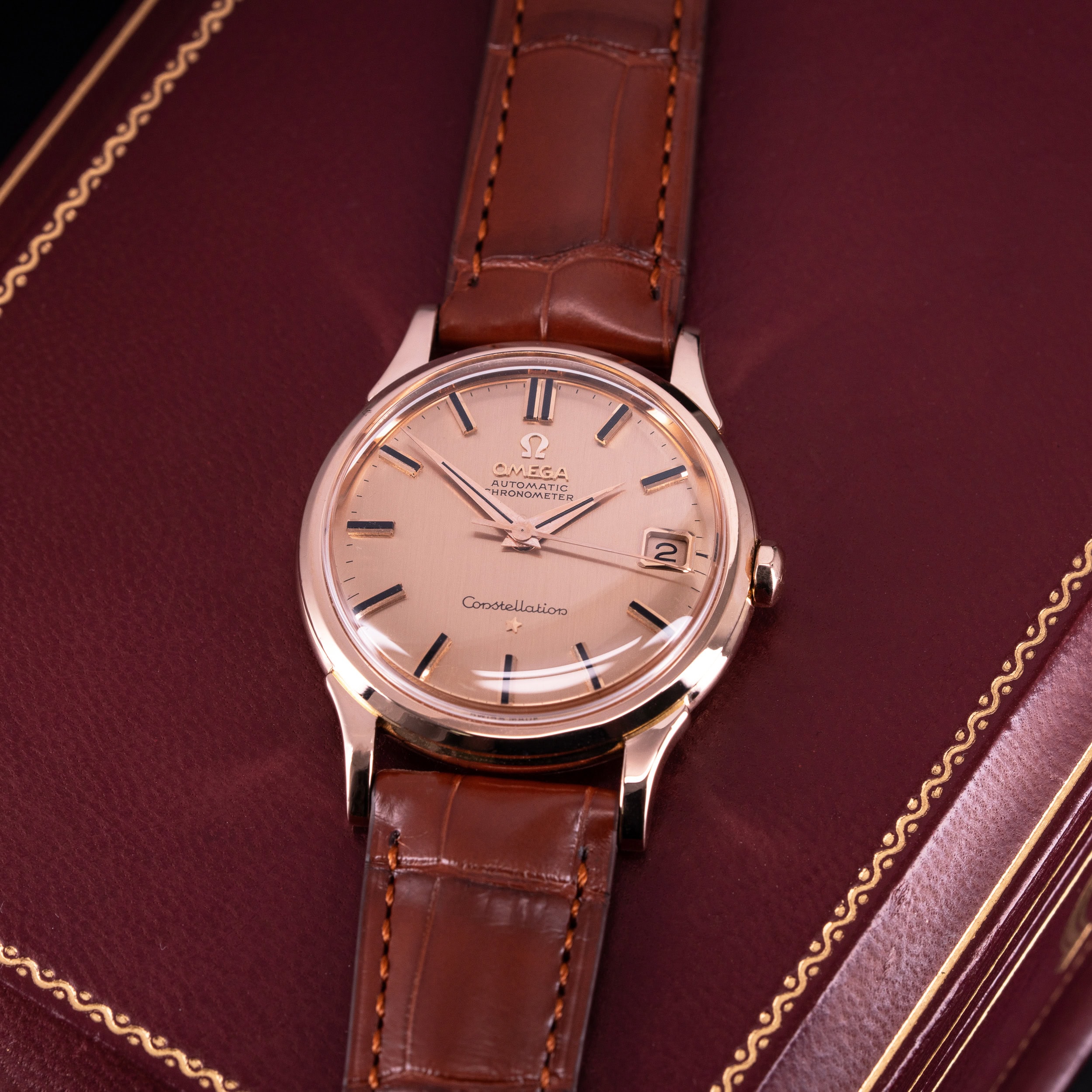 Tässä meidän kellossa on yksi harvinaisimmista yhdistelmistä. 18k punakultainen kuori ja 18k punakultainen kellotaulu/osoittimet. Näitä tunnetaan hyvin vähän ja harvinaisuuden vuoksi myös mallin arvo on normaaleja Constellation De-Luxe malleja suurempi.