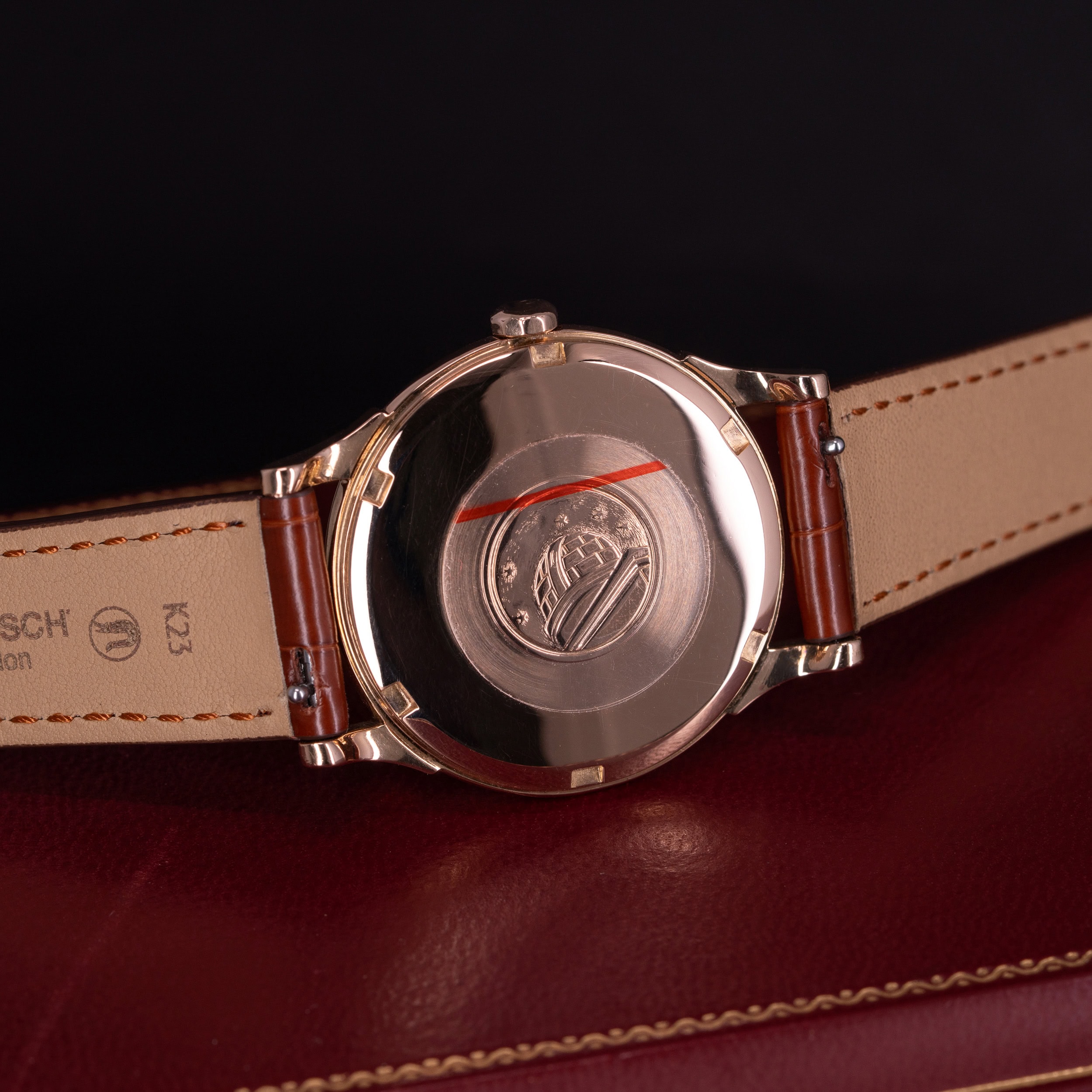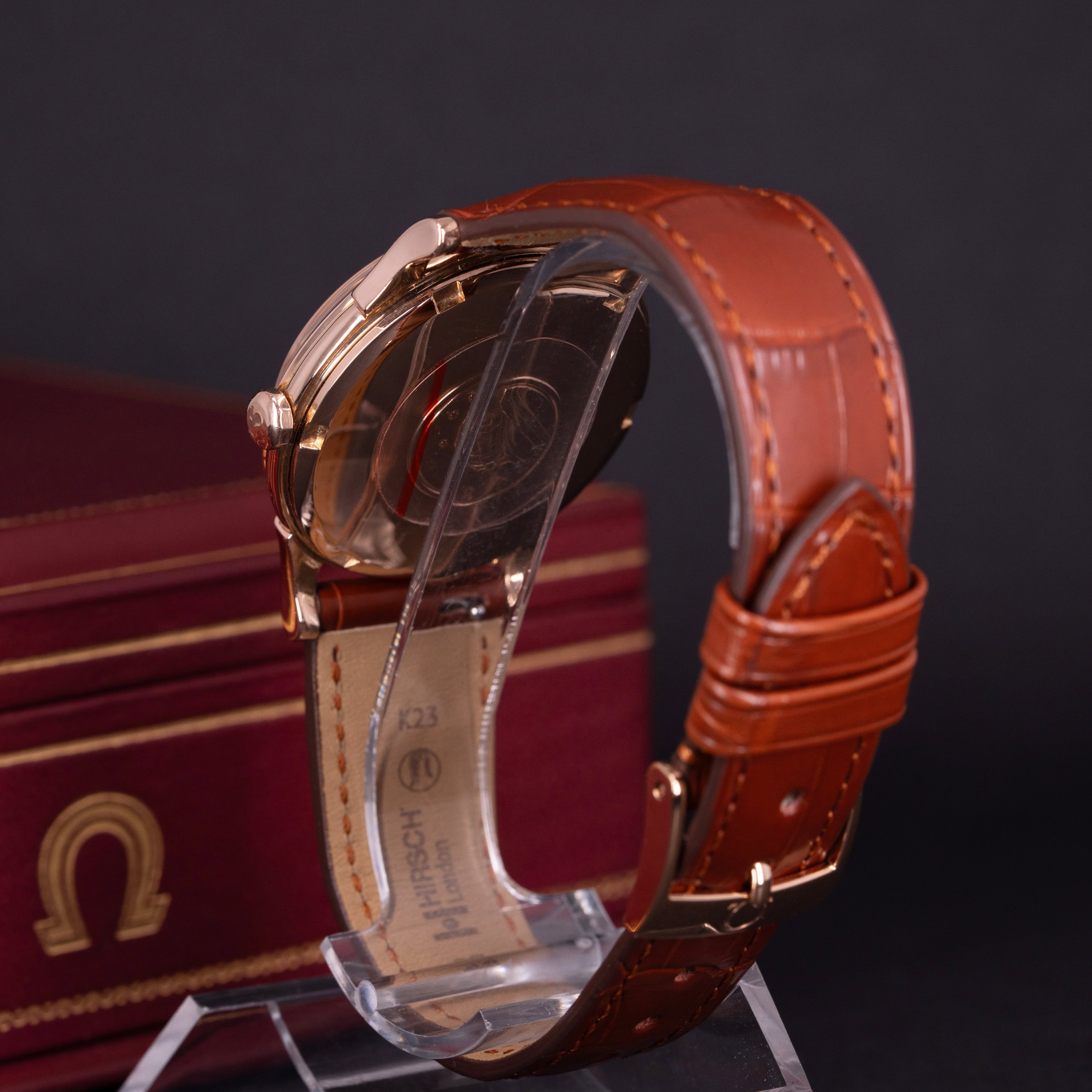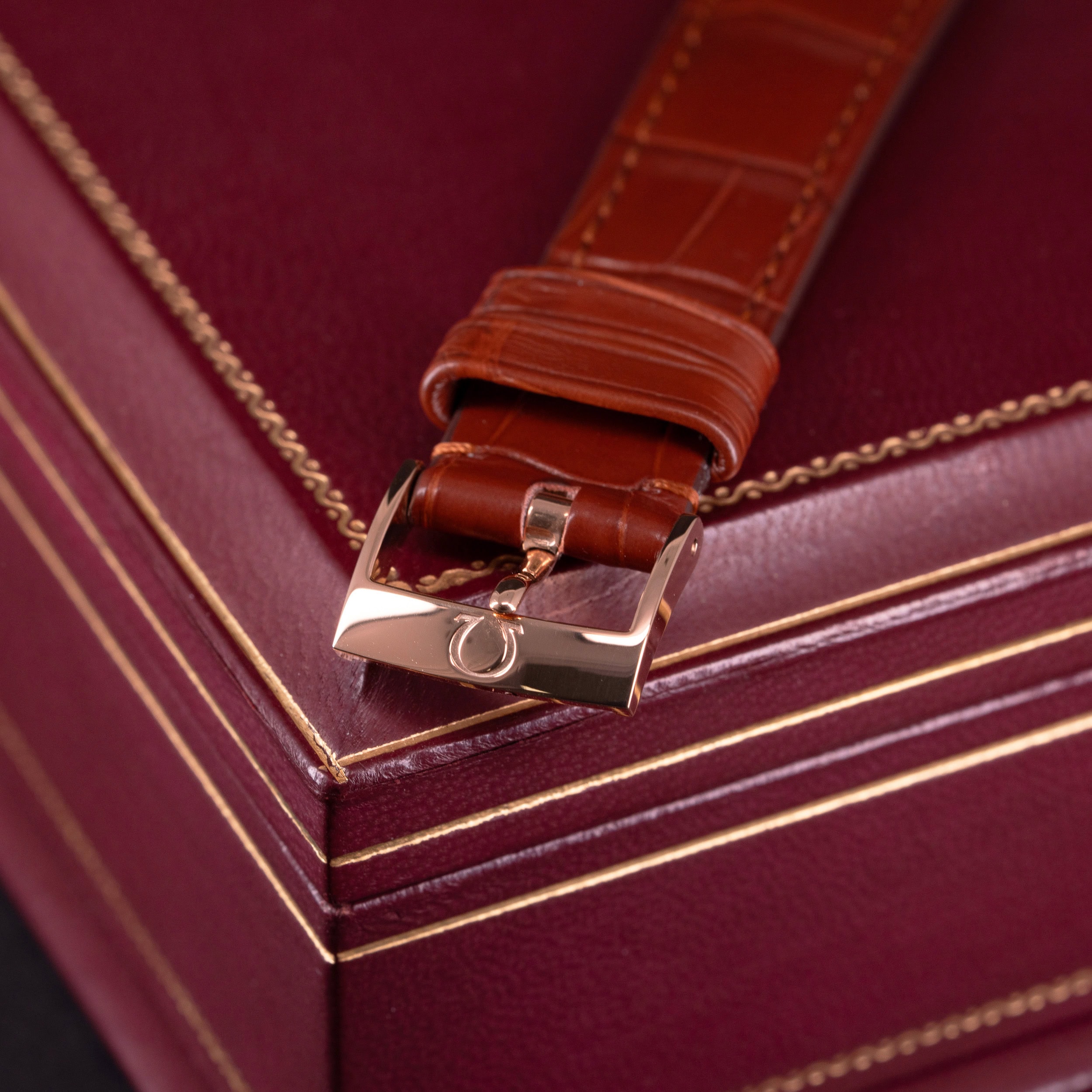 Alligaattorin nahkainen ranneke on Hirsch:n mallistosta ja ranteessa on Omegan punakullattu solki.