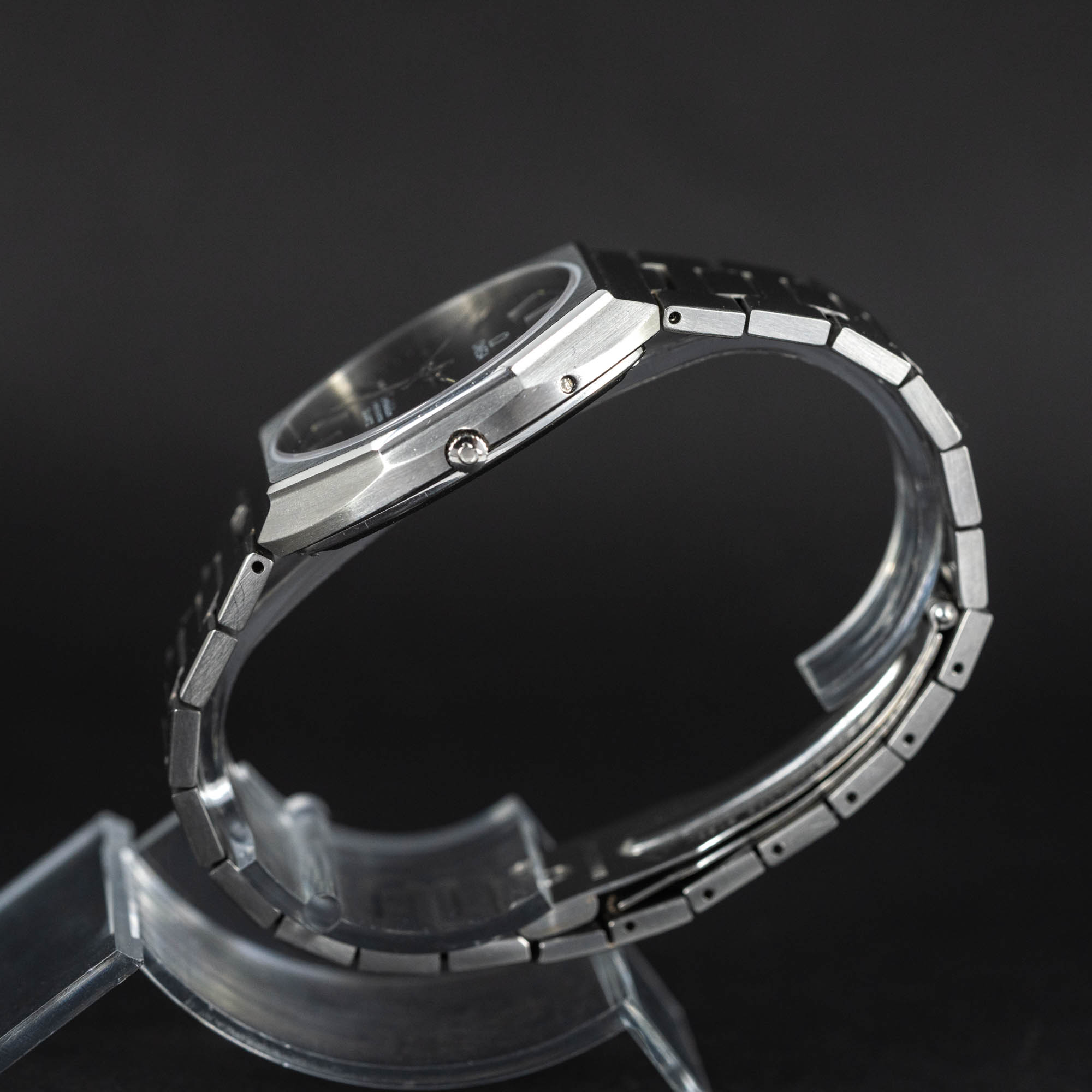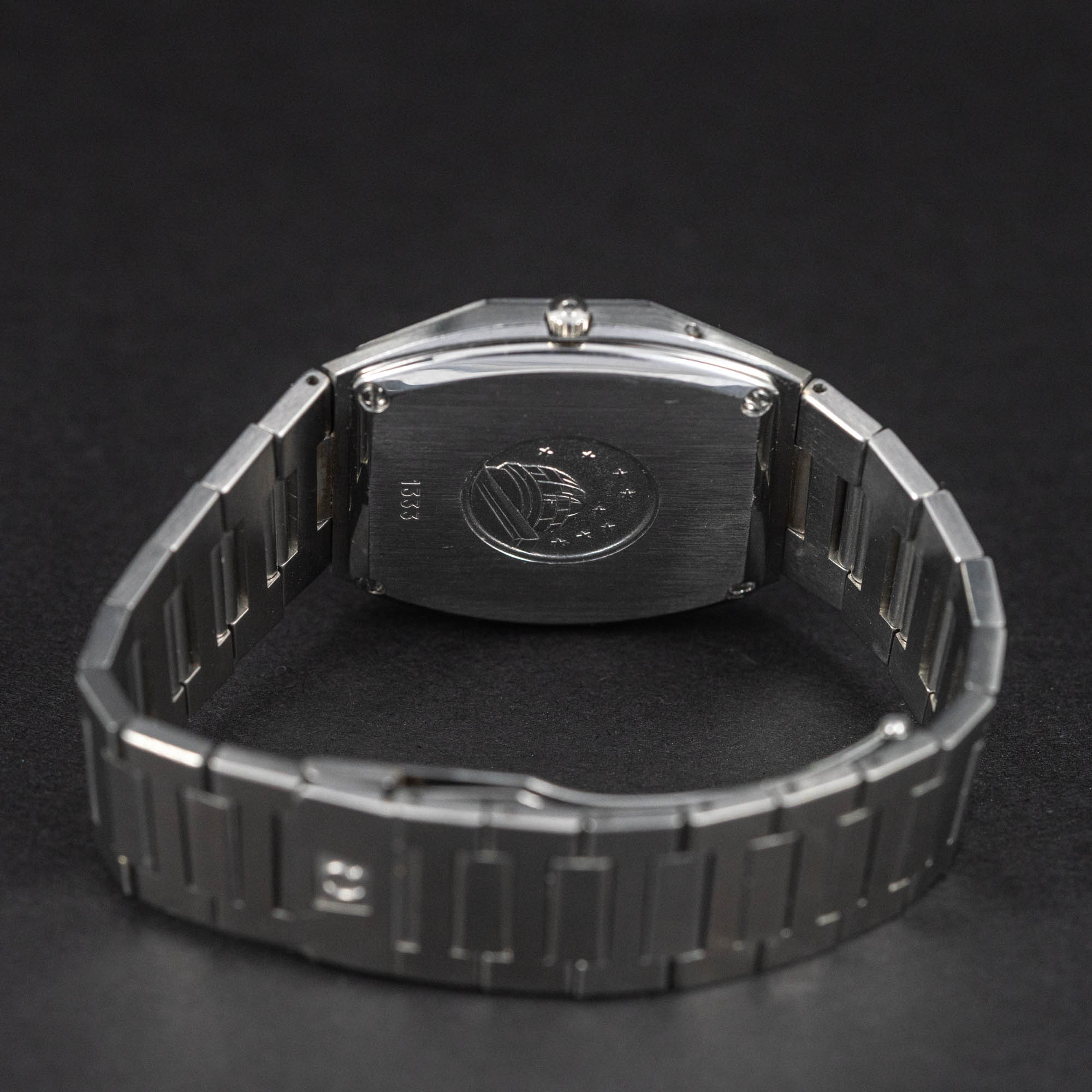 Harvinainen Omega Constellation Quarz ”Crystal” vuodelta 1977. Ref. 198.0122. Omegan ohut 6mm teräskuorinen rannekello. Tämä oli Omegan vuoden 1978 lippulaivamalli uusimmalla cal. 1333 kvartsikoneistolla. Alkuperäinen teräsranneke. Kuoren kaikki tiiviysosat on vaihdettu kello on roiskevesitiivis. Kuoren koko on n.34mm.