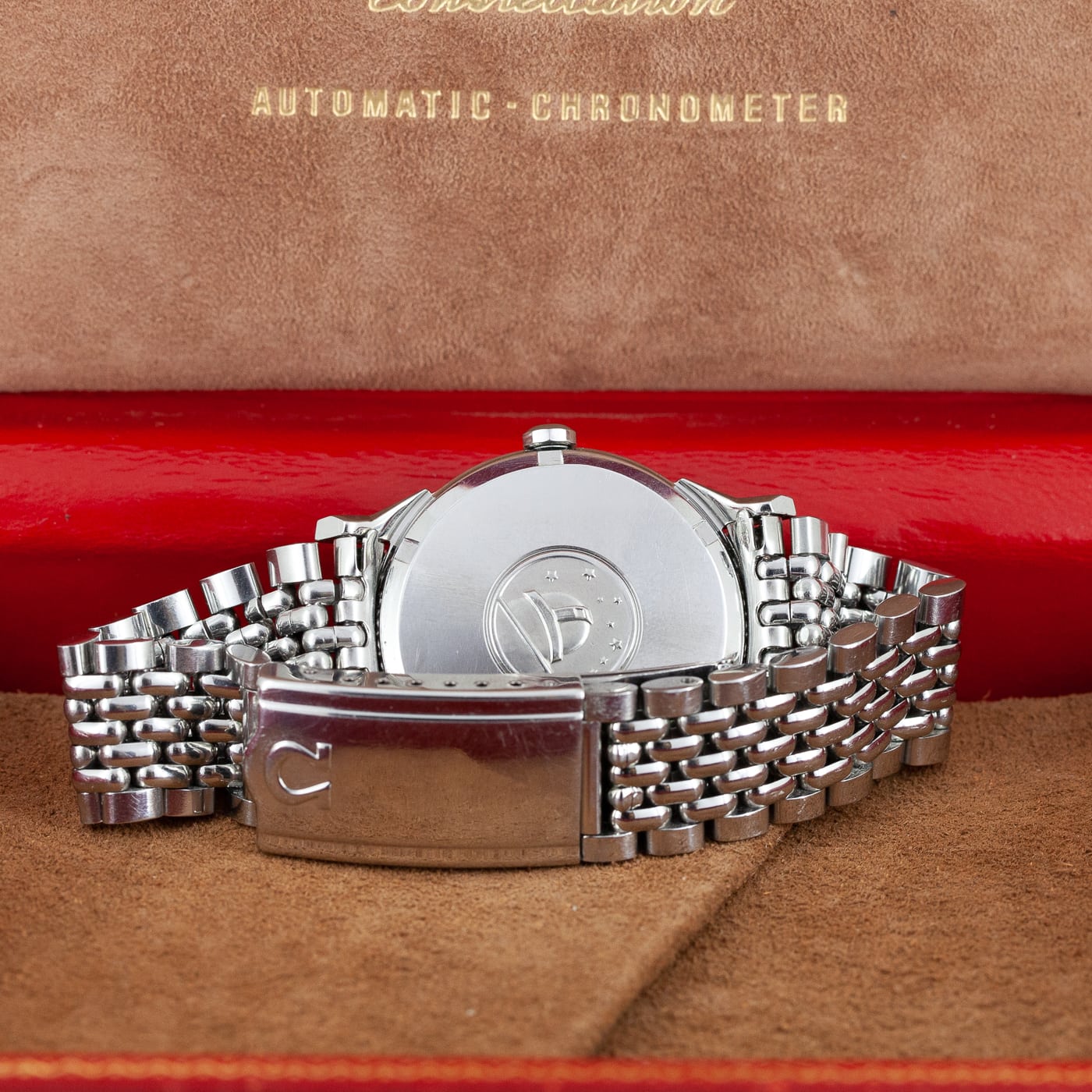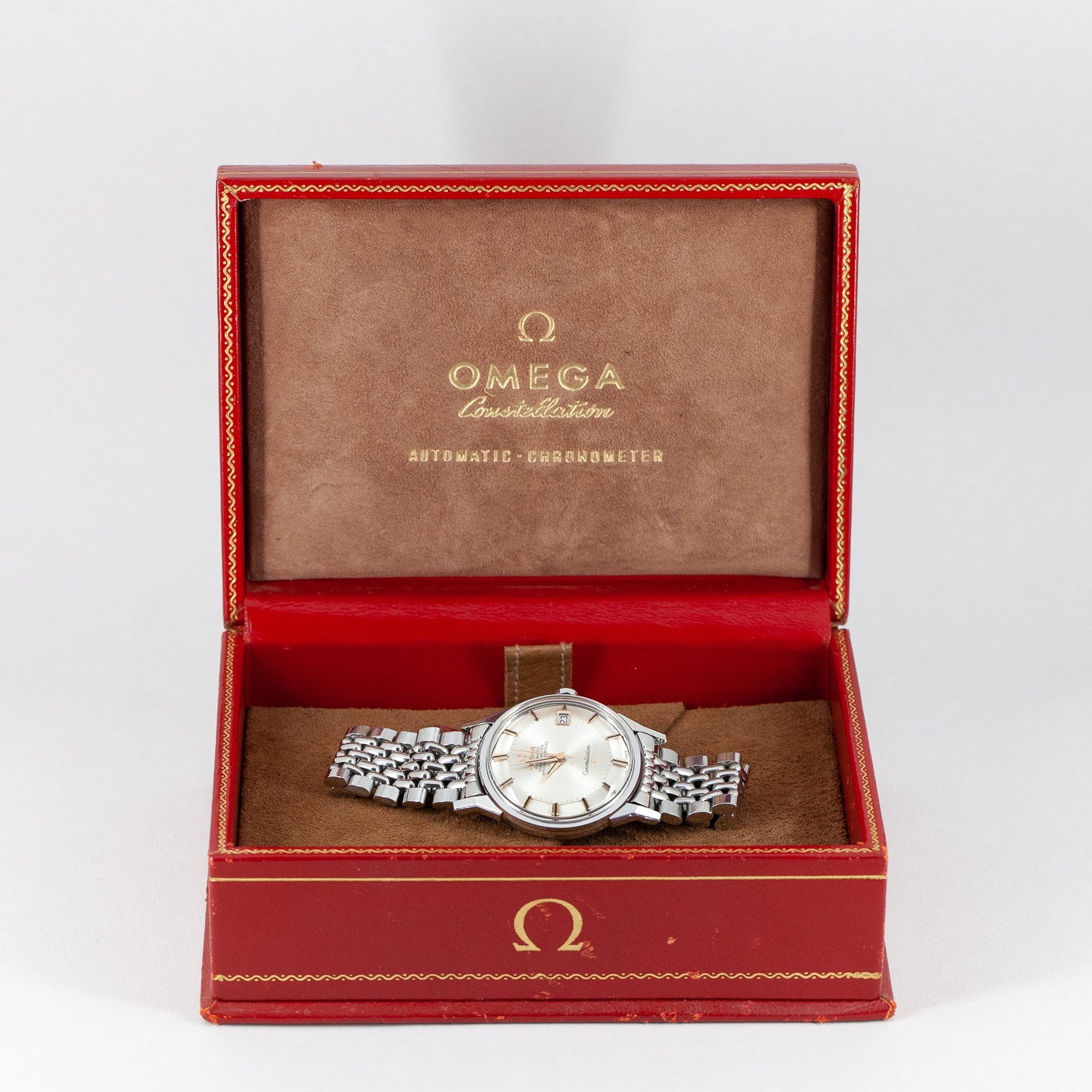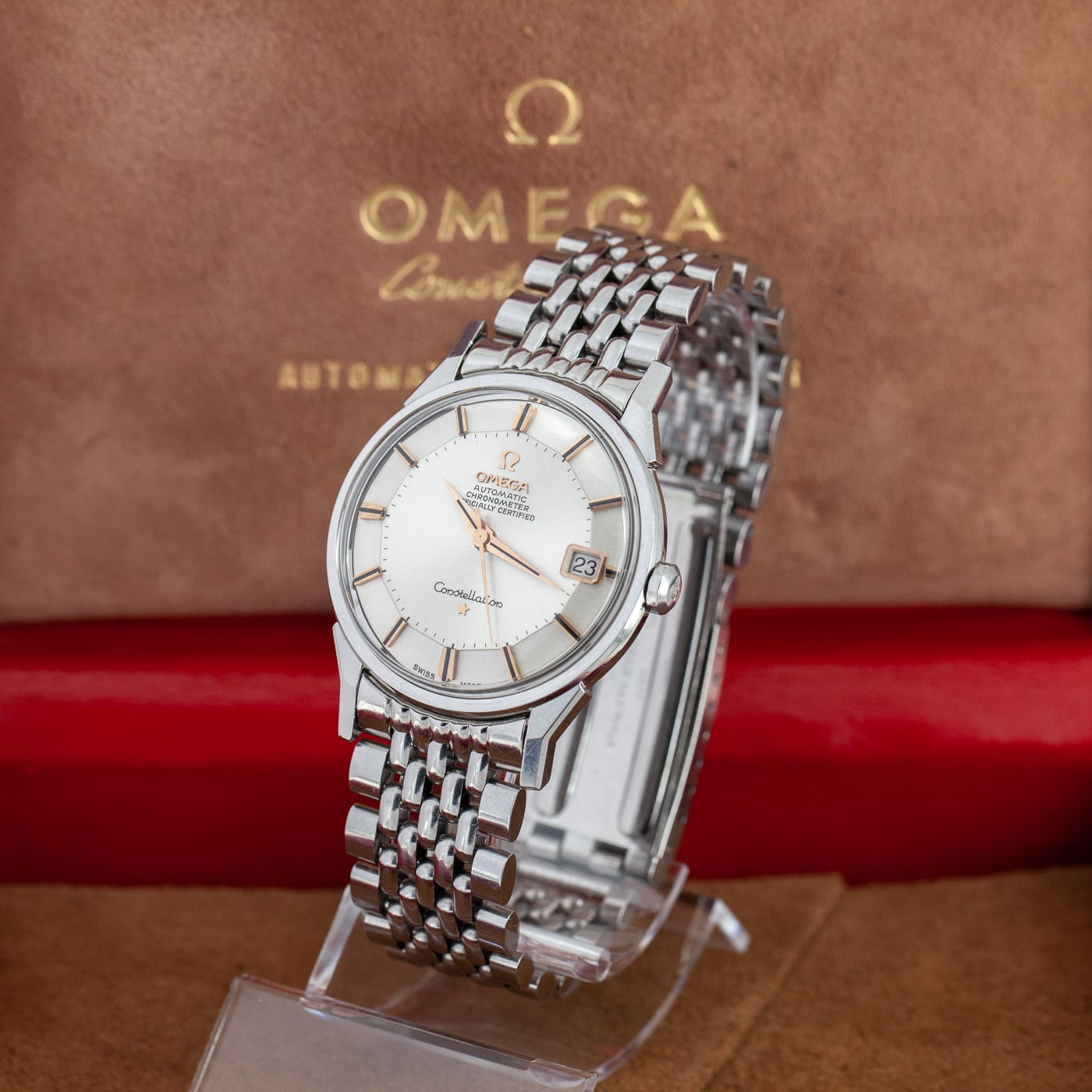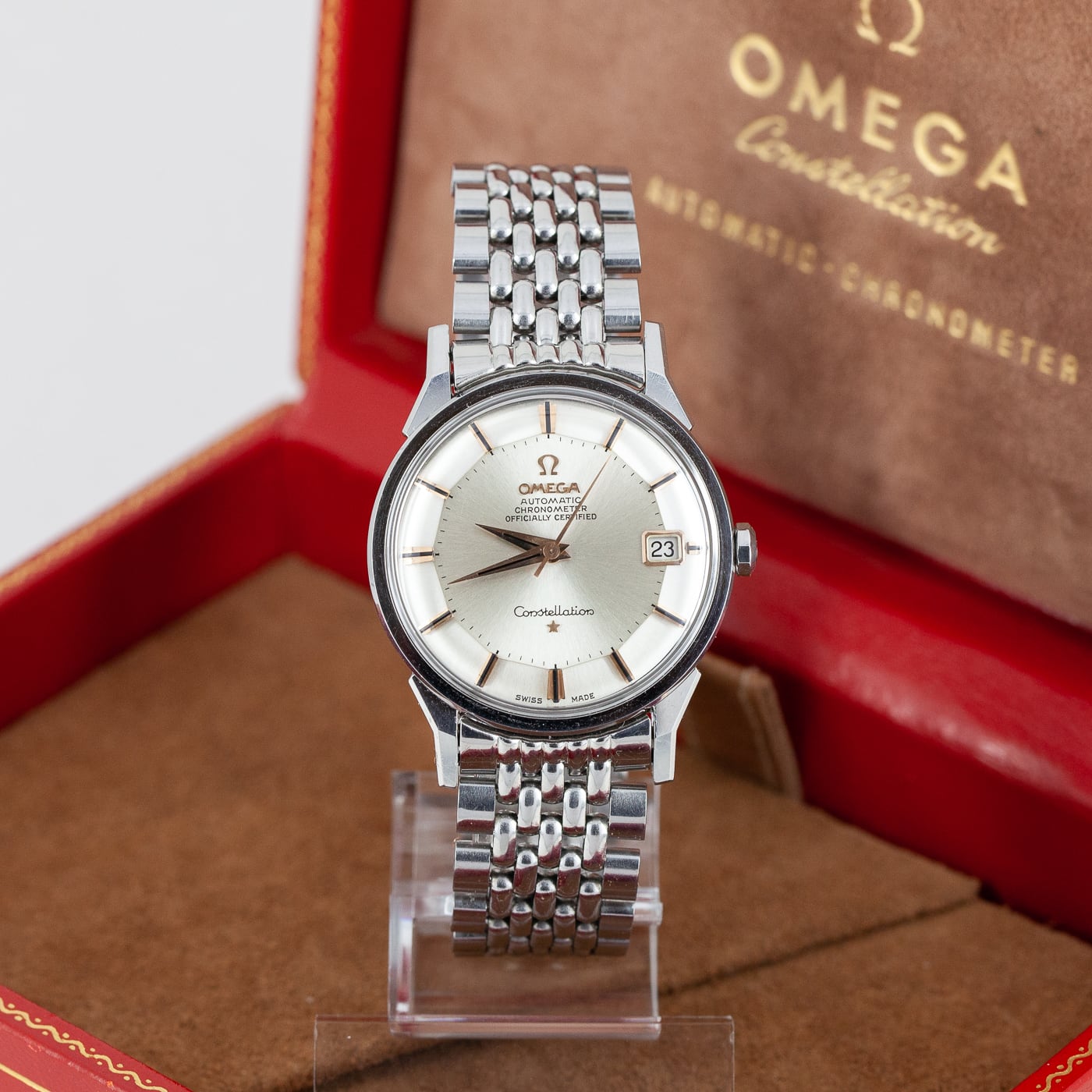 Harvinaisen hyväkuntoinen Omega Constellation ”Pie-Pan” vuodelta 1963. Virheetön hopeoitu kellotaulu punakultaisilla onyx-indekseillä ja punakultaiset osoittimet mustilla inserteillä. Kellon teräskuori on poikkeuksellisen hieno. Sitä ei ole koskaan hiottu/kiillotettu. Omgan harvinainen ”bead of rice” teräsranneke. Koneisto on juuri täysin huollettu. Kuoren koko 34mm.