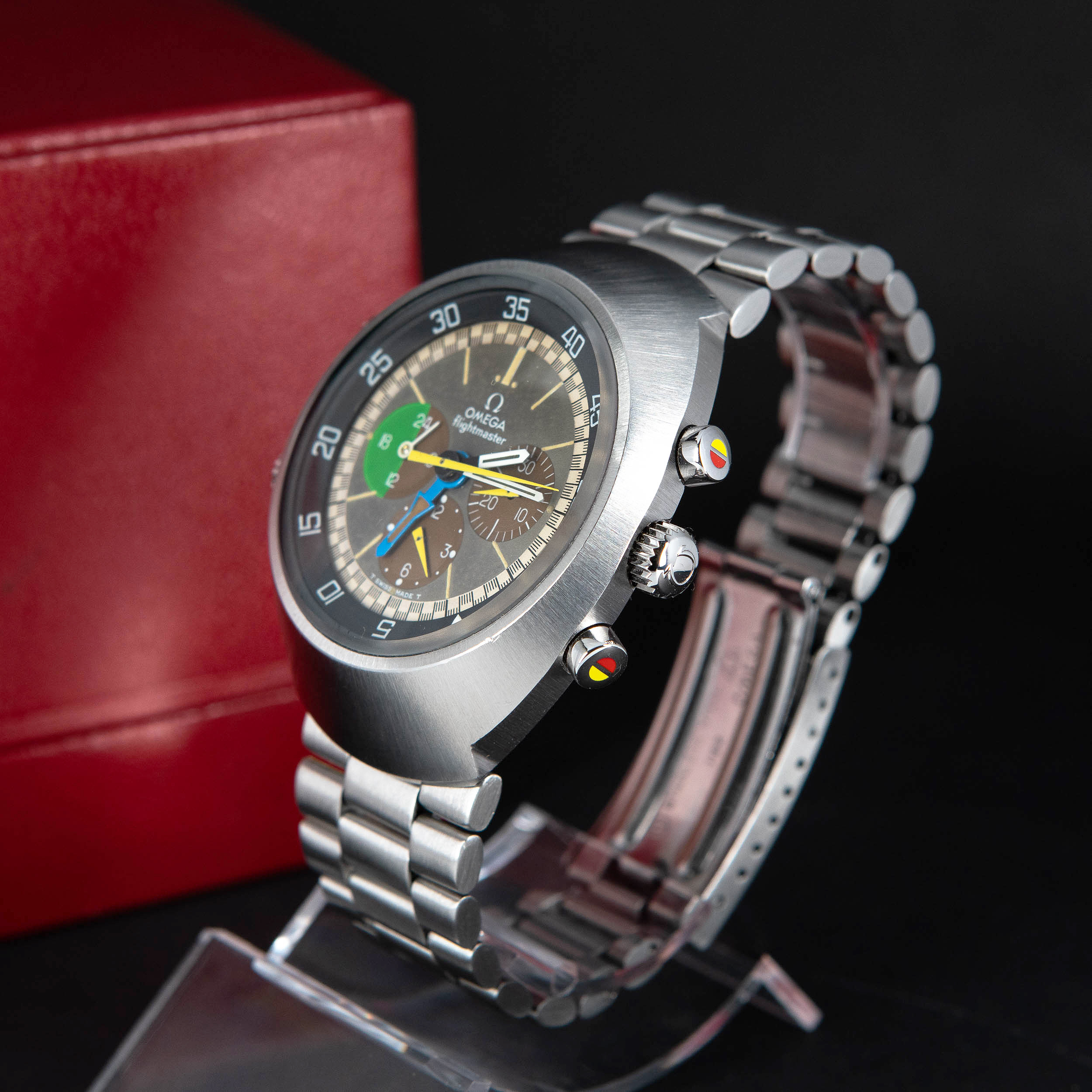 Harvinainen Omega Fightmaster ”Tropical” lentäjän rannekello vuodelta 1970. Ref. 145.013. Alkuperäinen tritium kellotaulu ja -osoittimet. Kellotaulu on ikääntynyt harmaasta ruskean eri sävyihin.