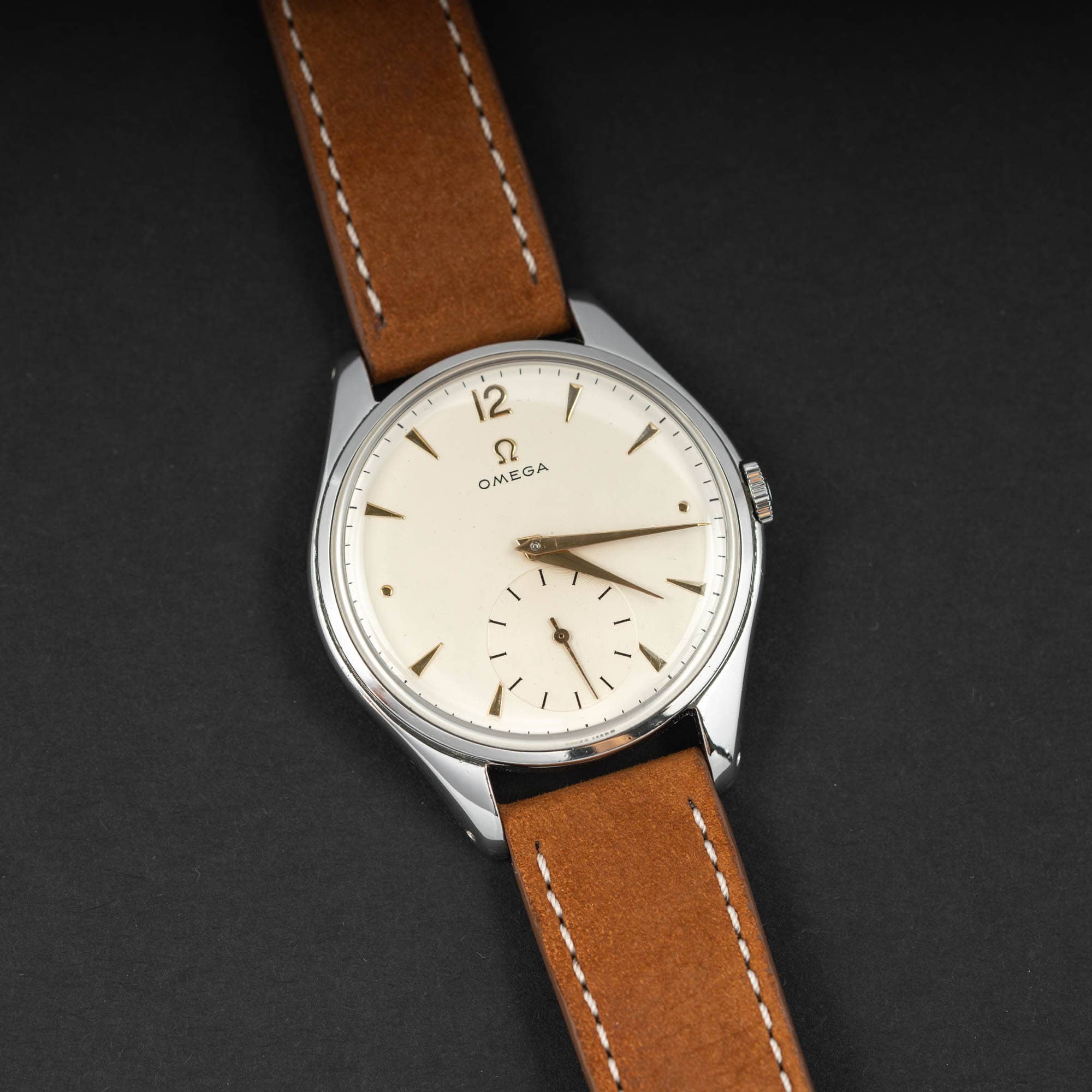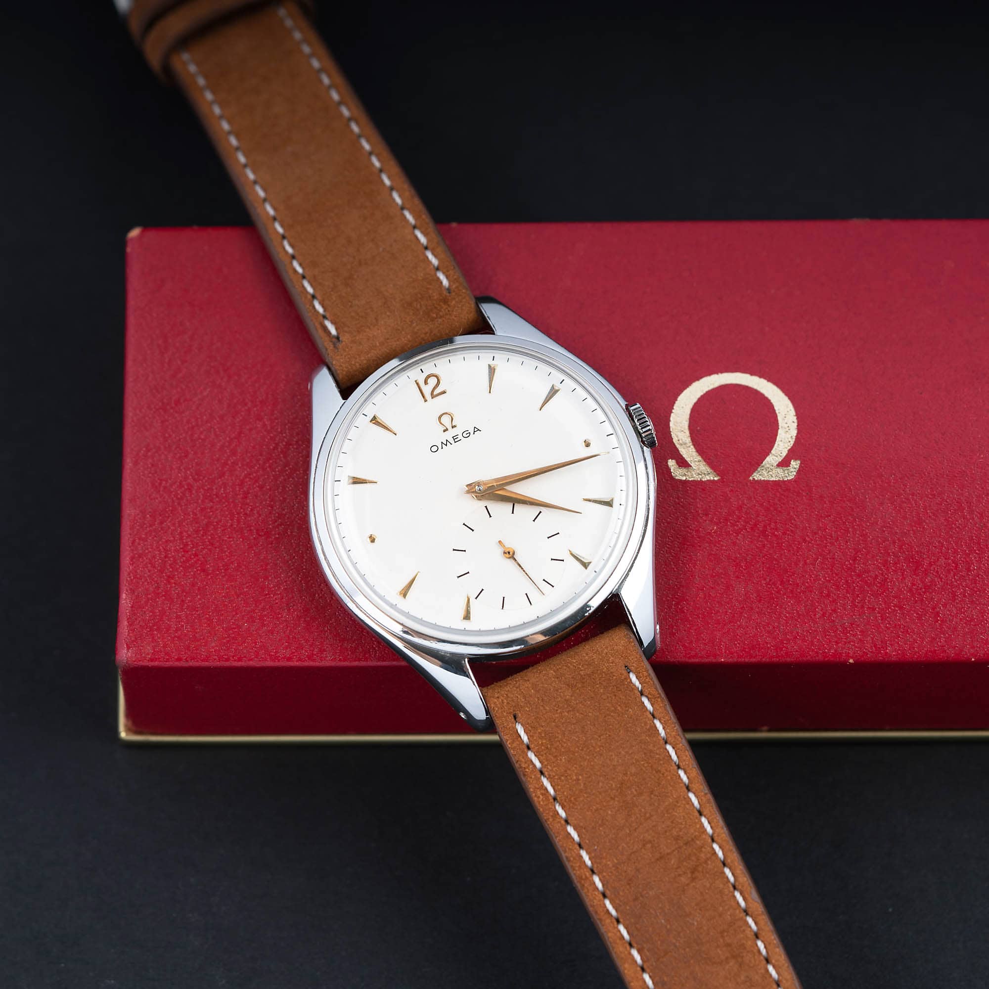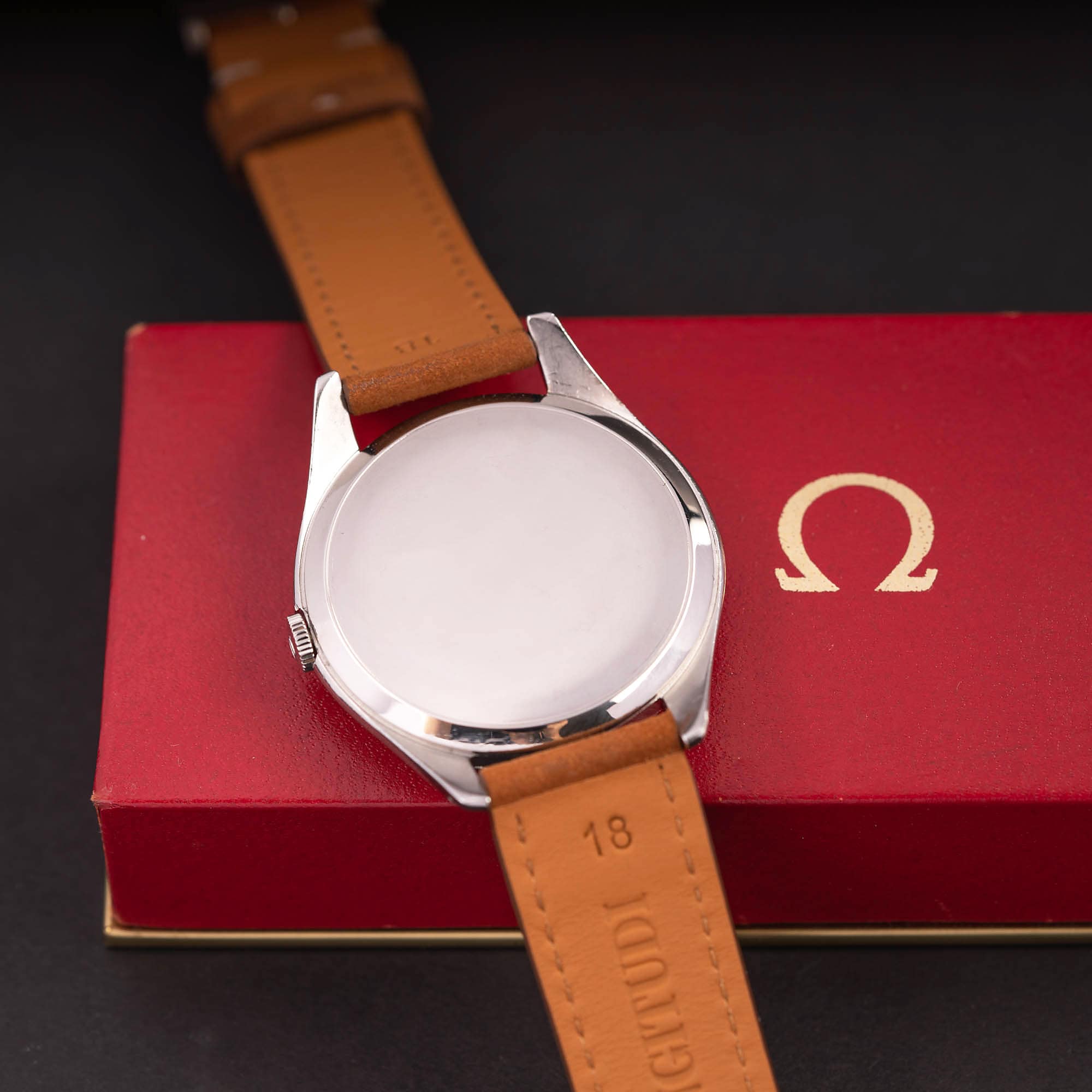 Harvinainen Omega Jumbo 2505 pukukello vuodelta 1954. Täydellisesti kunnostettu kokonaisuus. Alkuperäinen kunnostettu satiini-hopea kellotaulu ja kullatut osoittimet. Suurikokoinen Jumbo 37,5mm teräskuori on hienossa kunnossa. Omegan cal.266 manuaalivetoinen koneisto on kunnostettu ja toimii hyvin. Kellossa on korkealaatuinen käsin ommeltu nahkaranneke meidän omasta mallistosta.