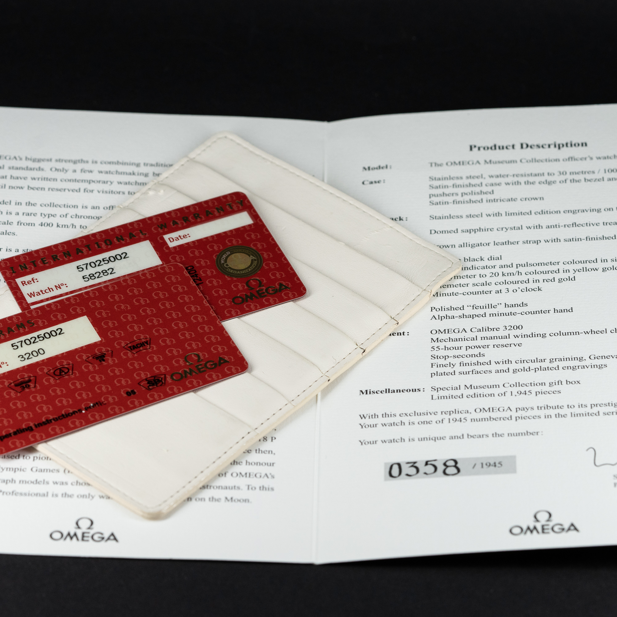 Harvinainen Omega Officers watch, Museum Collection no.3. Ref. 5702.50.02. Limited edition no. 358/1945. Full set, kaikki laatikot ja paperit. Kello on lähes käyttämätön alkuperäisellä Omegan alligaattori-nahkaranteella ja Omegan soljella. Kellossa on vain tätä kelloa varten luotu cal.3200 manuaaliviritteinen kronografikoneisto. Käyntivara 55h. Kuoren koko on 37.8mm.