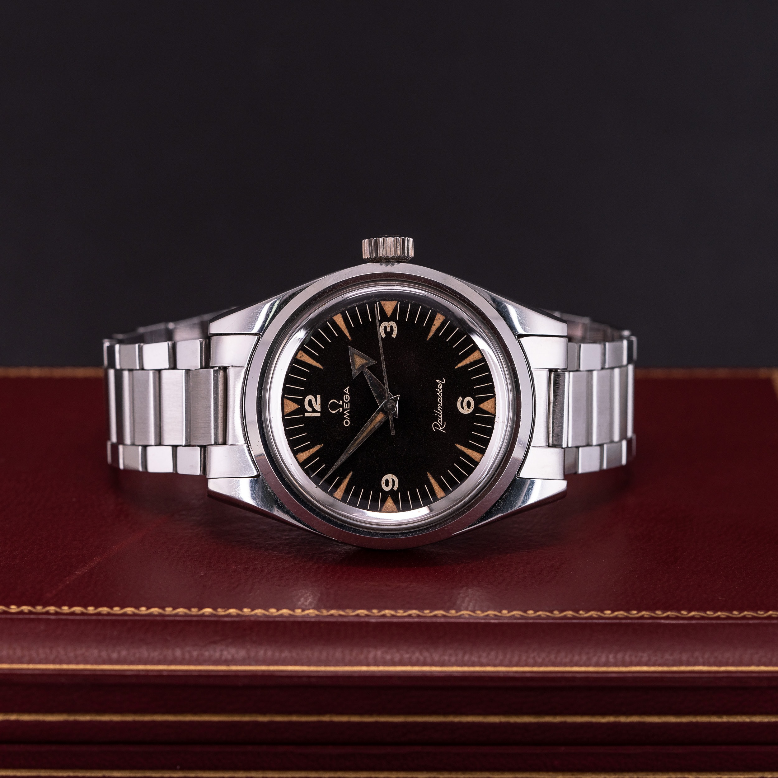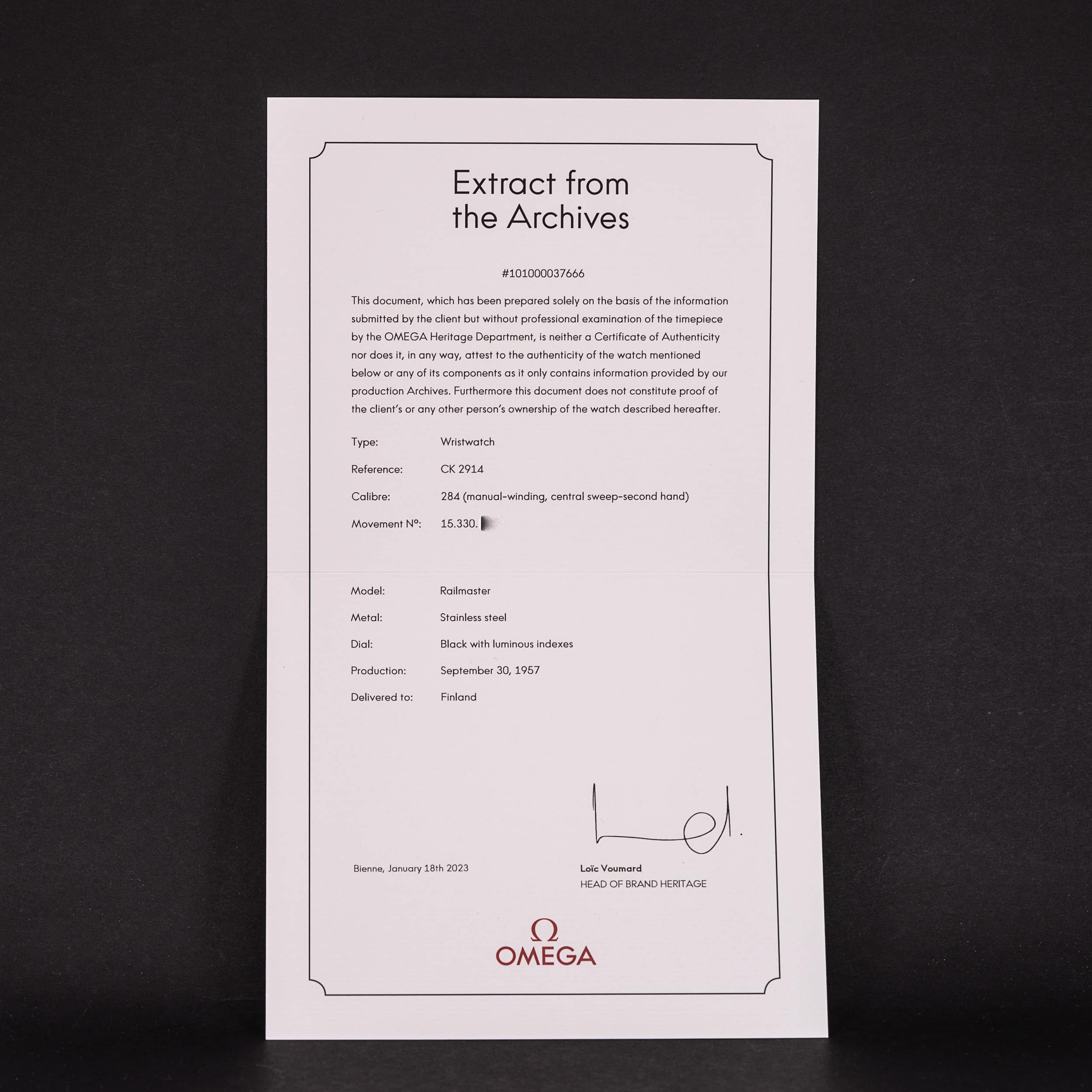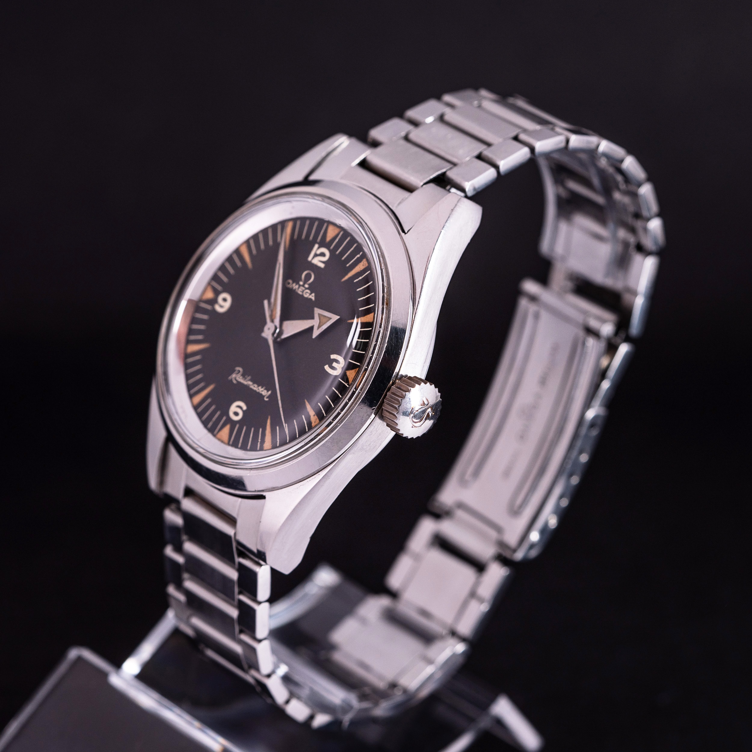 Hyvin harvinainen Omega Railmaster CK2914-1 antimagneettinen rannekello vuodelta 1957. Mukana tulevan Omegan sertifikaatin mukaan kello on toimitettu Suomeen syyskuussa 1957.