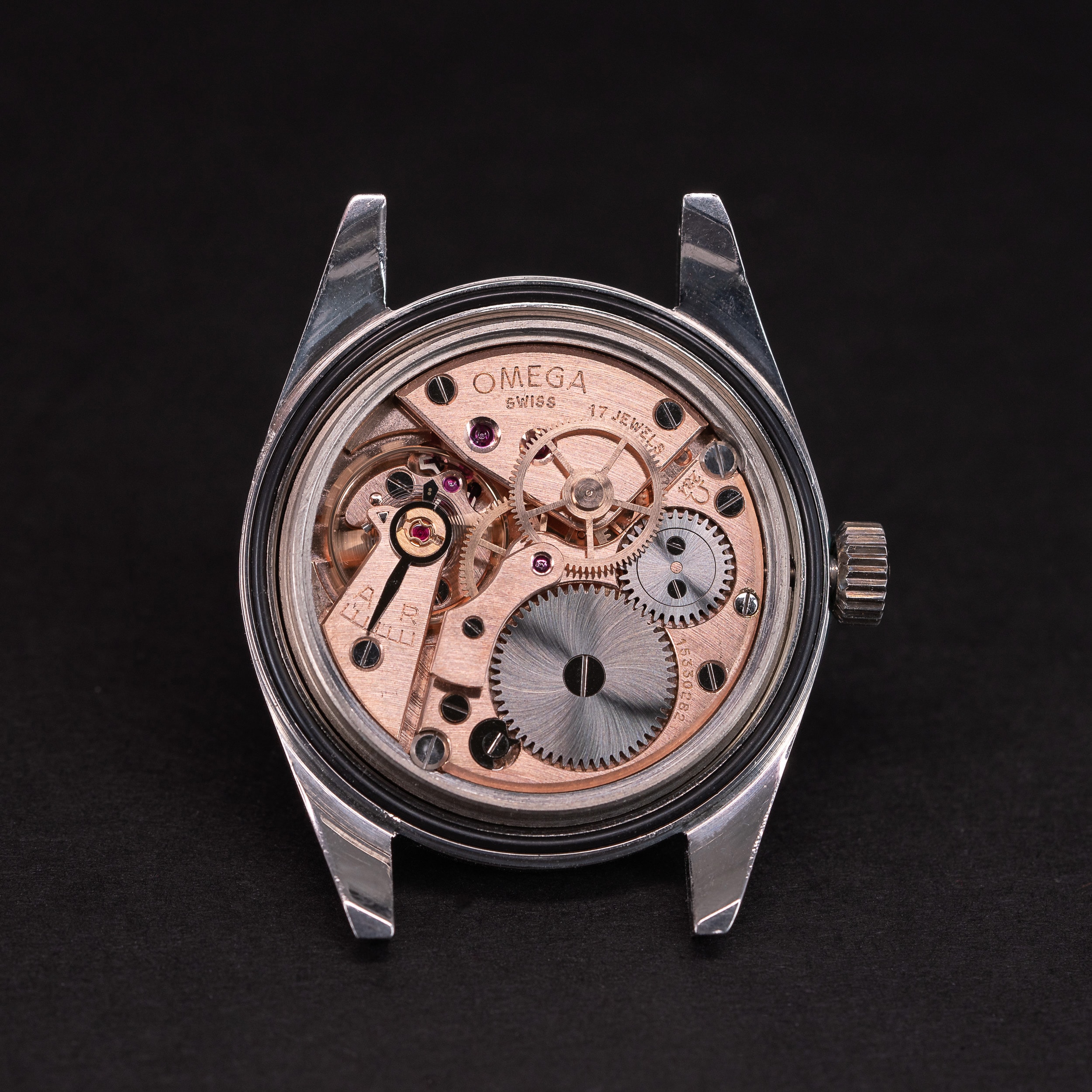 Omegan cal. 284 manuaalivetoinen koneisto on juuri täysin kunnostettu.