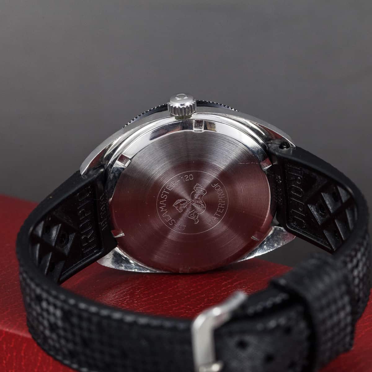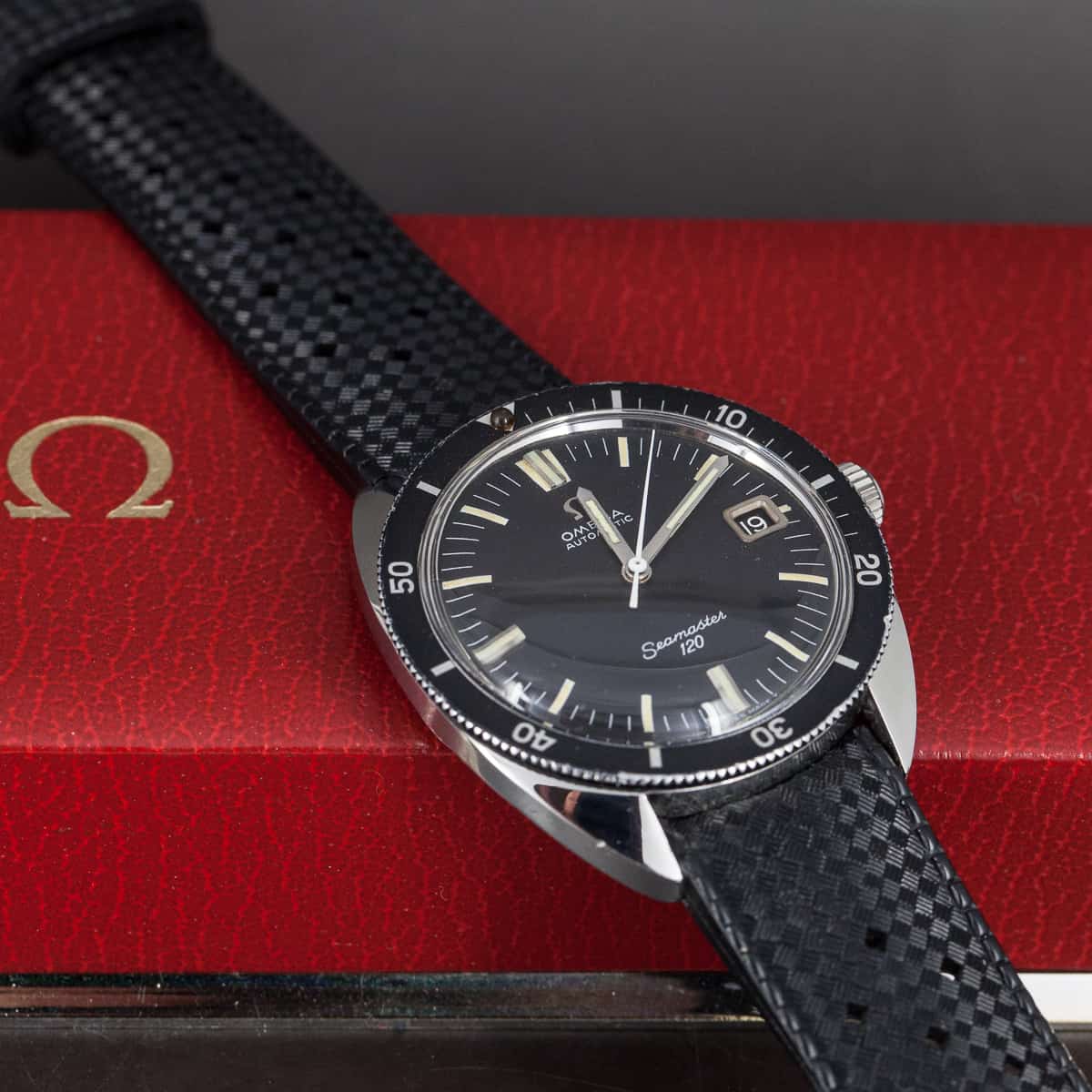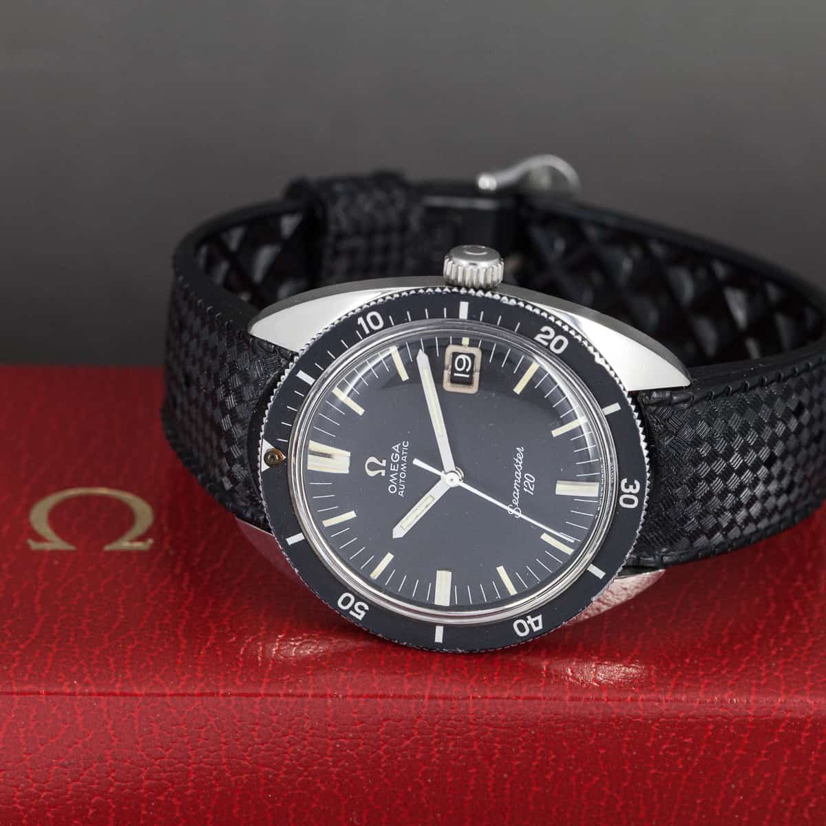 Harvinainen Omega Seamaster 120 sukeltajankello v.1968. Ref.166.027. Omegan cal.565 automaattikoneisto. Erittäin hyväkuntoinen ja alkuperäinen lasisarja ja kellotaulu. Kuoren koko 36mm. Ranneke on alkuperäinen ”tropic” kumiranneke.