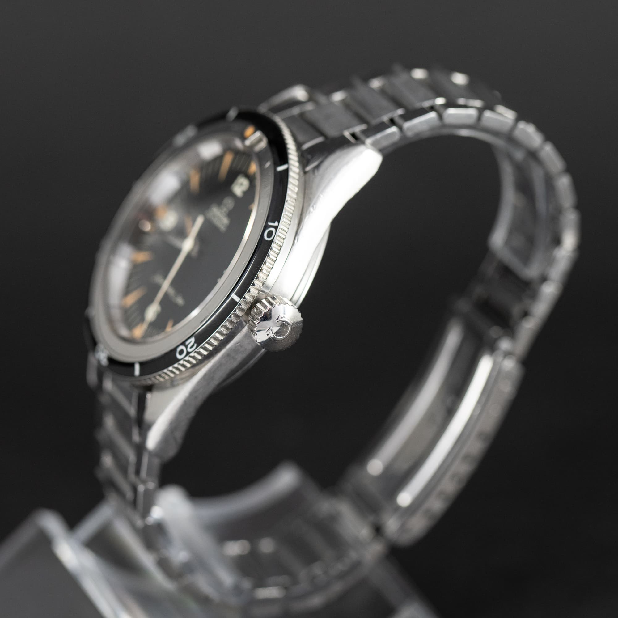 Hyvin harvinainen Omega Seamaster 300 Automatic ref.14755. Täysin alkuperäinen kokonaisuus. Lähes virheetön ja erittäin kaunis radium-lume kellotaulu ja osoittimet. Omegan alkuperäinen ja virheetön bakeliitti-bezel. Omegan cal. 552 automaattikoneisto on juuri kunnostettu. Nuppi on vaihdettu huollon yhteydessä. Hyväkuntoinen hiomaton teräskuori. Kuoren koko on 38,5mm.