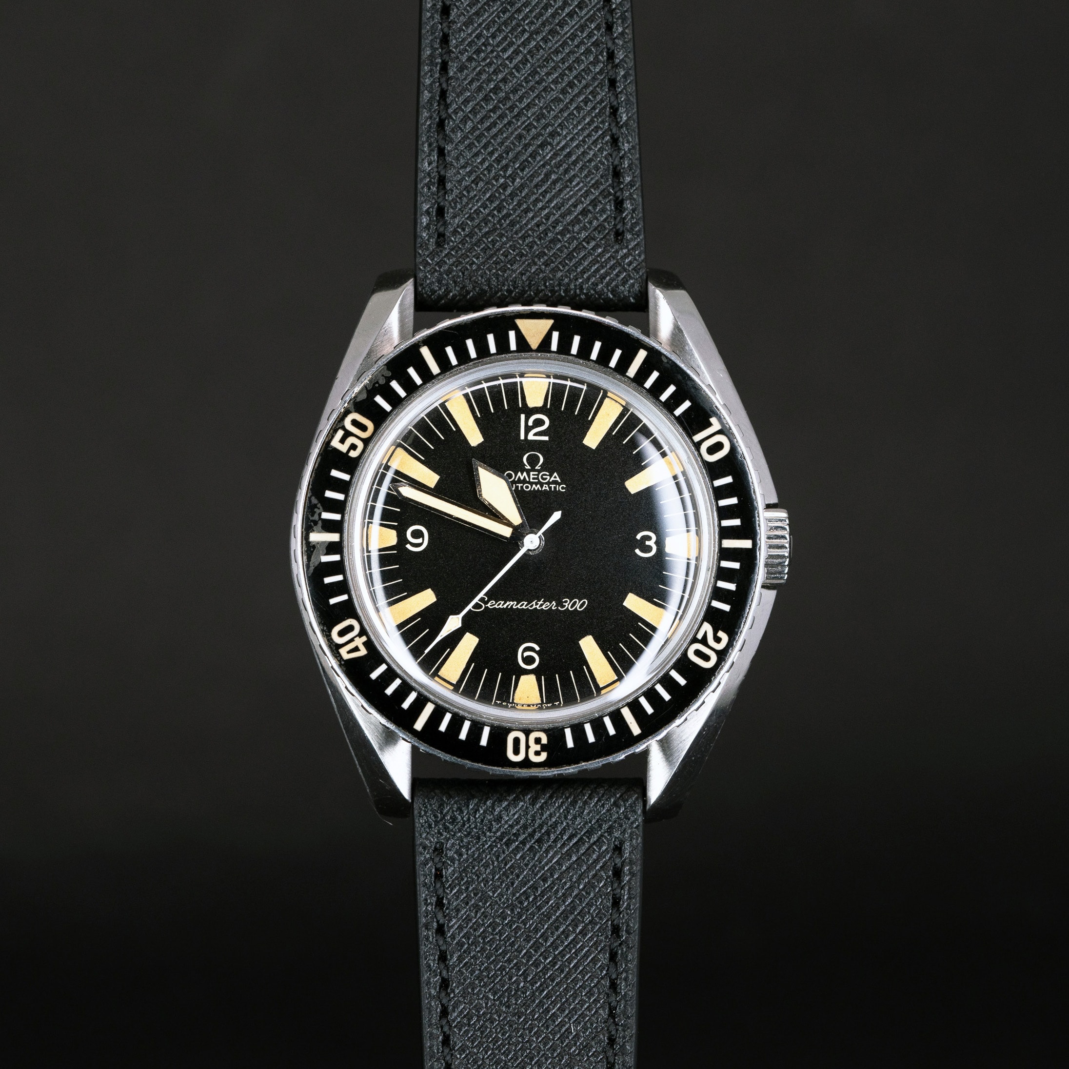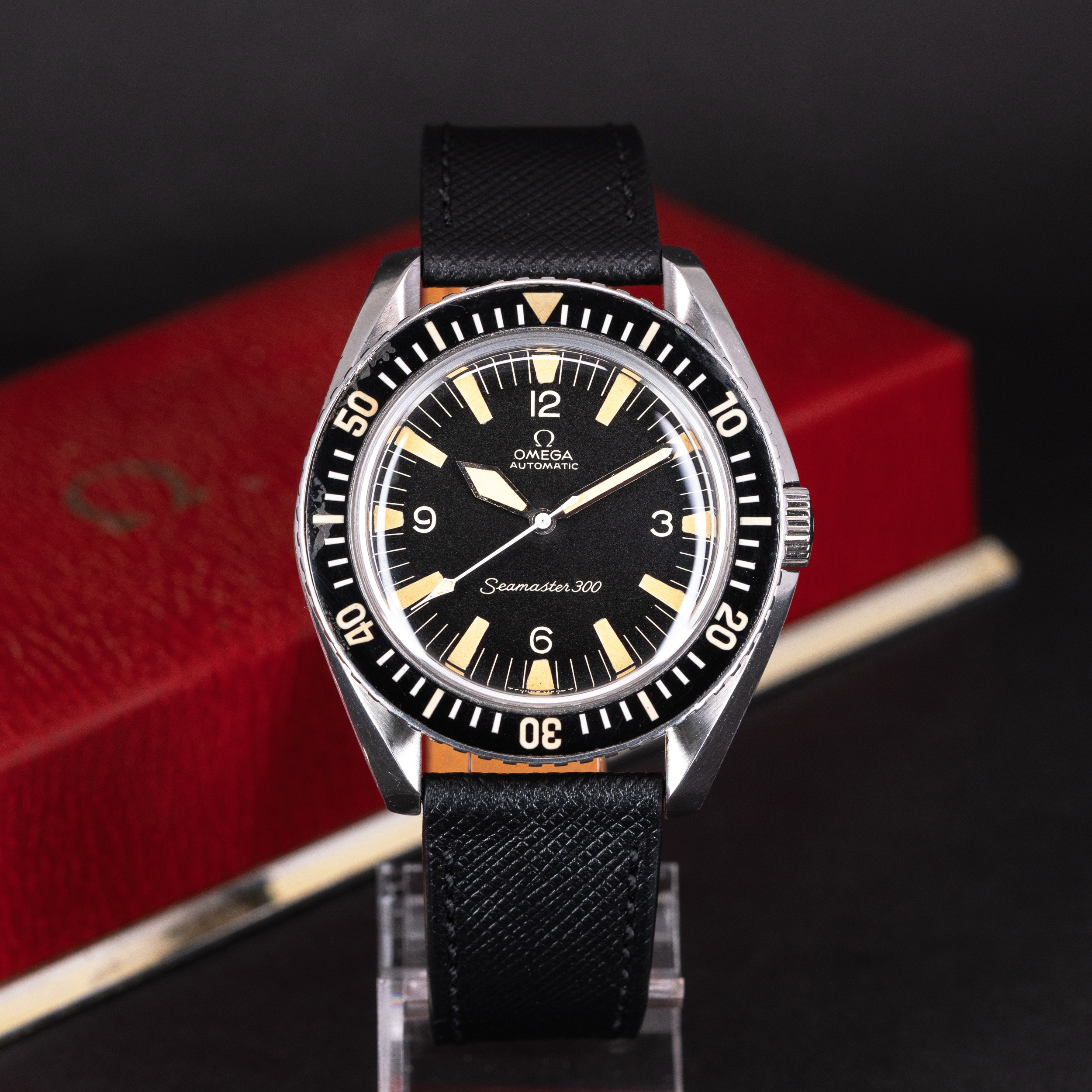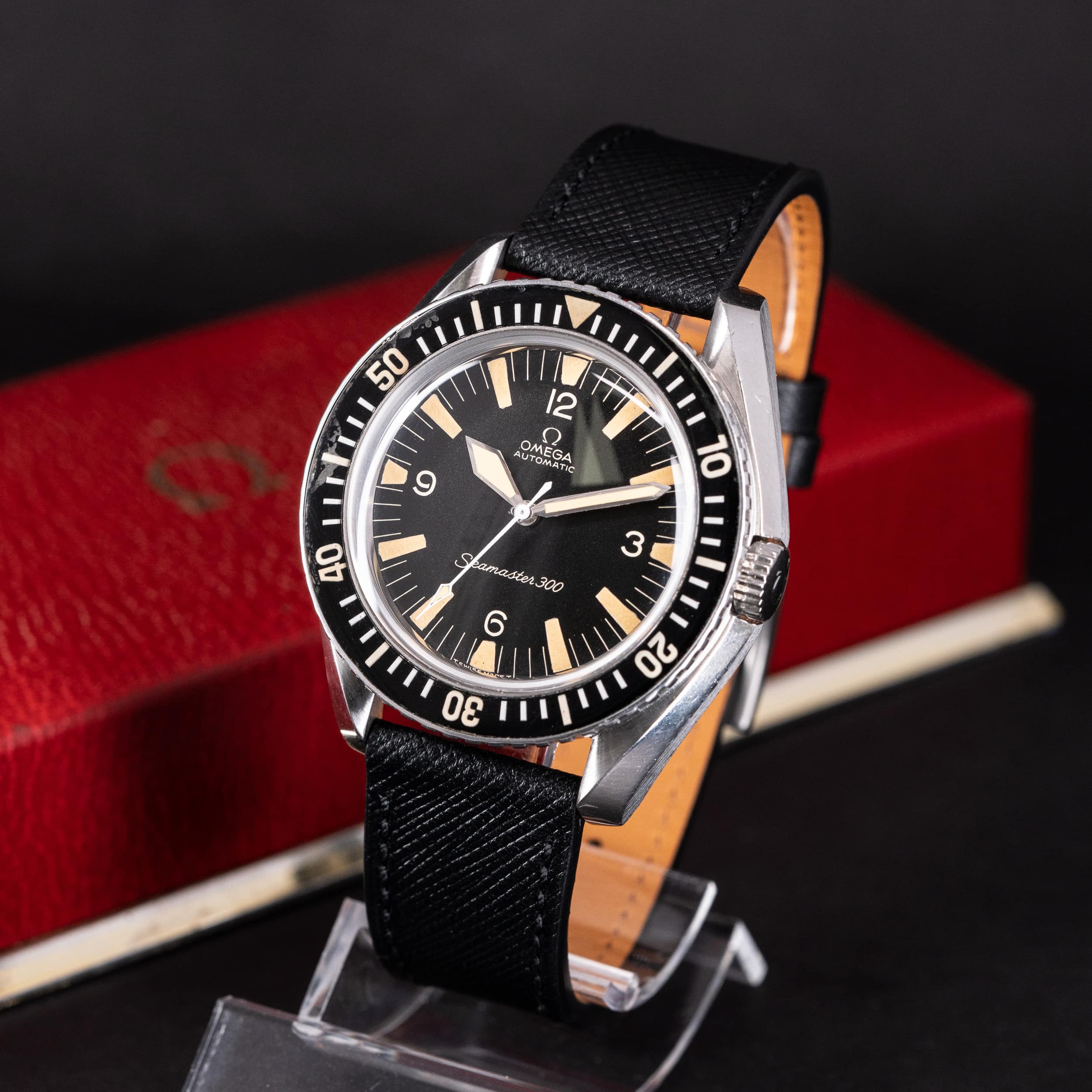 Hyväkuntoinen Omega Seamaster 300 Automatic sukeltajankello ref. 165.024. Sarjanumeron 2470xxxx mukainen valmistuvuosi on 1966.