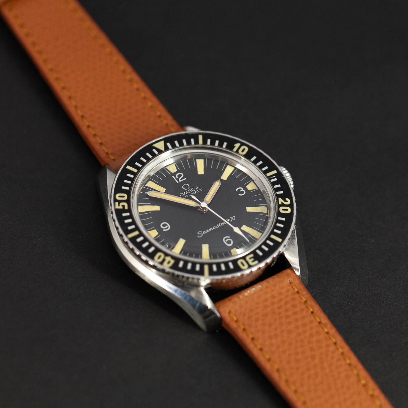 Omega Seamaster 300 sukeltajankello vuodelta 1964. Ref. 165.024-64 S.C. Täysin alkuperäinen ja juuri kunnostettu yksilö. Harvinaisen kauniisti ikääntynyt tritium kellotaulu ja osoittimet. Alkuperäinen bezel. Kuorta ei ole hiottu/kiillotettu. Kuoren koko on 42mm. Italailainen käsin ommeltu nahkaranneke.