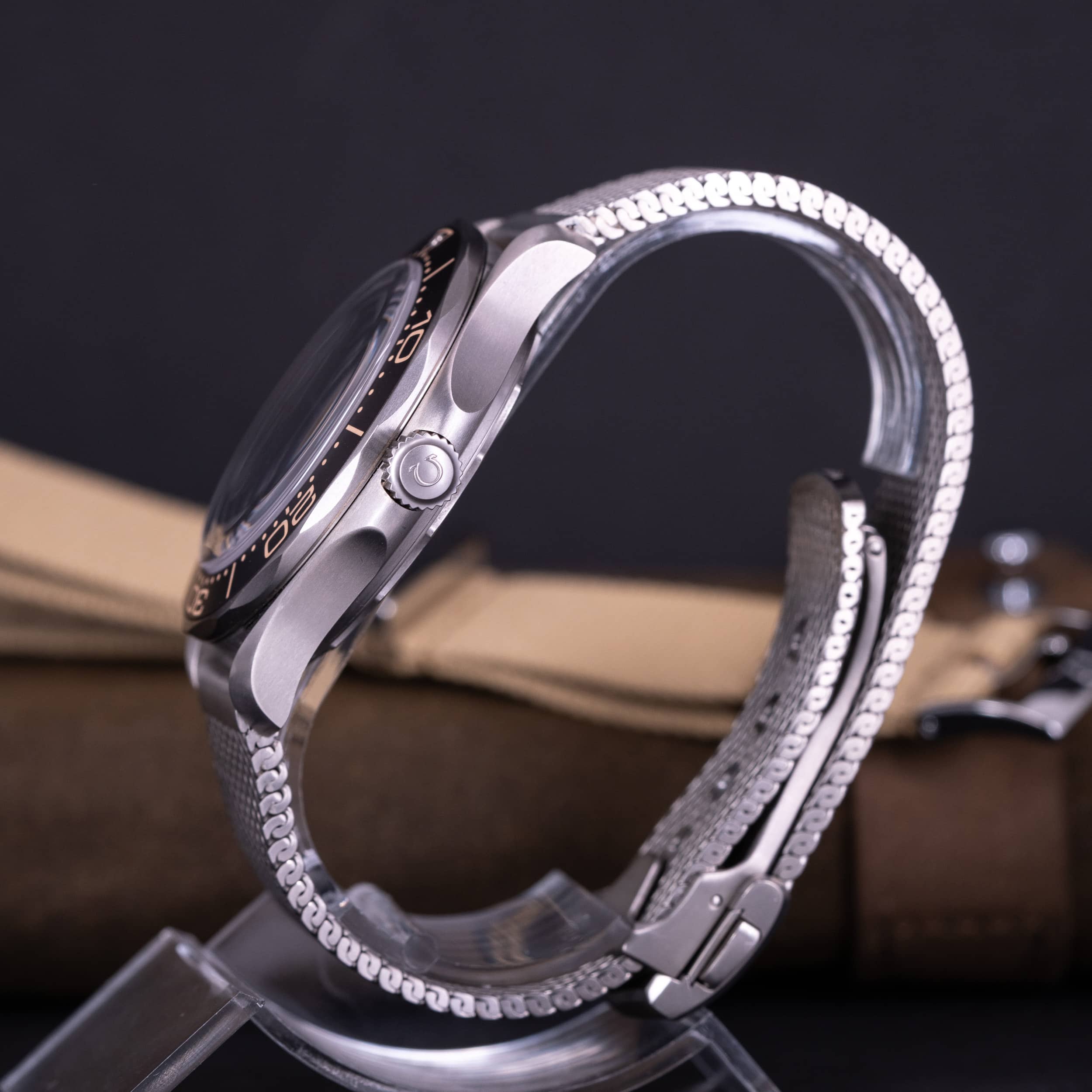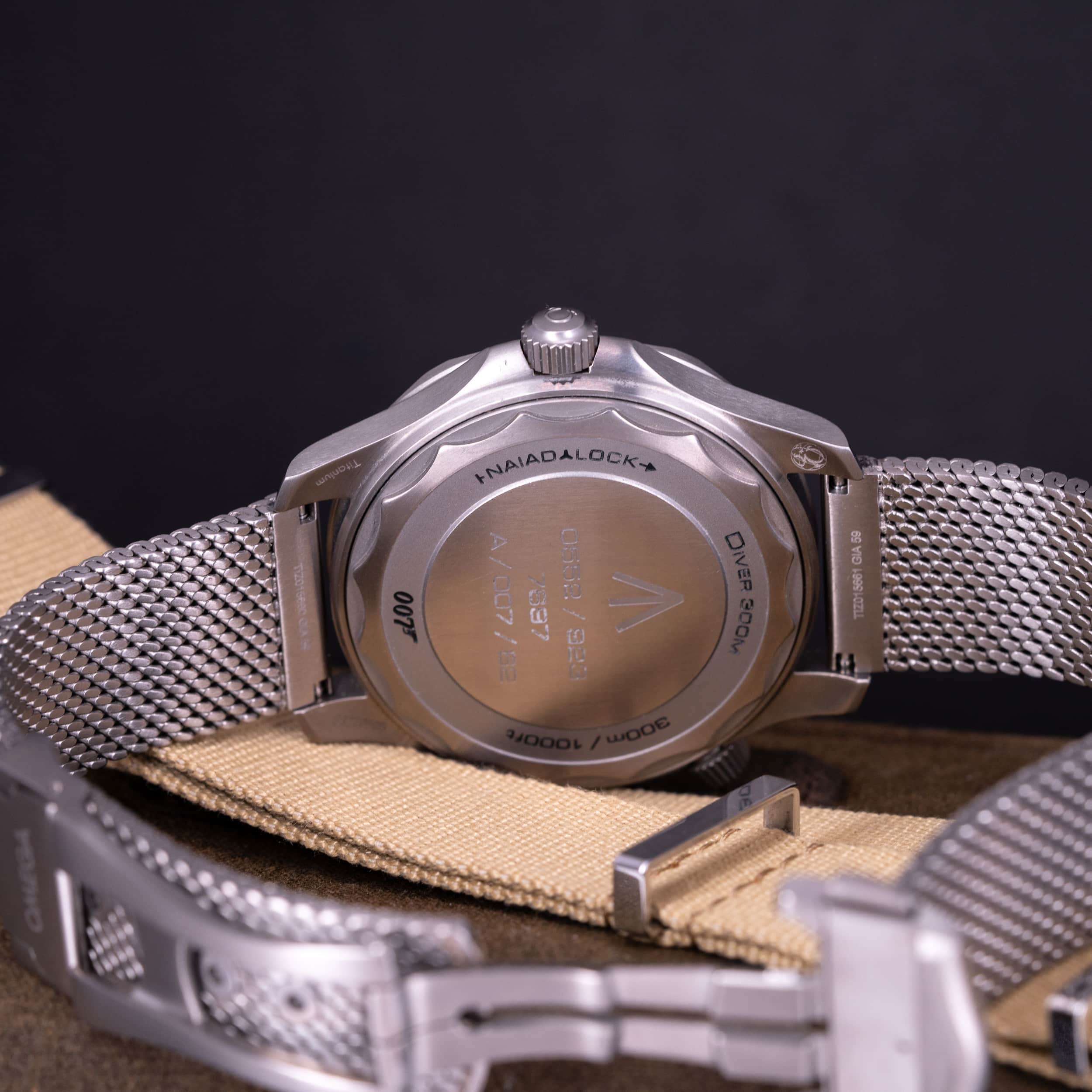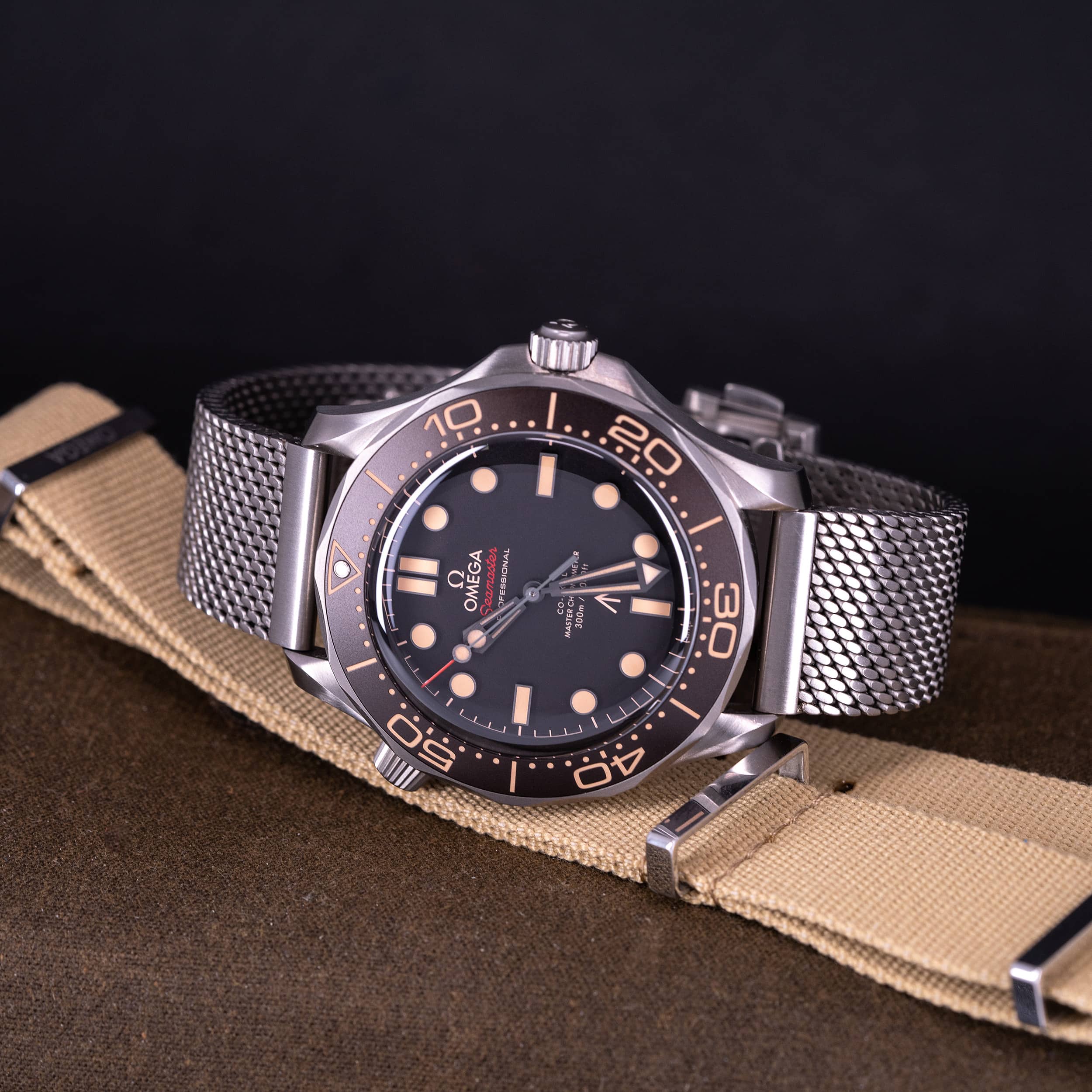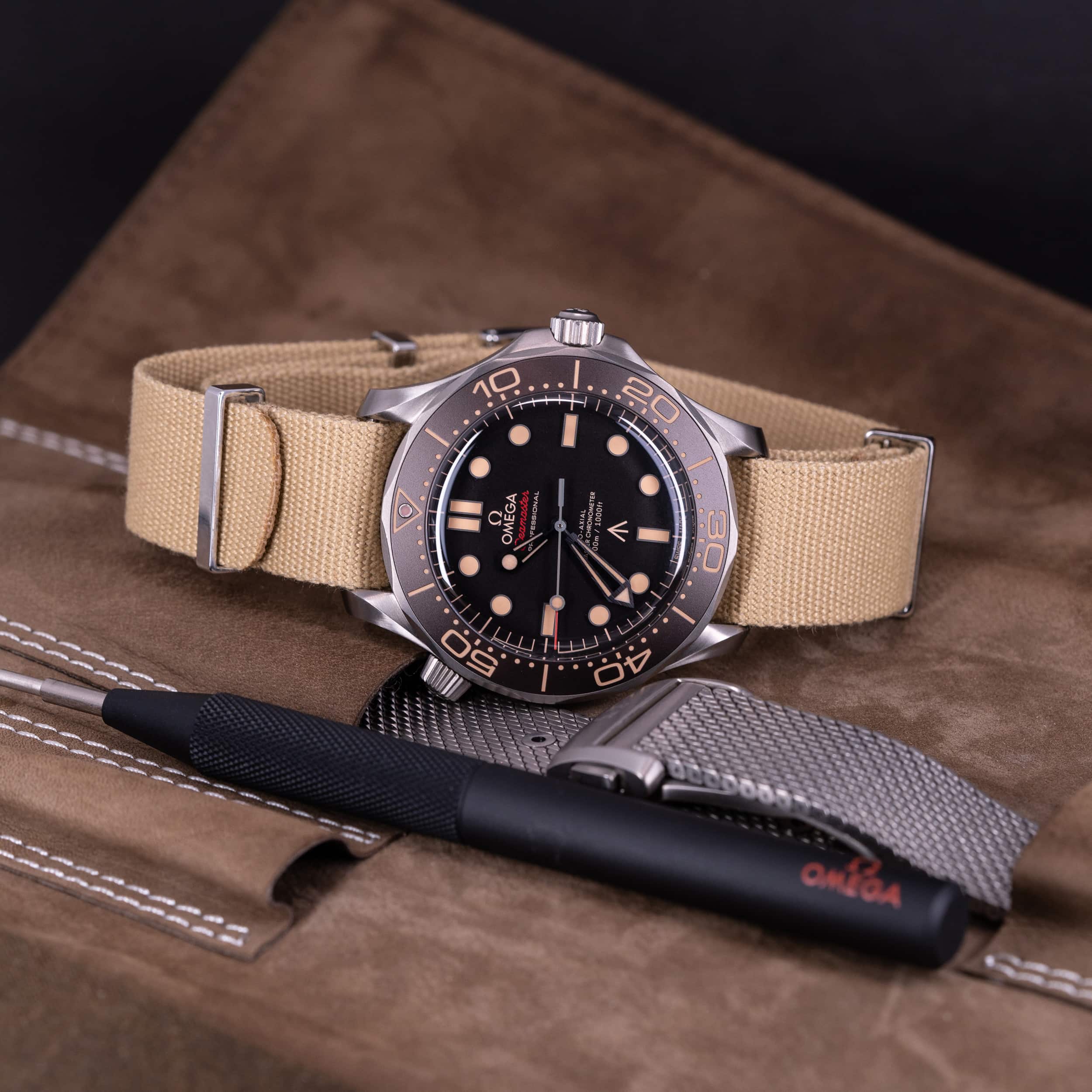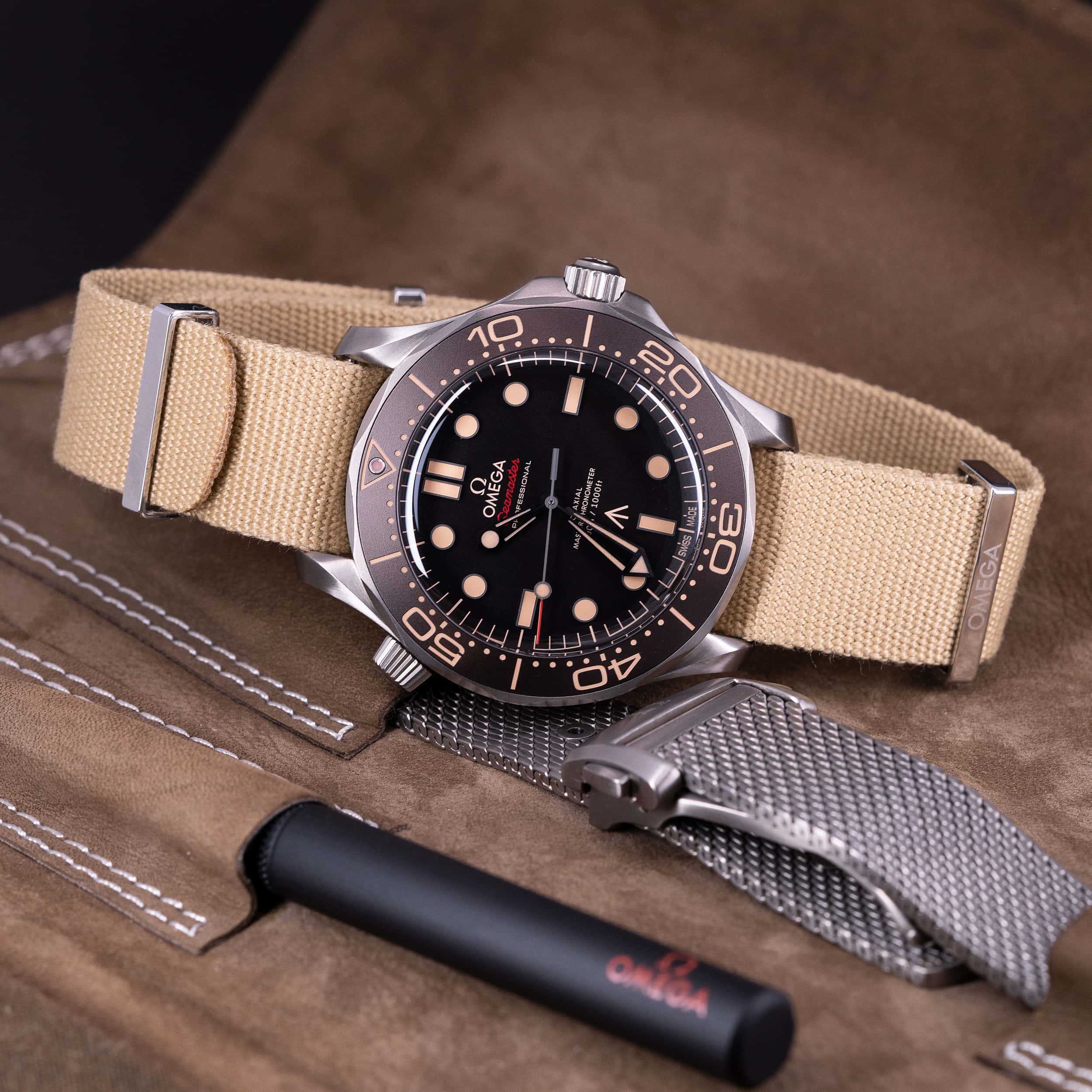 Kello toimitetaan mallin alkuperäisellä Omegan titaaniranteella sekä Omegan uudella NATO-ranteella.