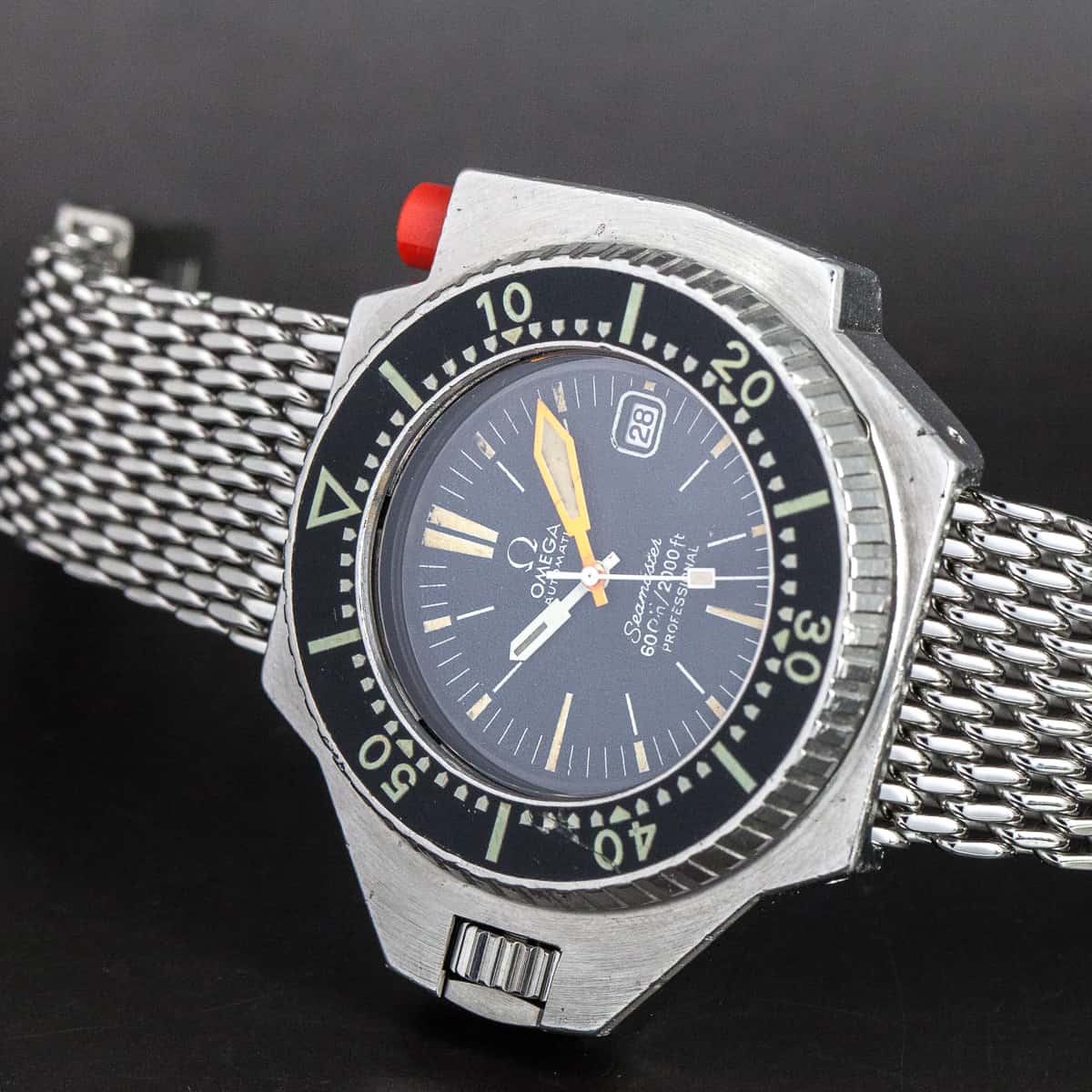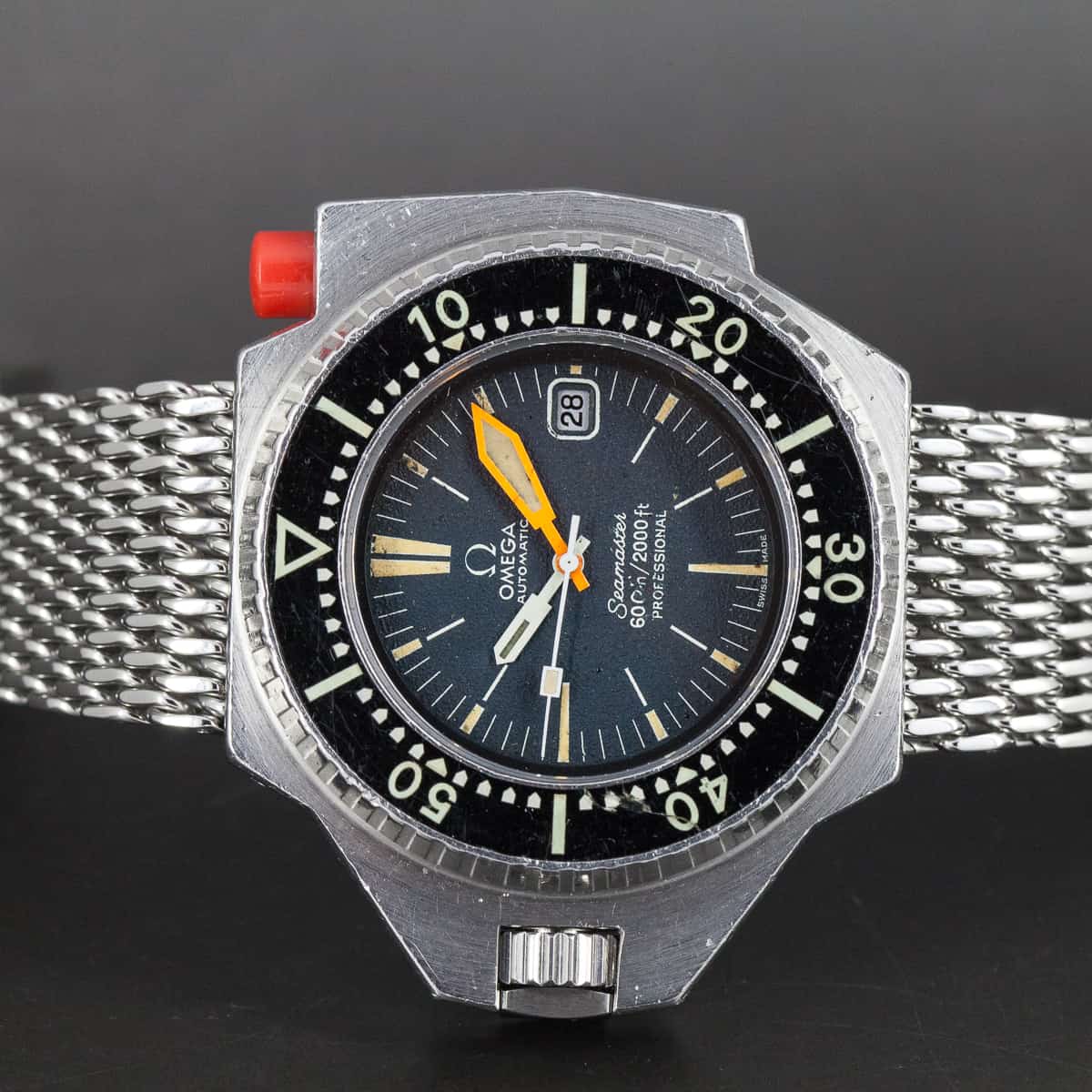 Omega Seamaster 600 Automatic ”Plo-Prof” ref.166.077. Tämä ammattisukeltajan kello (Plo Prof, Plongeurs Professionel) malli on valmistettu koneiston sarjanumeron mukaan vuonna 1970. Kellossa on alkuperäinen syvän sininen nk. 3A tritium-kellotaulu, alkuperäiset tritium osoittimet ja alkuperäinen lasisarja.