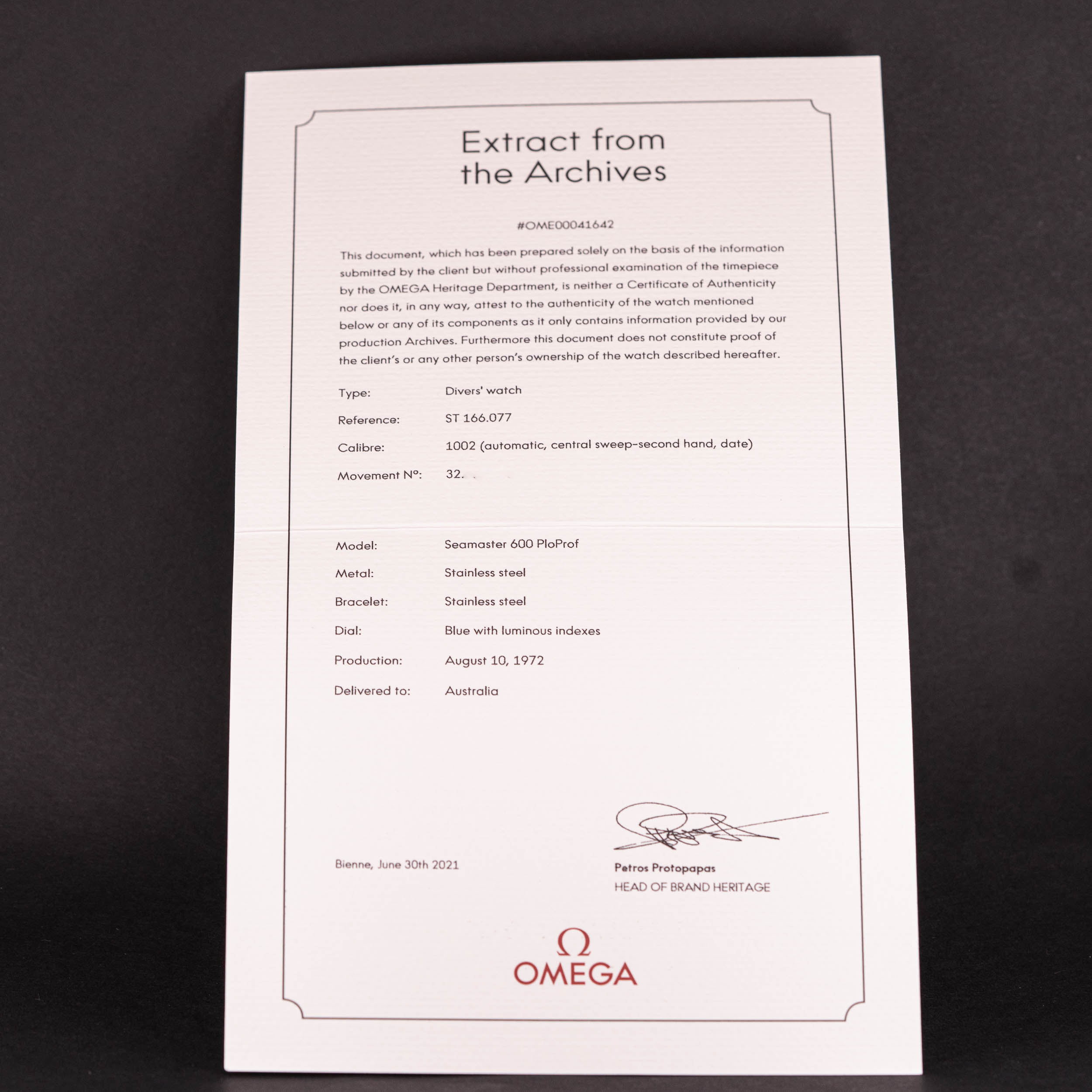 Tämä ammattisukeltajan kello (Plo Prof, Plongeurs Professionel) malli on valmistettu Omegan Extract from Archives todistuksen mukaan 1972 ja toimitettu Australiaan.