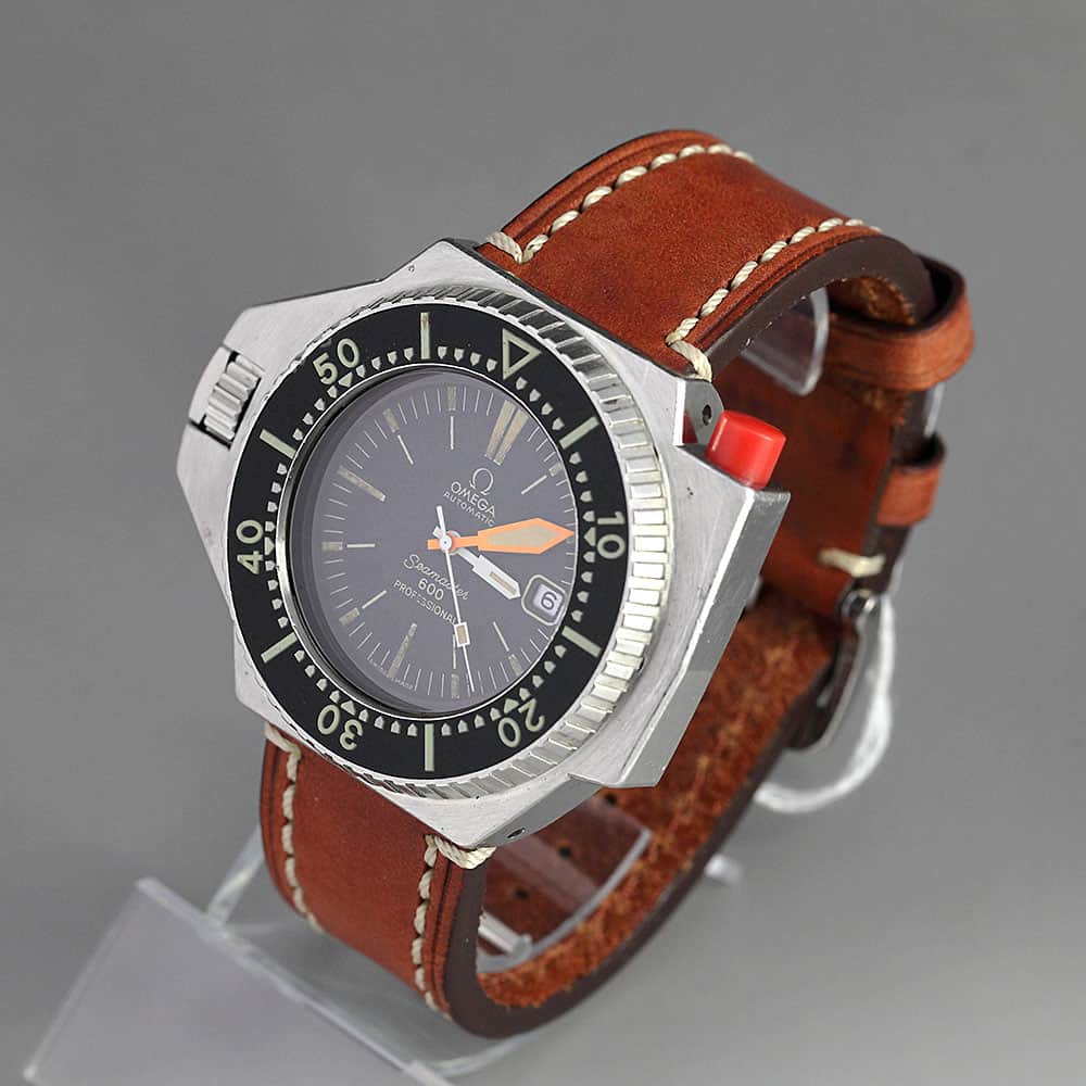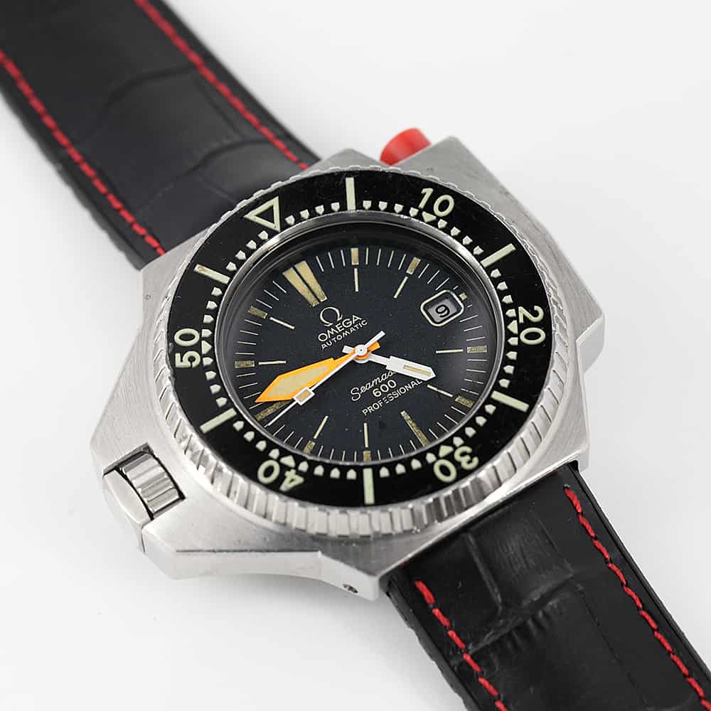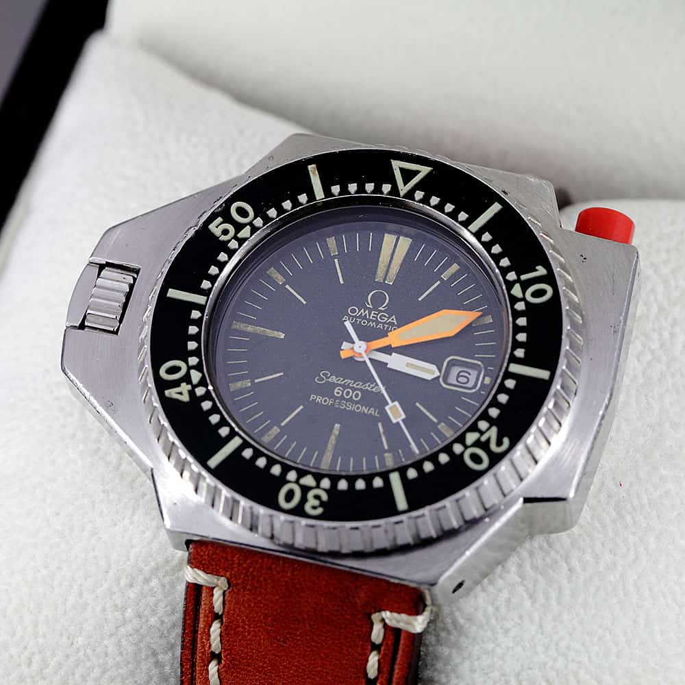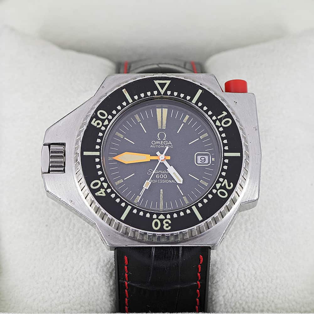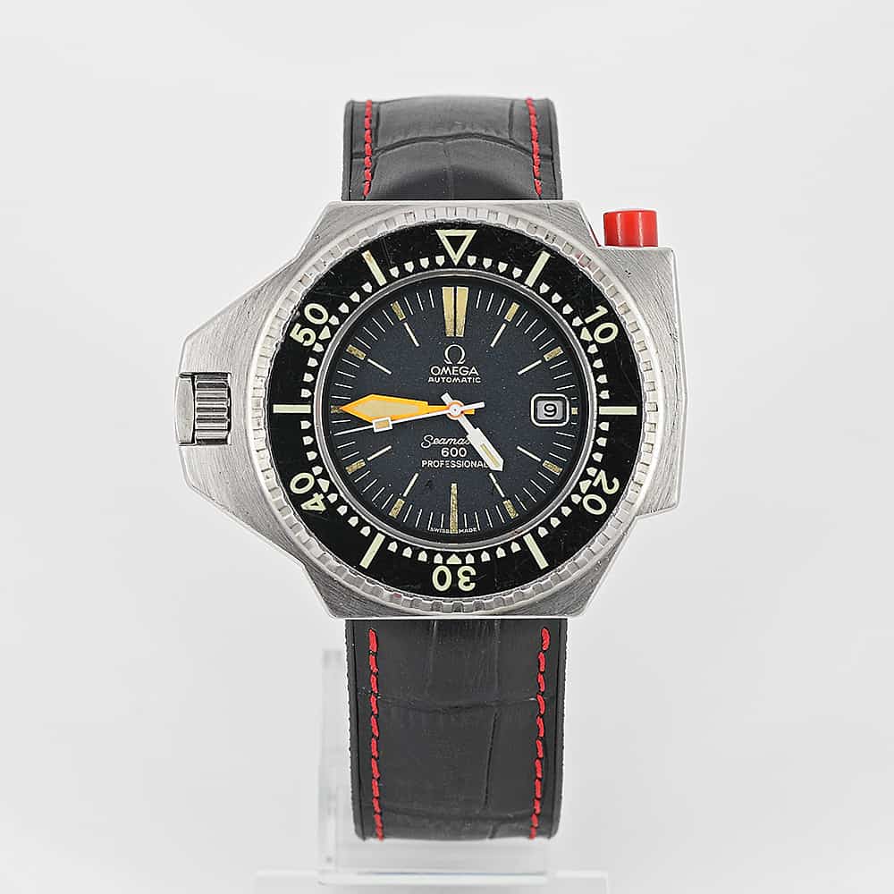 Hyvin harvinainen ja alkuperäinen ensimmäinen versio Omega Seamaster 600 sukeltajan kellosta. Tämä ref. 166.077, nk. Plo Prof (Plongeurs Professionel) malli on valmistettu n.1970. Kellossa on alkuperäinen ja ensimmäinen versio kellotaulu-osoitin-bezel kokonaisuudesta. Kellotaulu on ikääntynyt hienosti kuten myös bezel ja osoittimet.