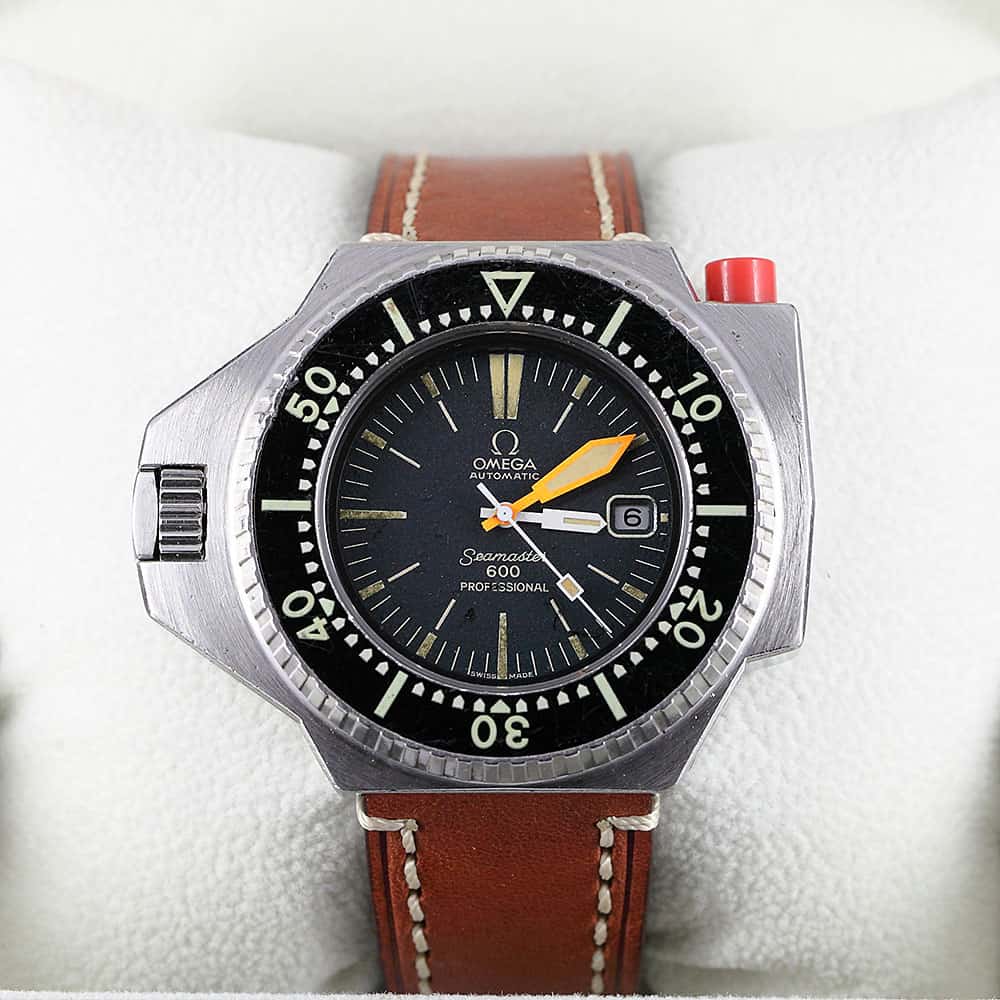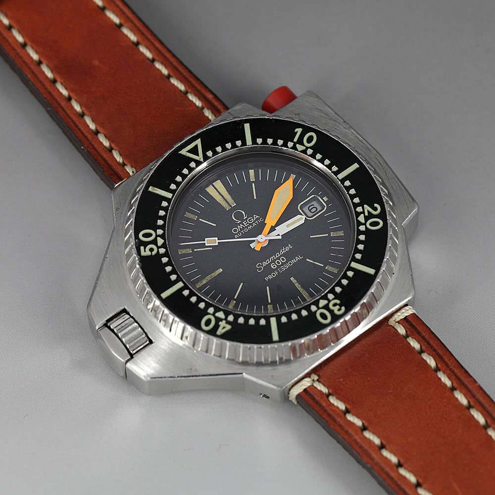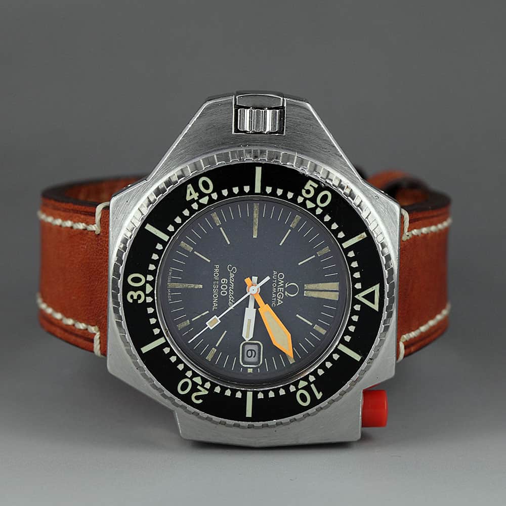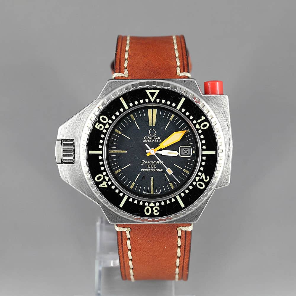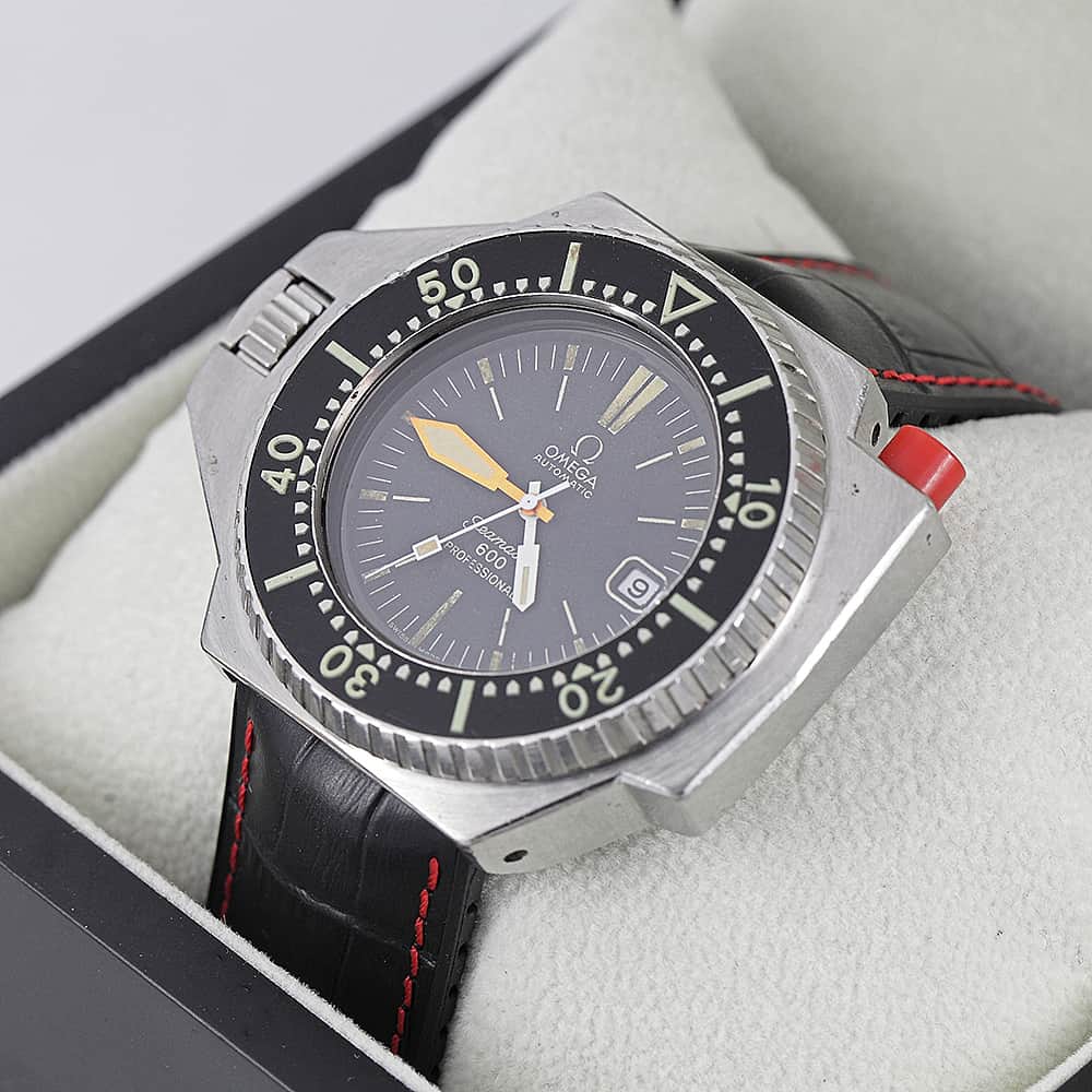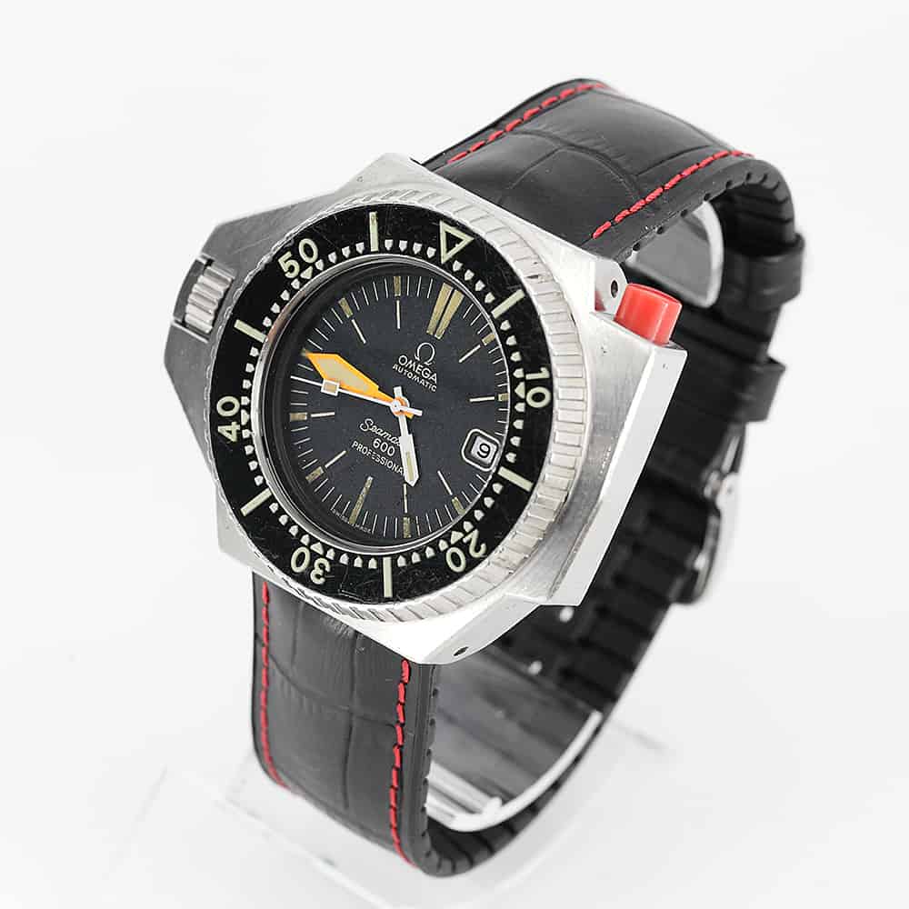 Hyvin harvinainen ja alkuperäinen ensimmäinen versio Omega Seamaster 600 sukeltajan kellosta. Tämä ref. 166.077, nk. Plo Prof (Plongeurs Professionel) malli on valmistettu n.1970. Kellossa on alkuperäinen ja ensimmäinen versio kellotaulu-osoitin-bezel kokonaisuudesta. Kellotaulu on ikääntynyt hienosti kuten myös bezel ja osoittimet.