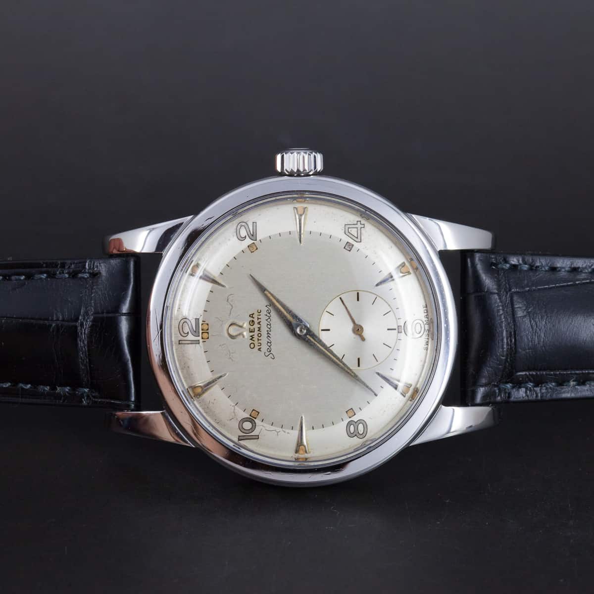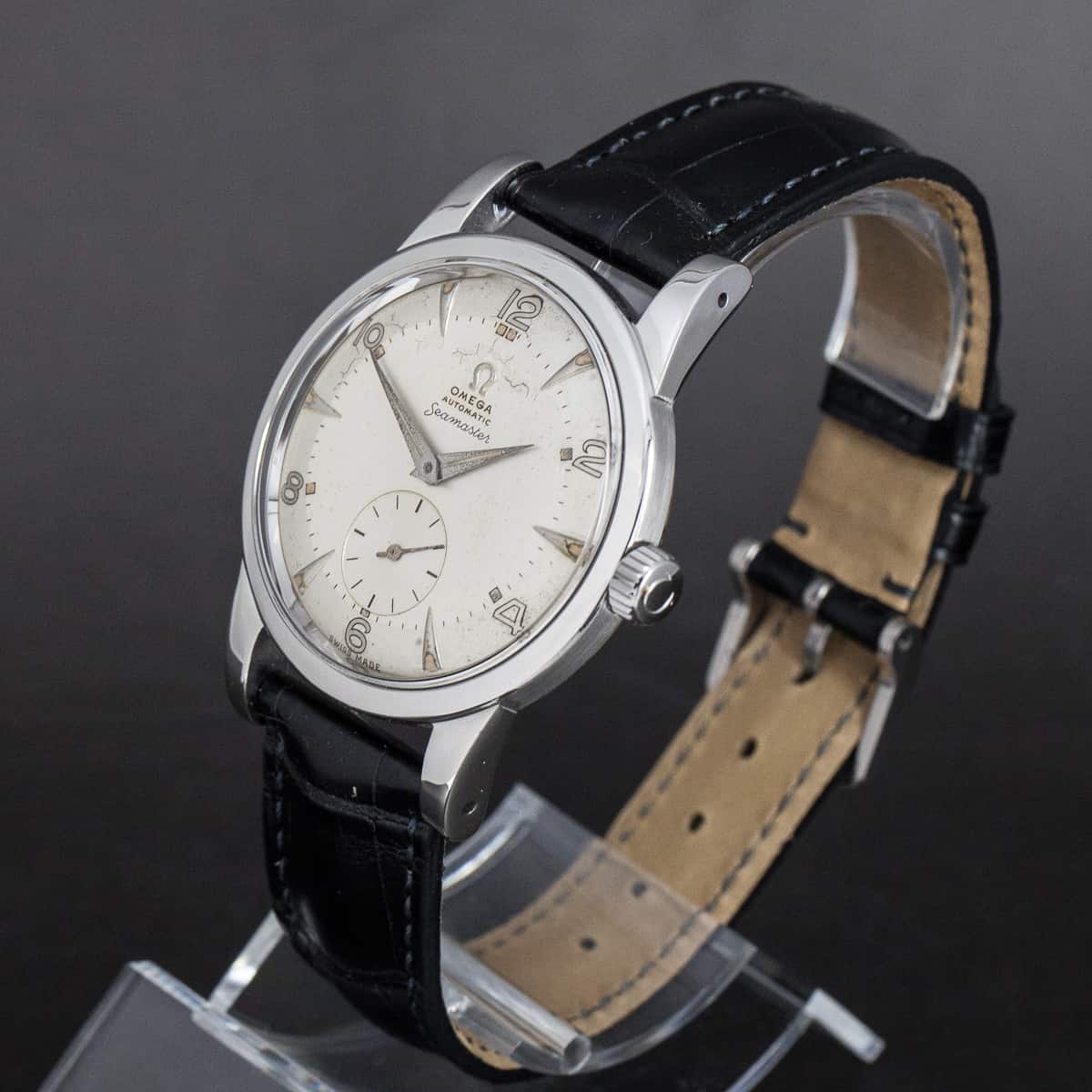 Teräskuorinen Omega Seamaster Automatic pukukello vuodelta 1950. Ref.2493. Kellon koneisto on Omegan ensimmäinen vasara-automaatti cal. 332. Juuri täysin kunnostettu kokonaisuus. Kuoren koko 36mm. Alkuperäinen hienosti ikääntynyt kellotaulu ja osoittimet. Kuori on erittäin hienossa kunnossa.Ranneke on Hirsch London Alligator 18-14 ranneke.