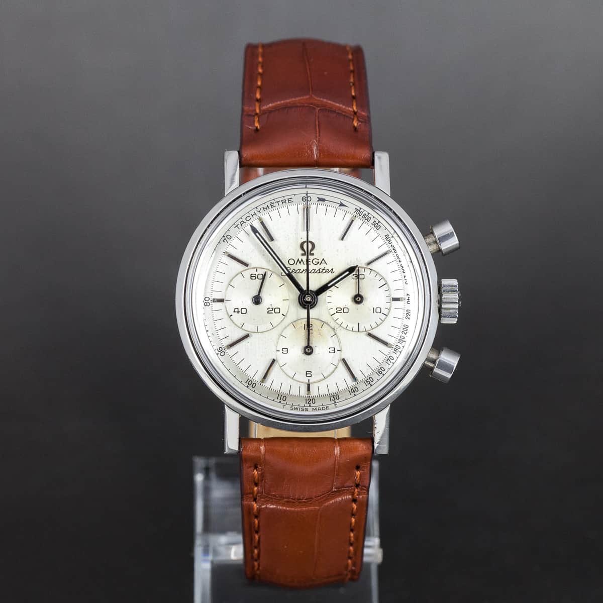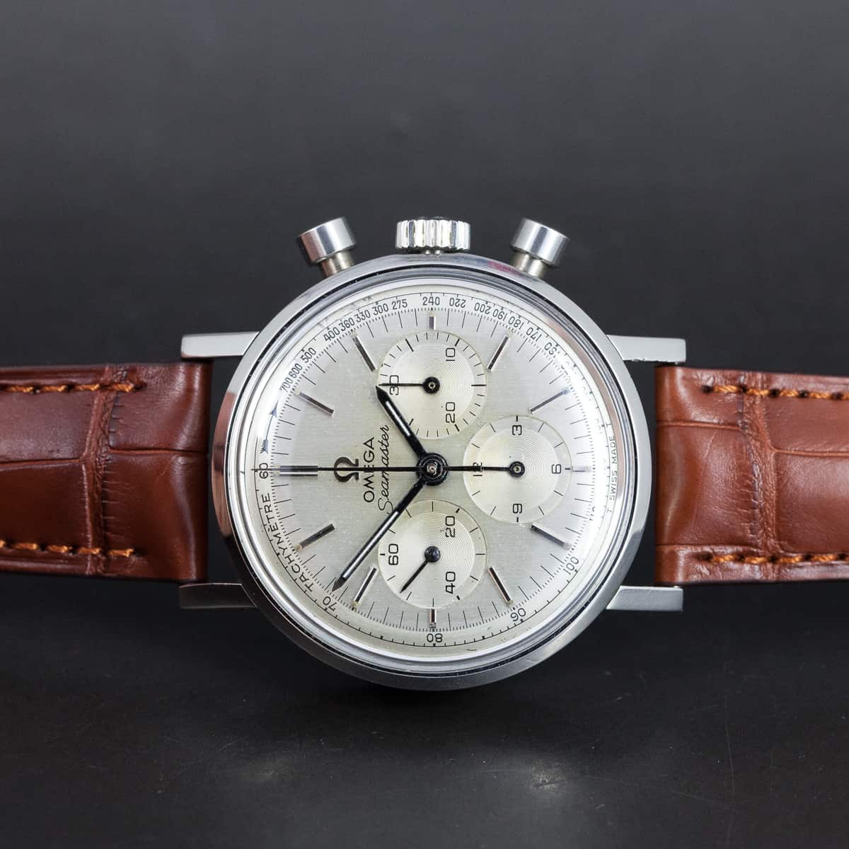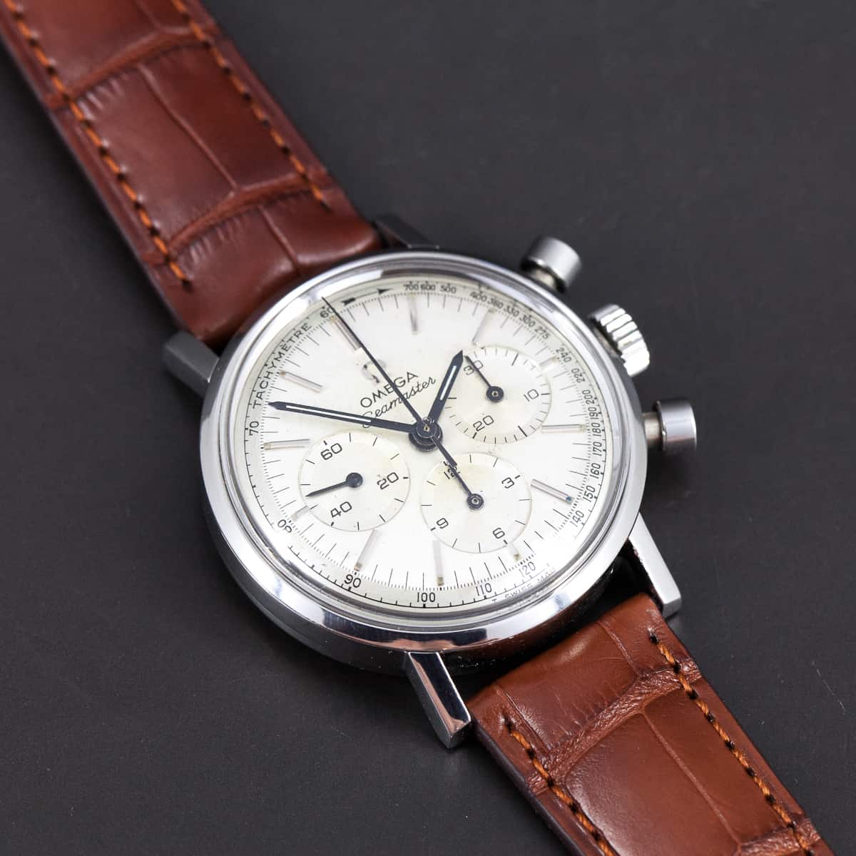 Harvinainen Omega Seamaster kronografi ref.105.005-65 vuodelta 1965. Omegan cal.321 kronografikoneisto on juuri täysin kunnostettu. Alkuperäinen kellotaulu ja osoittimet. Hirsch London Alligator nahkaranneke jossa on alkuperäinen Omegan terässolki. Kuoren koko on 35mm.
