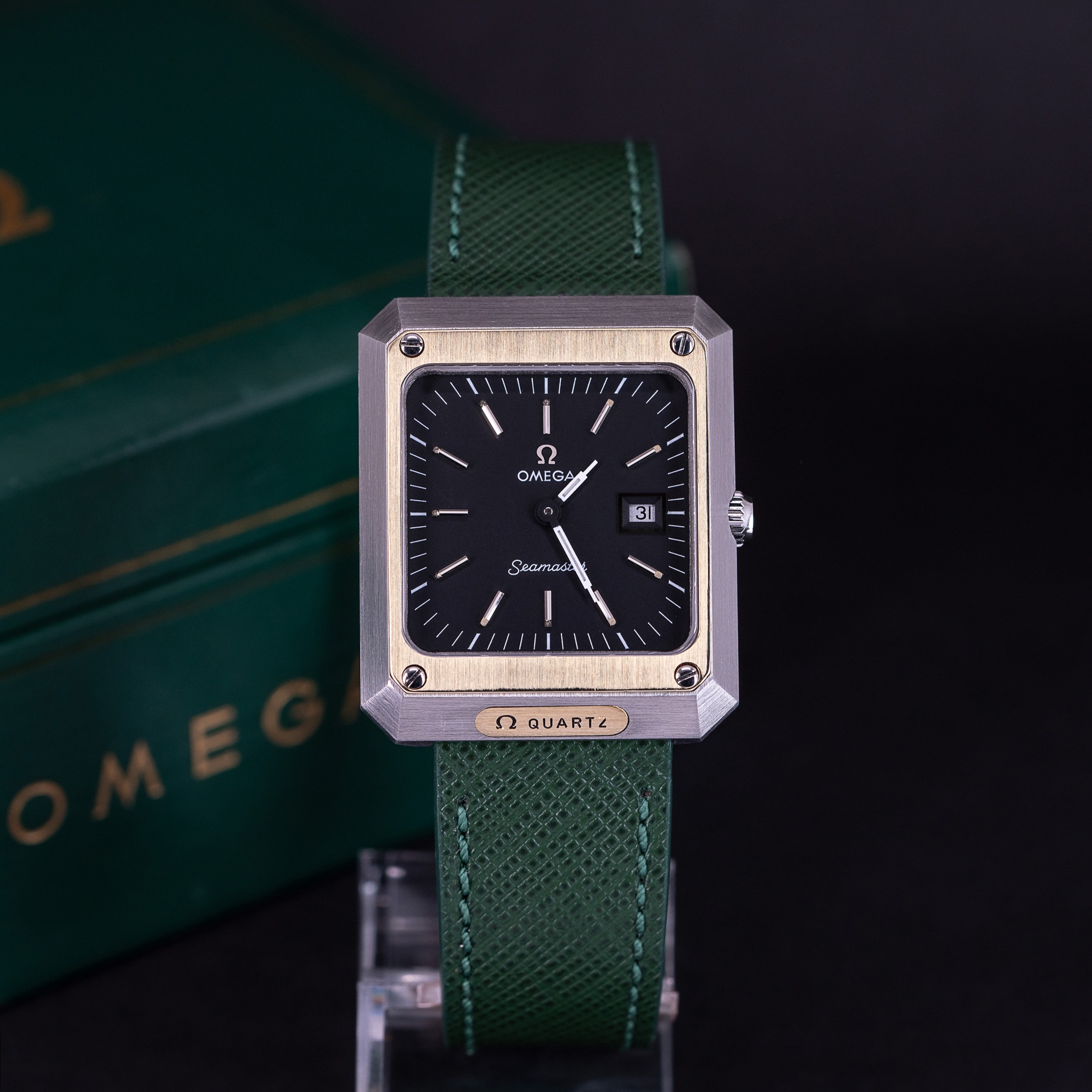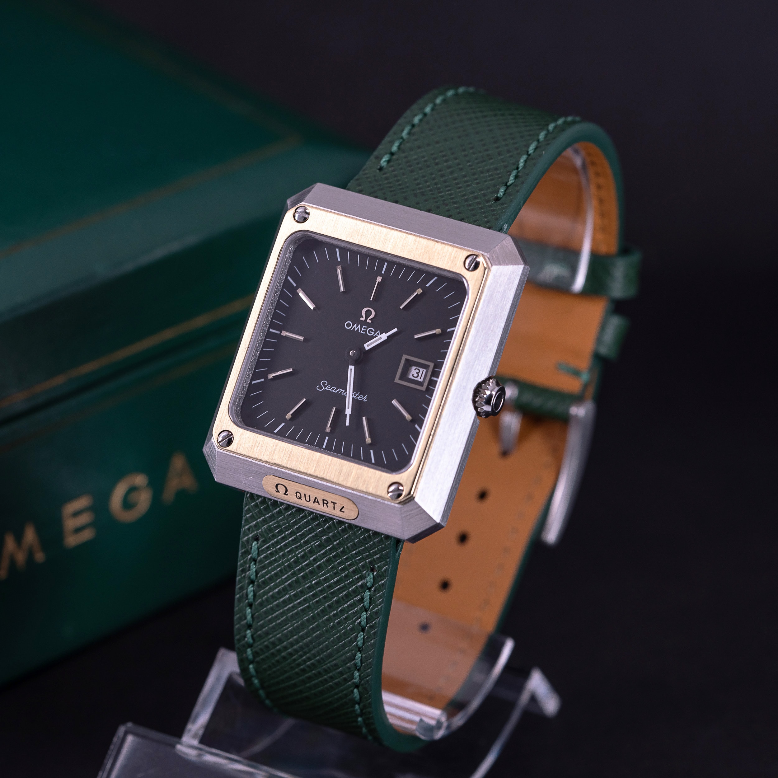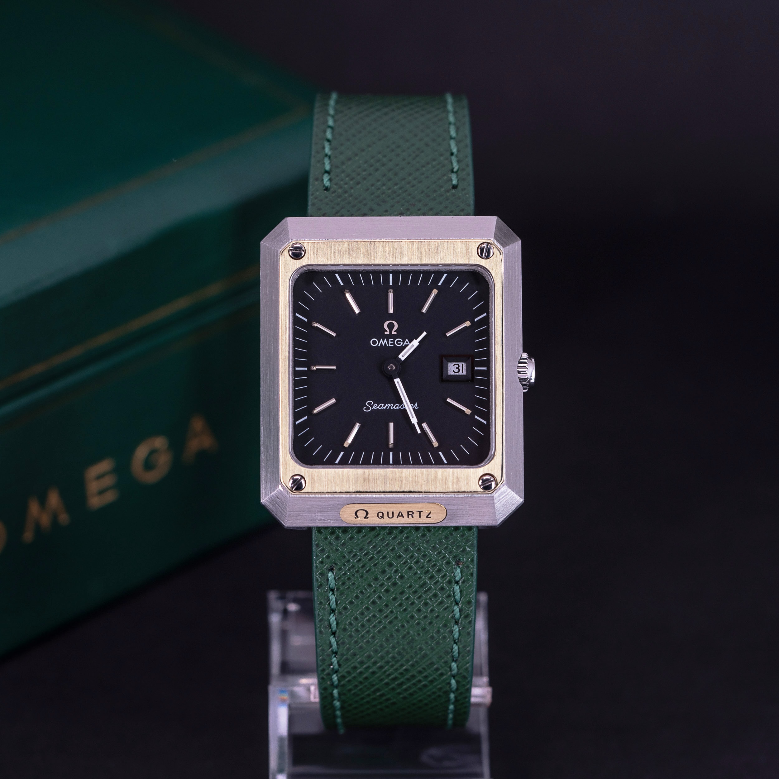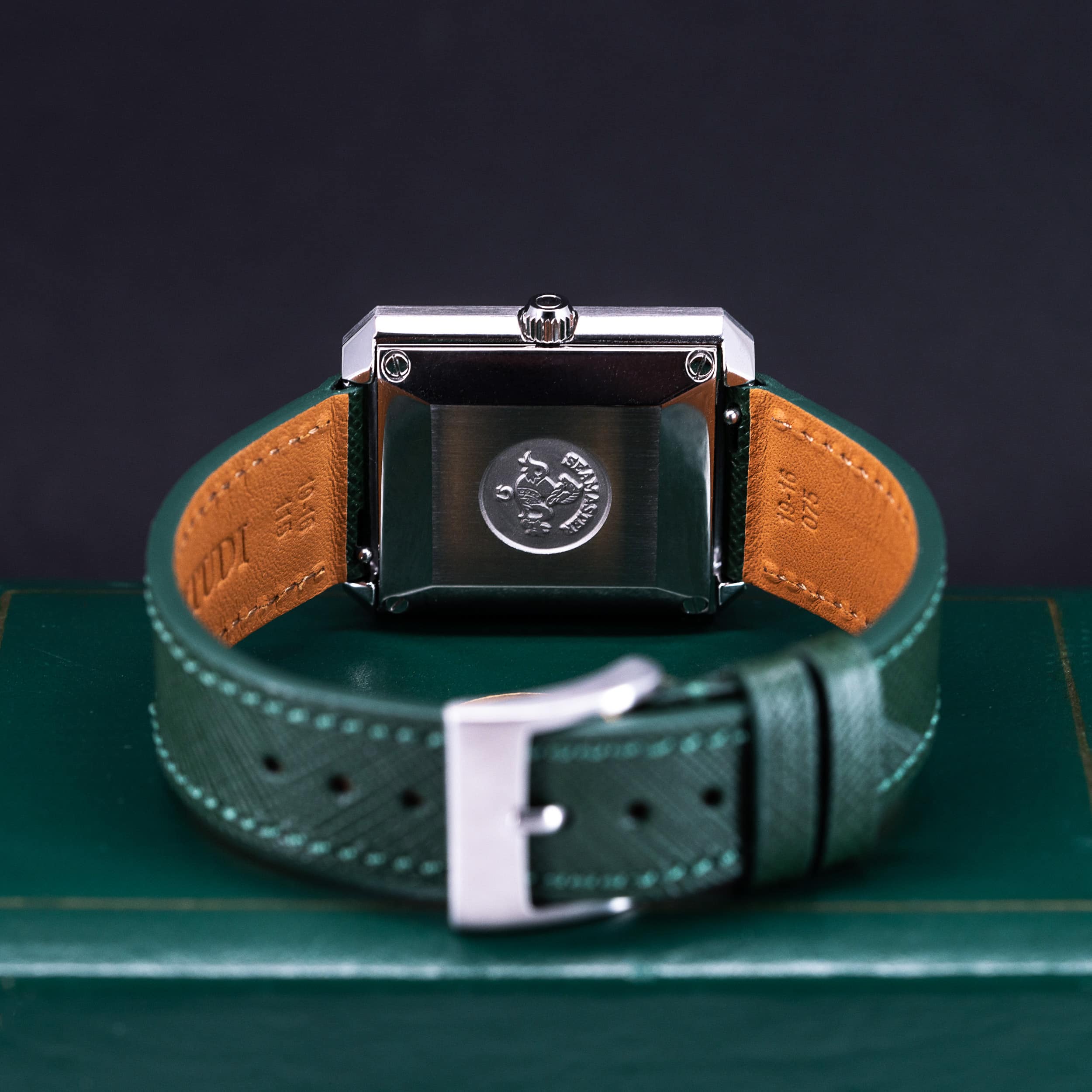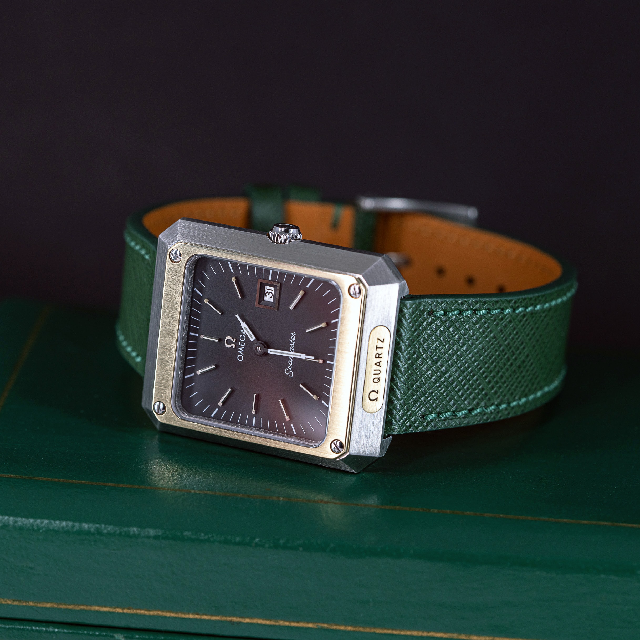 Kellon vihreä Saffiano -nahkaranneke on meidän omasta mallistosta. Kelloon voidaan pyynnöstä tilata myös Omegan teräsranneke.